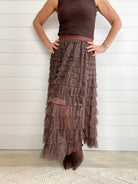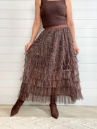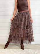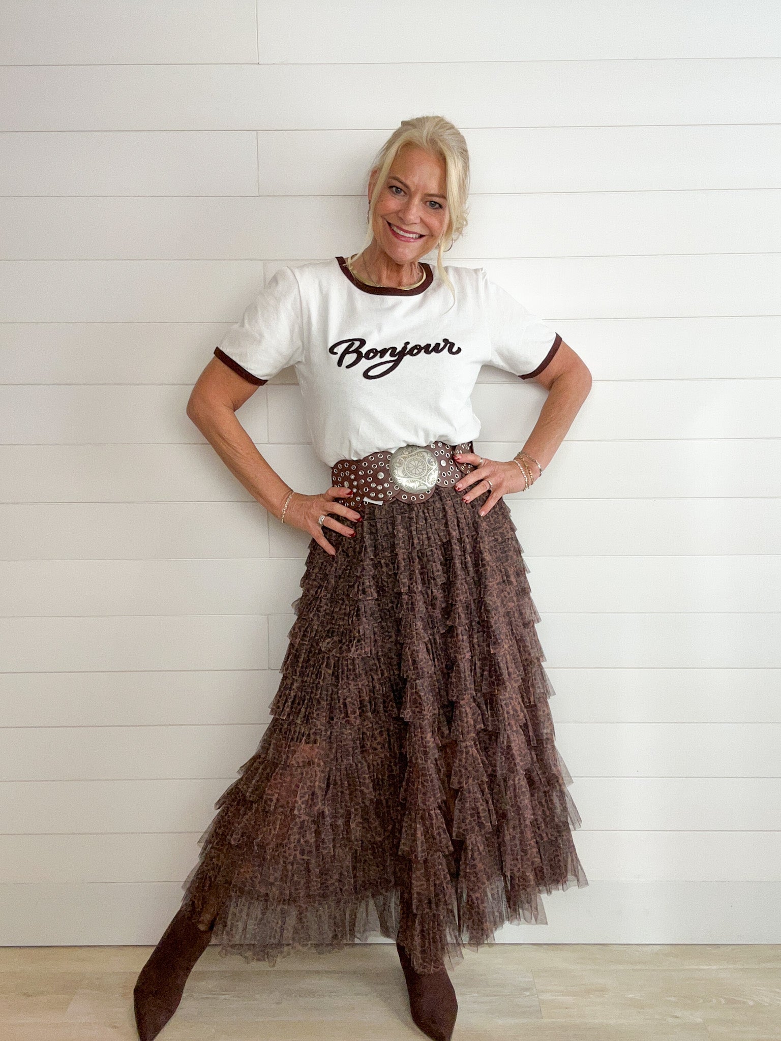 This layered mesh maxi skirt features an all-over animal-inspired print on tiered pleated tulle for soft volume and romantic movement. The structured waistband provides definition, while the sheer effect and asymmetrical hem add a touch of vintage drama. Lightweight yet full in silhouette, this skirt is perfect for boutique fall collections, styled with boots, knits, or feminine tops. Fabric Content: 100% Polyester (Printed Mesh)