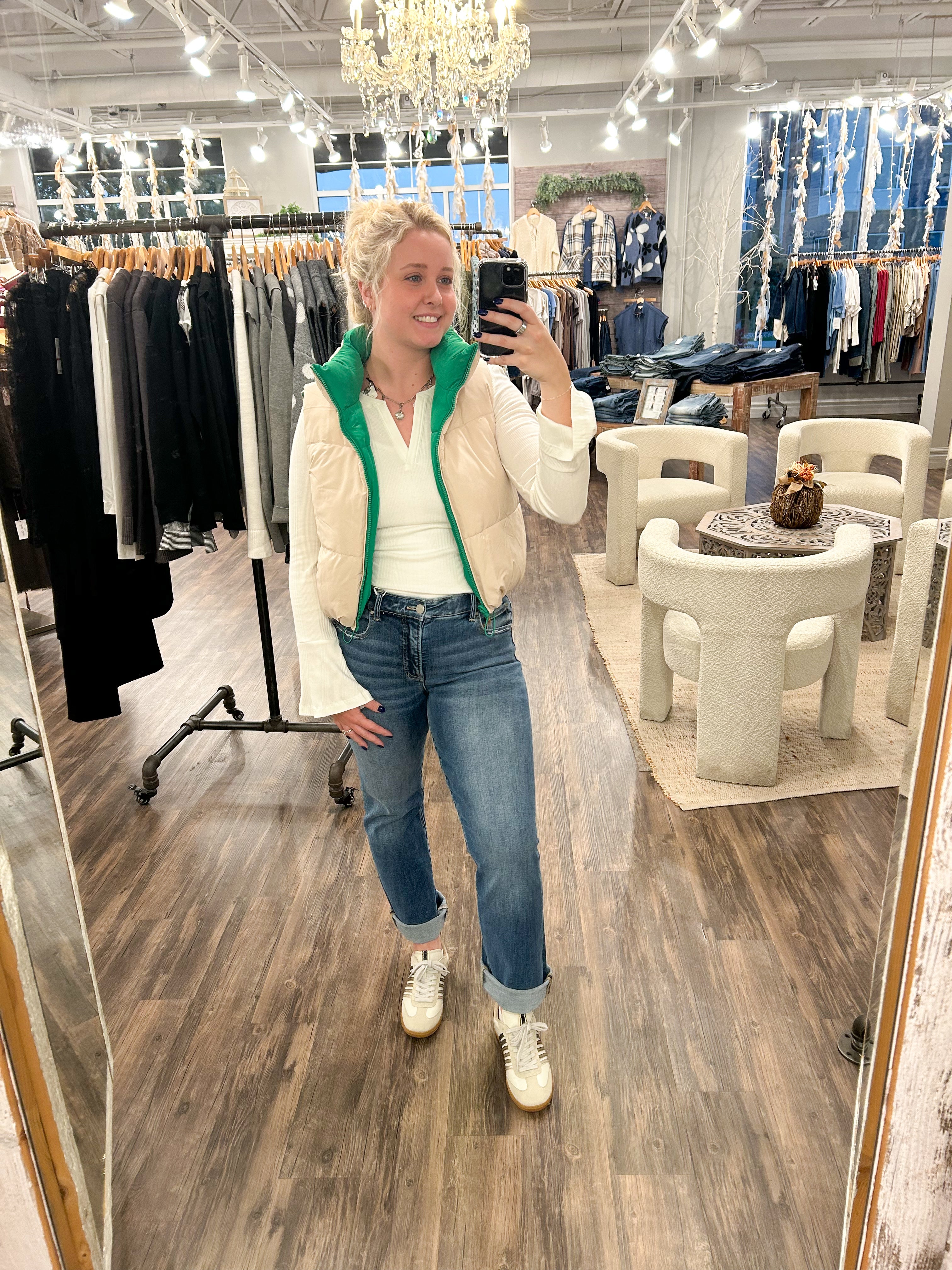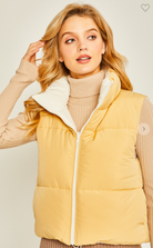 Why settle for one when you can have two? This reversible puffer vest flips from a bold solid color to soft cream, giving you double the styling options. The slightly cropped cut and high collar add a modern, sporty touch—perfect for layering over hoodies, knits, or long sleeves when the temps start to dip.