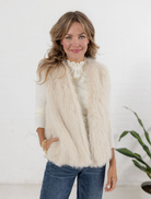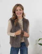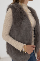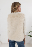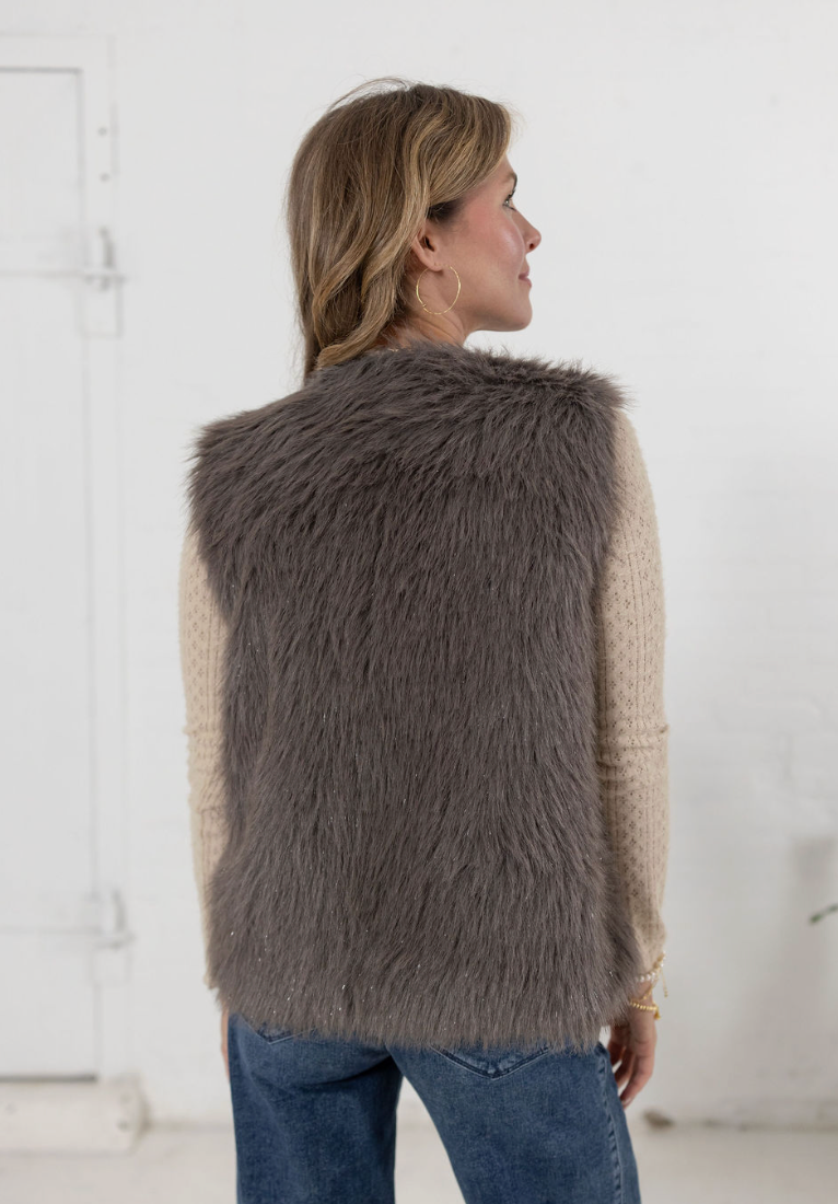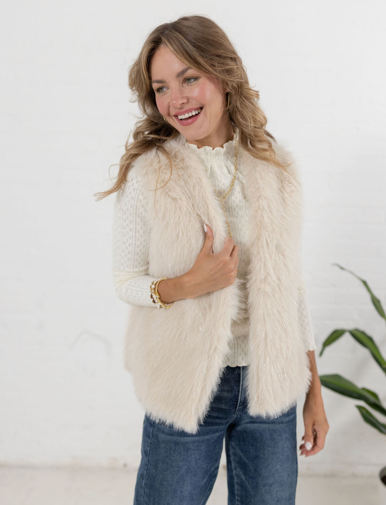 The Sparkling Faux Fur Vest adds instant glam to any look with its plush faux fur texture and just a touch of shimmer. Shredded tinsel is subtly woven throughout for a hint of sparkle that catches the light without going over the top.