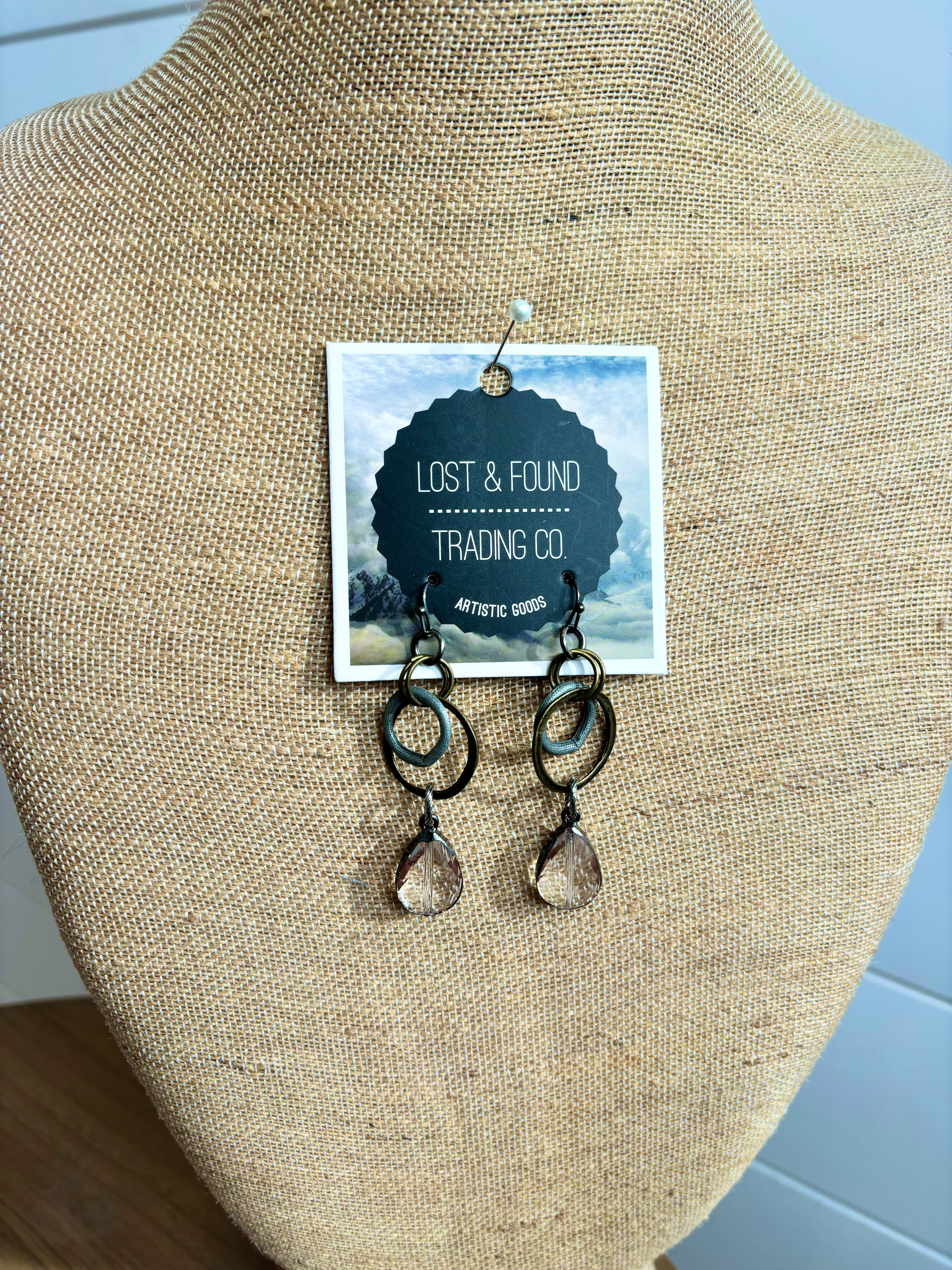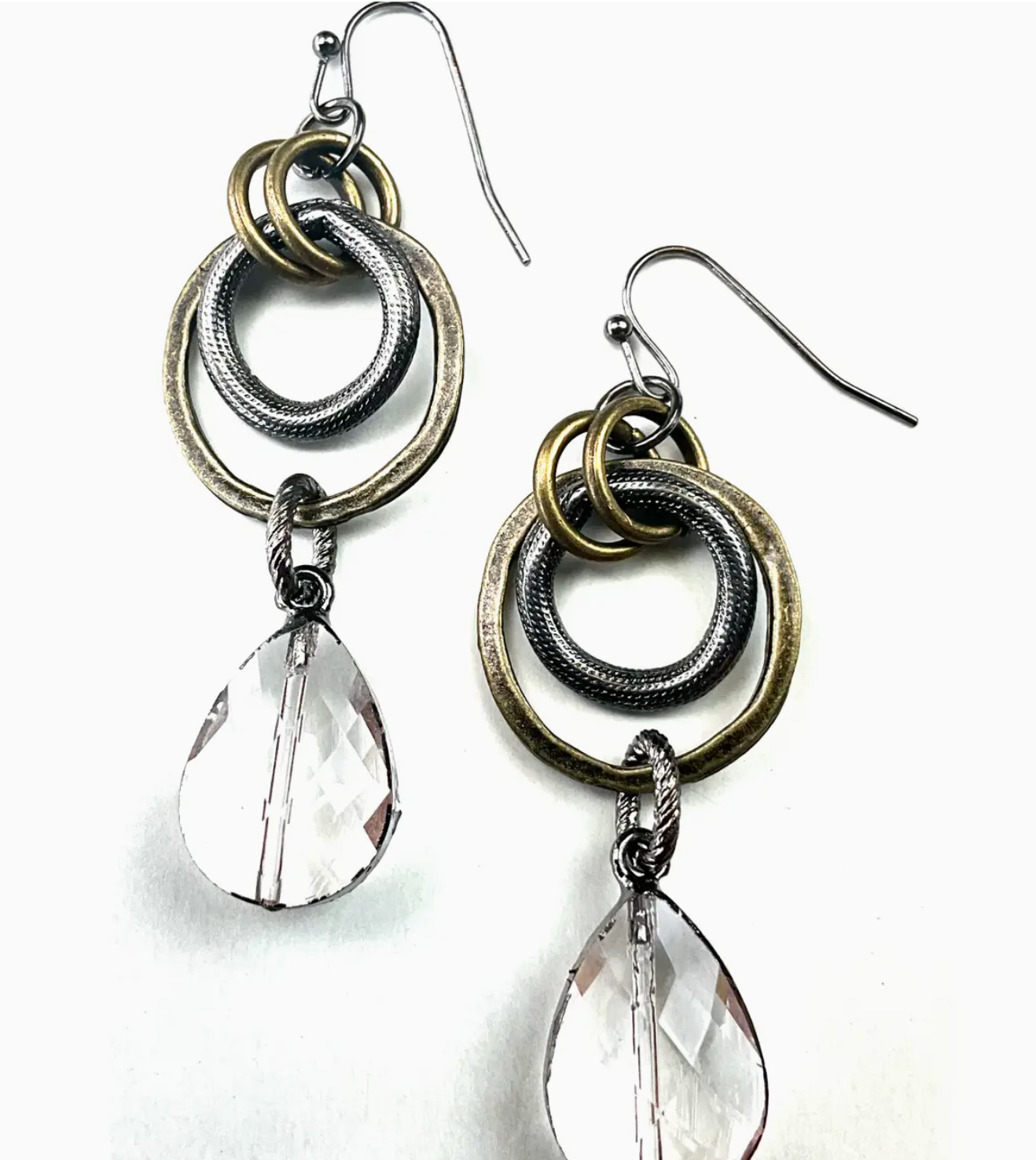 The Stacked Rings & Glass Teardrop Dangle Earrings are a sophisticated accessory, combining contemporary design with timeless elegance.