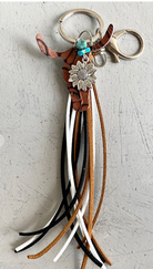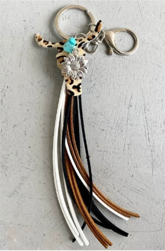 Add a little western flair wherever you go with this playful tassel keychain. Featuring a faux suede tassel, turquoise bead accents, a sunflower charm, and a genuine leather bull head silhouette, it’s the perfect mix of rustic and chic. Clip it onto your keys, handbag, or backpack for a fun pop of personality.