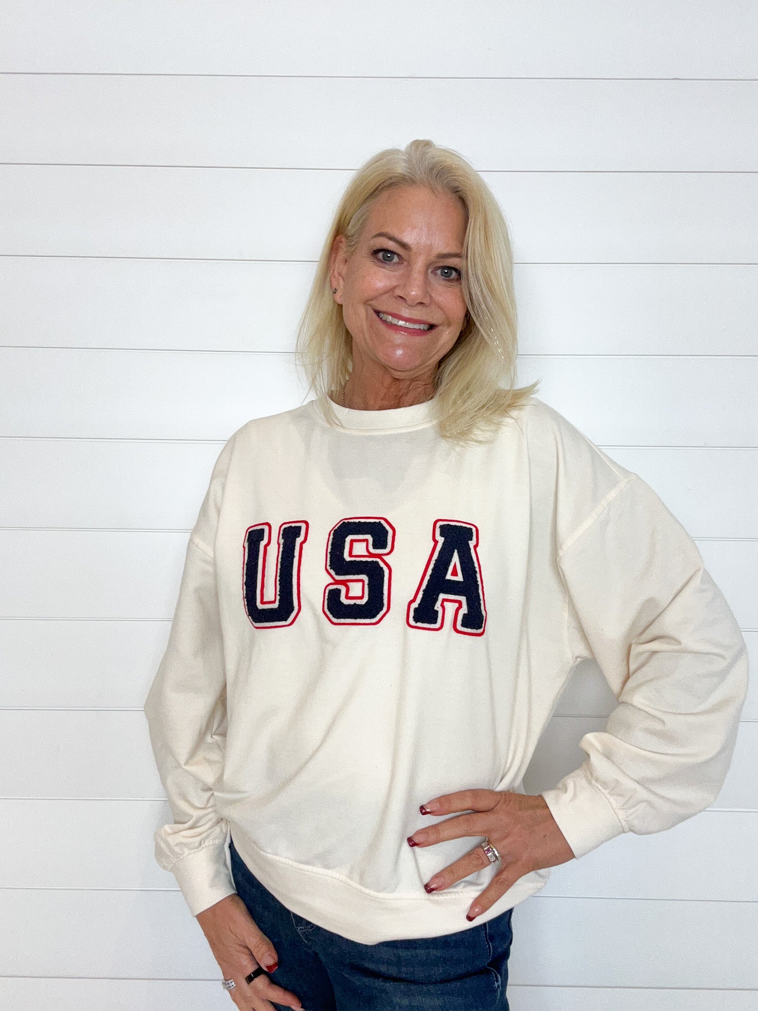 Show your stars-and-stripes spirit in the USA Varsity Knit Top — the perfect mix of sporty and cozy. With its relaxed fit, drop shoulders, and bold varsity lettering across the front, this easy pullover brings casual-cool vibes to any day of the week.