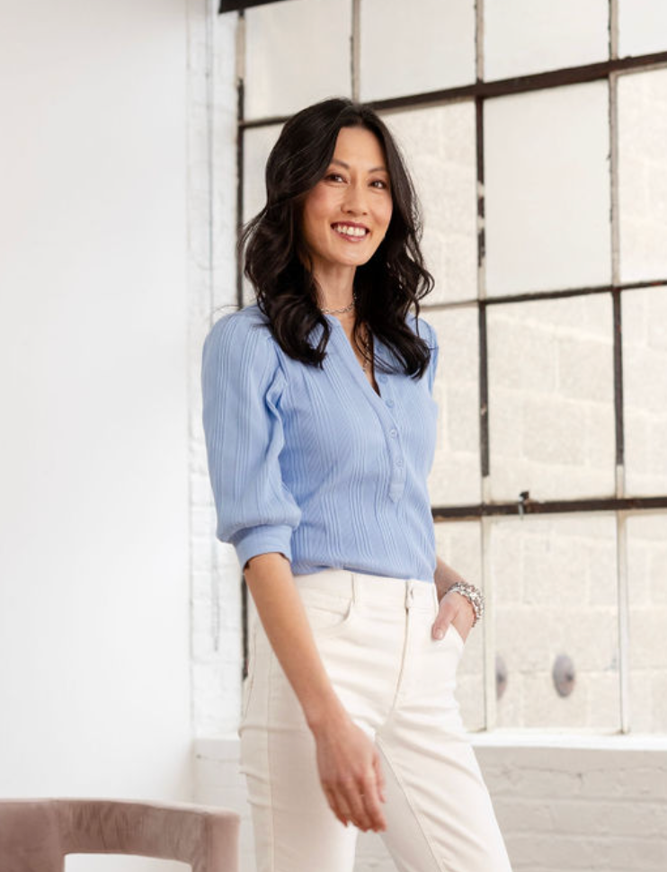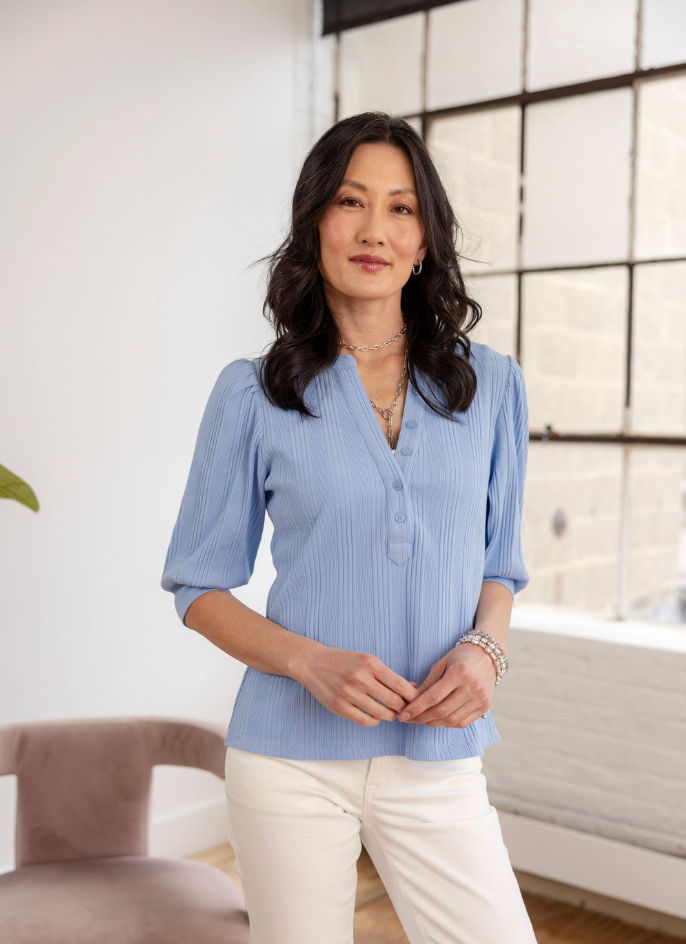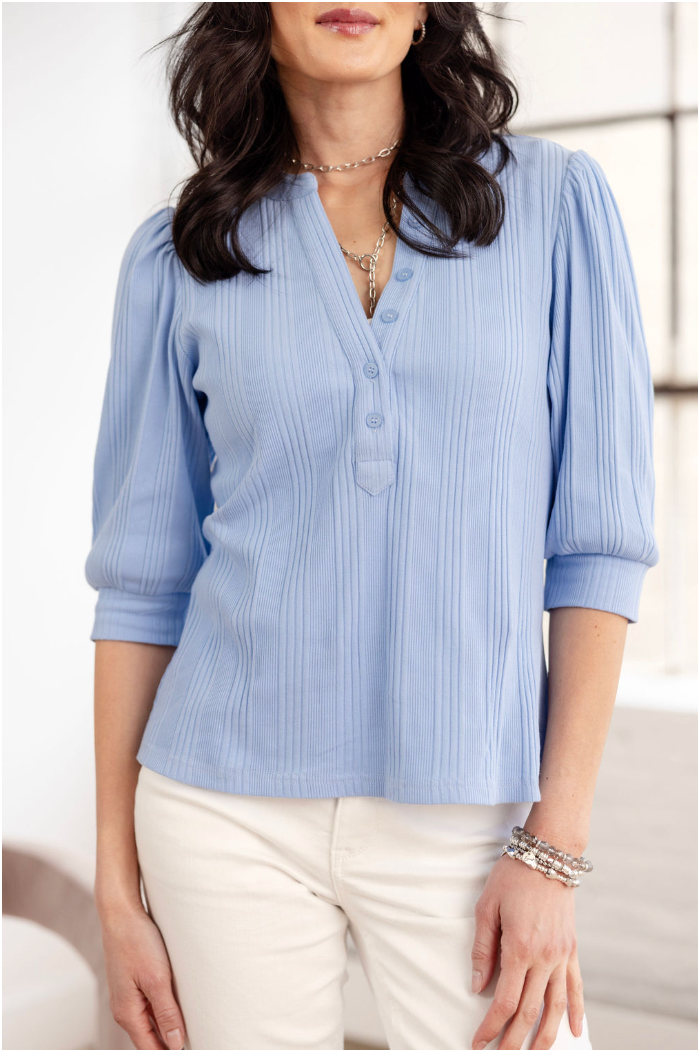 Upgrade your everyday essentials with the Mac and Me Button Front Elbow Sleeve Top. Featuring a flattering henley-style neckline and charming puff sleeves, this top blends feminine details with laid-back comfort. The variegated ribbing adds subtle texture, making it a standout piece for layering or wearing solo.