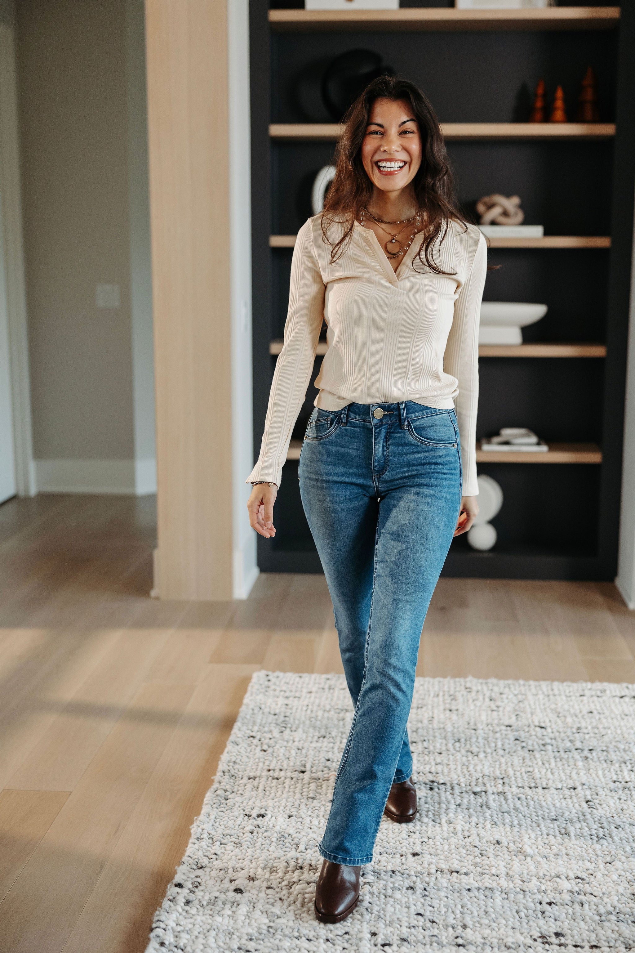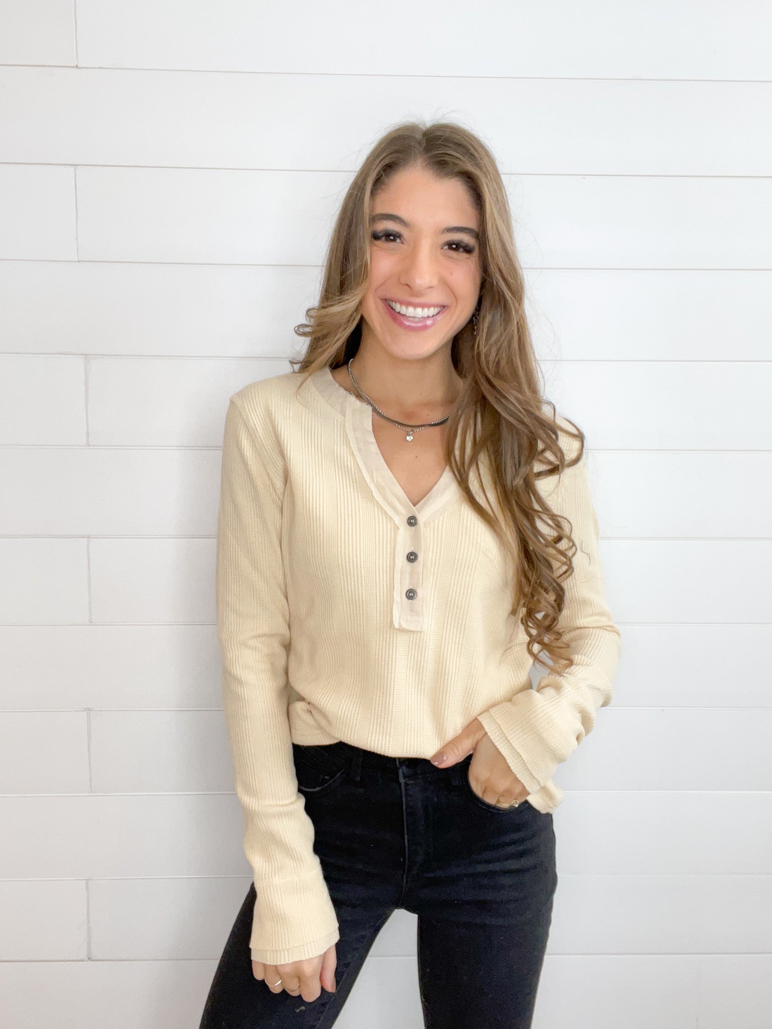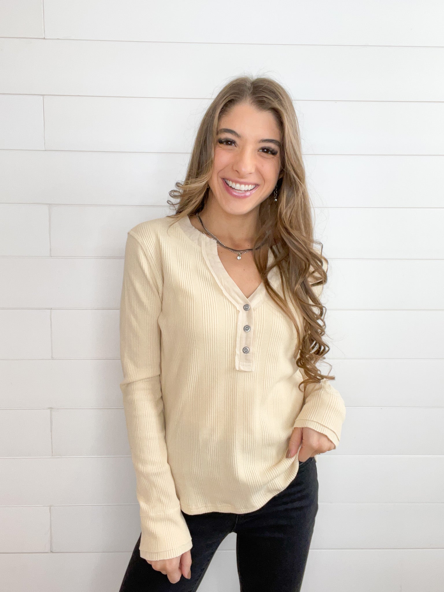 The Mac and Me Button Front Rib Top is a versatile wardrobe staple, featuring a button-front design that adds a touch of classic style. The ribbed texture provides a flattering, snug fit, making it perfect for layering or wearing on its own for a chic, minimalist look.