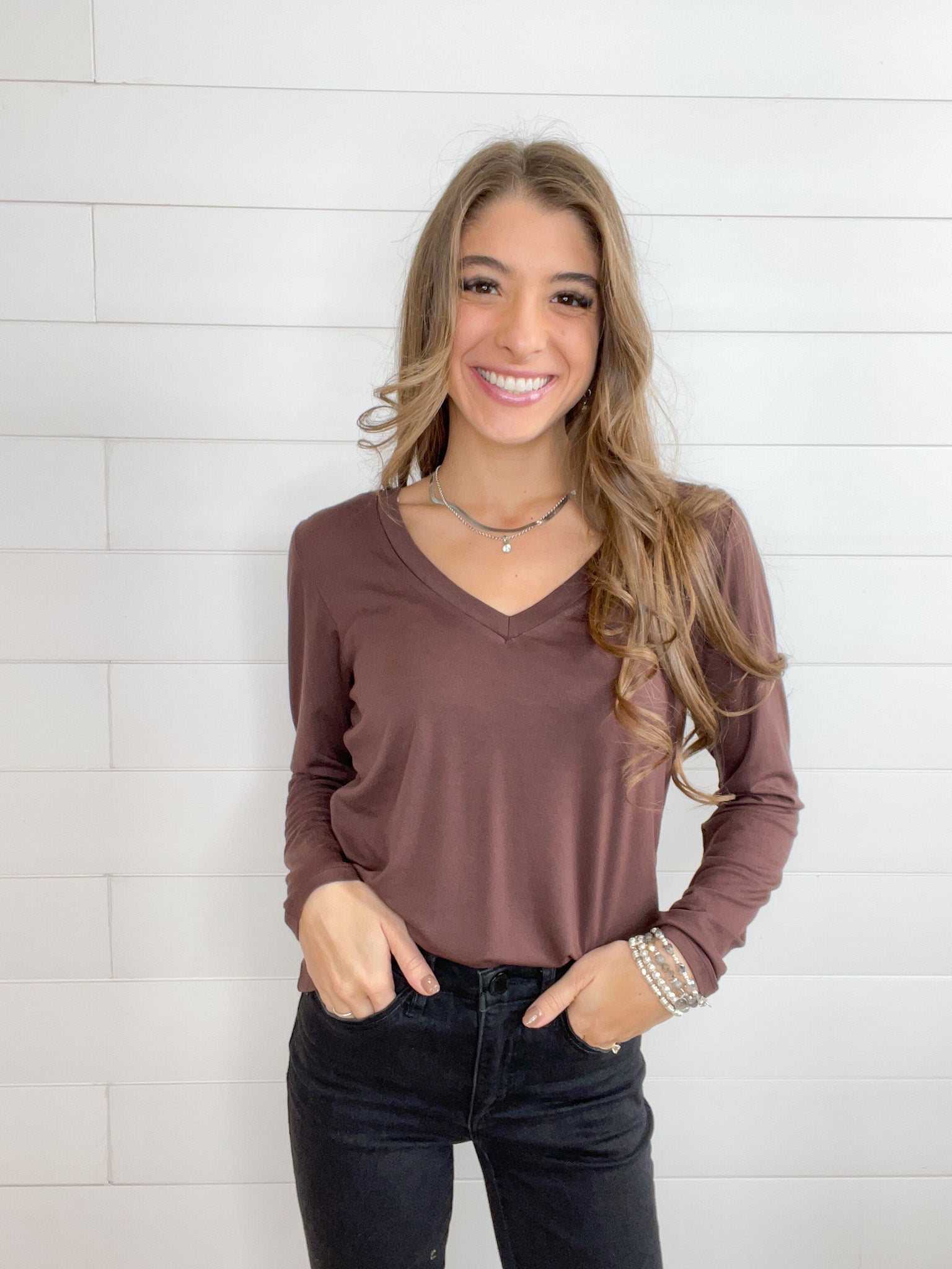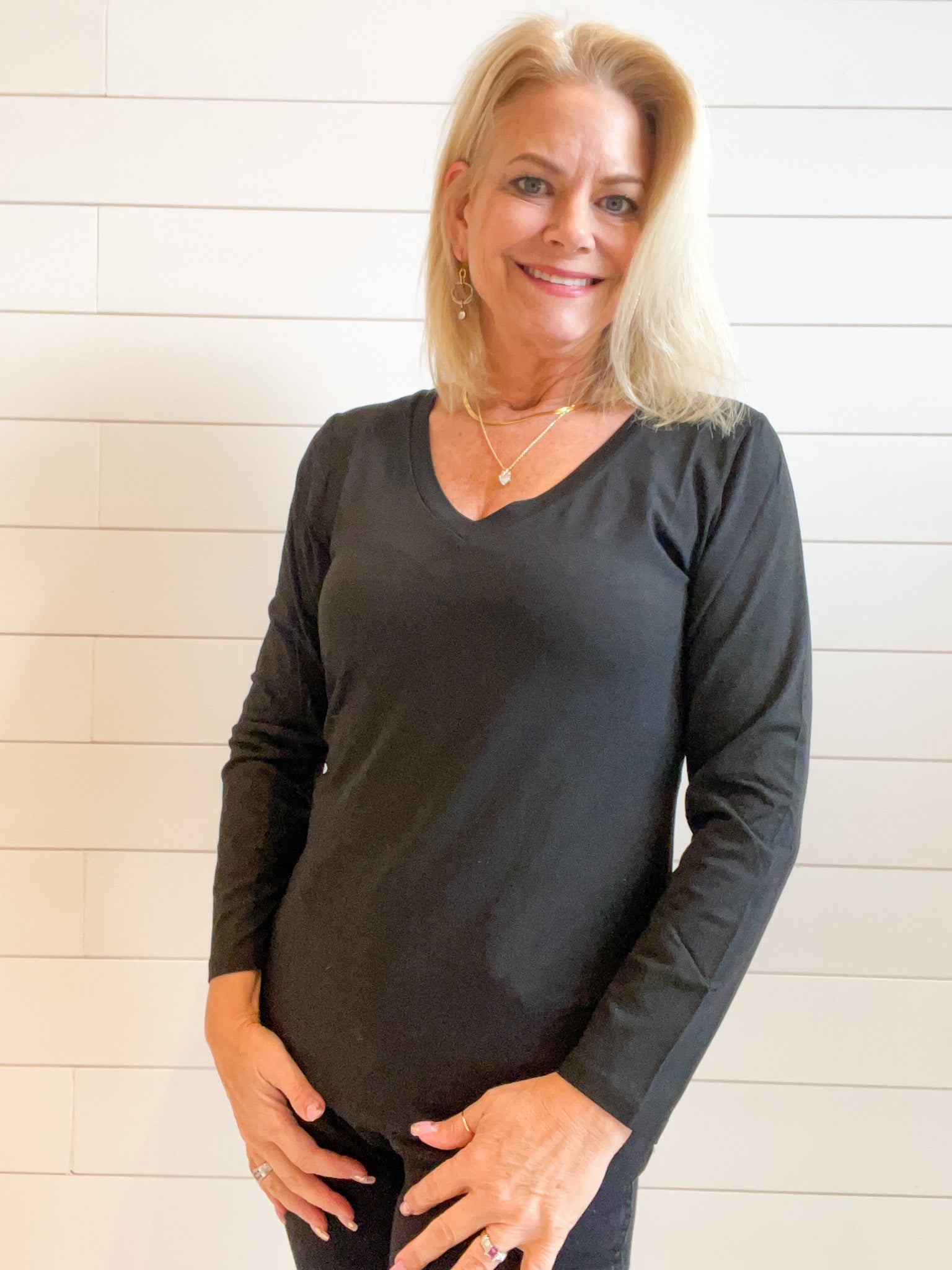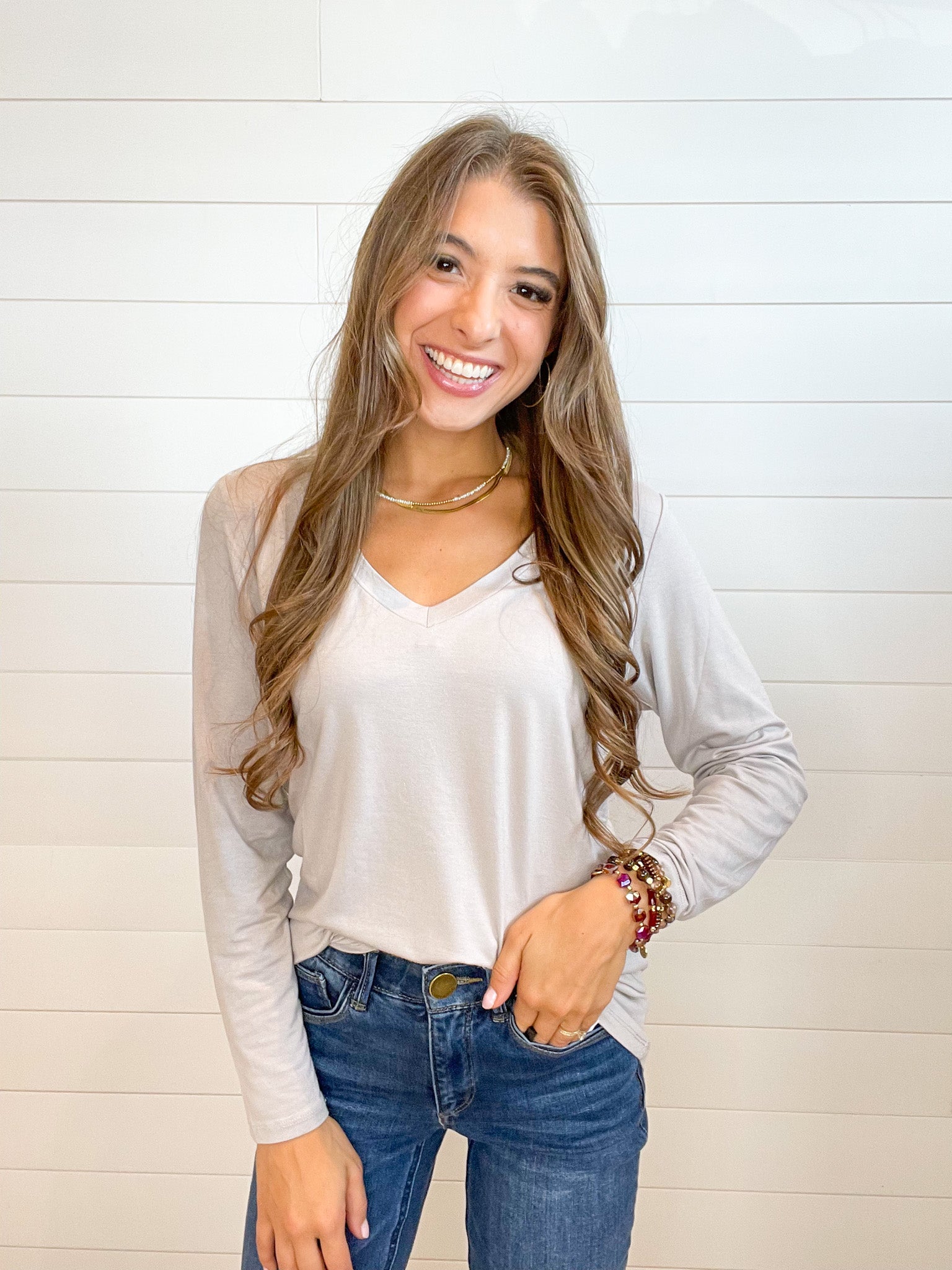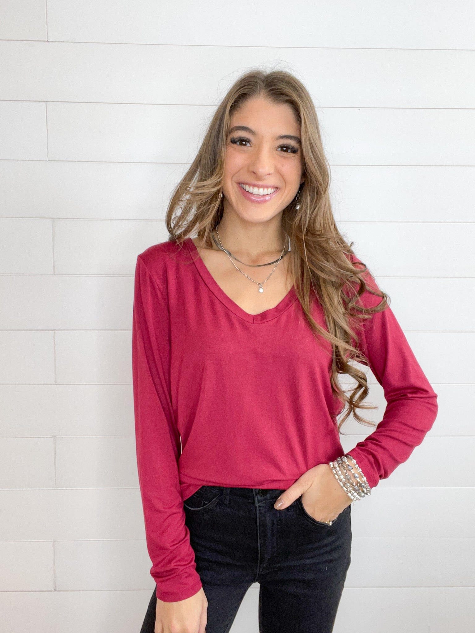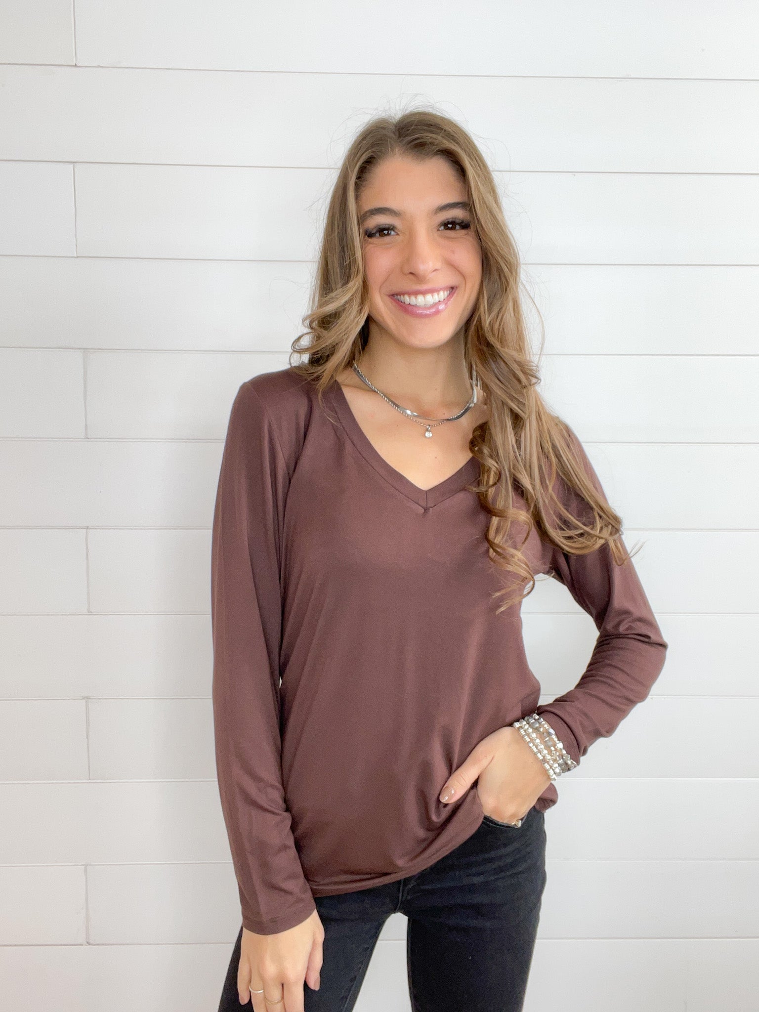 - Design: The Mac and Me Long Sleeve V-Neck Top features a classic V-neckline that adds a feminine touch to its simple yet elegant design. The long sleeves provide extra coverage, making it perfect for layering or wearing on its own. The clean lines and timeless silhouette make this top a versatile piece that pairs effortlessly with everything from jeans to skirts.