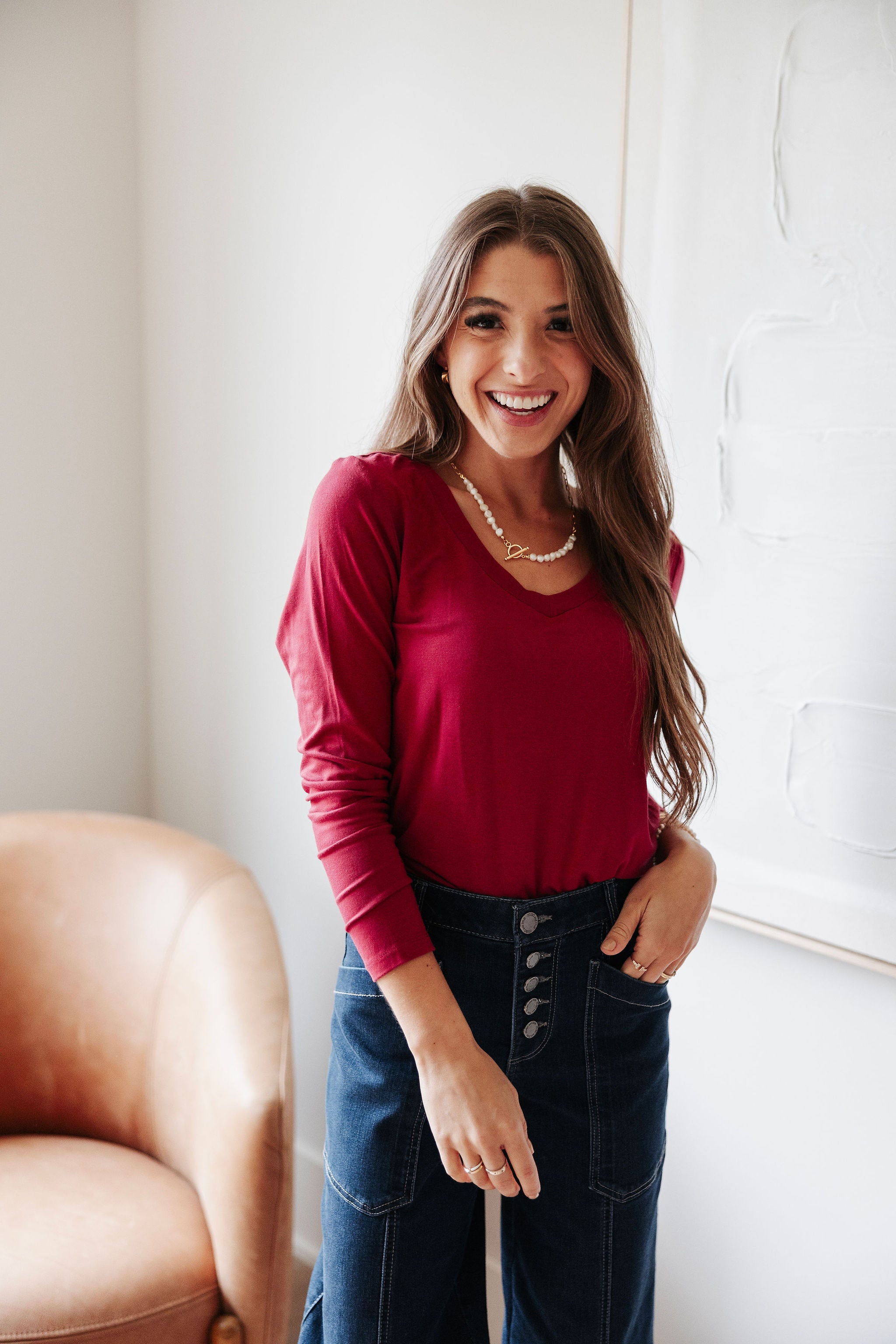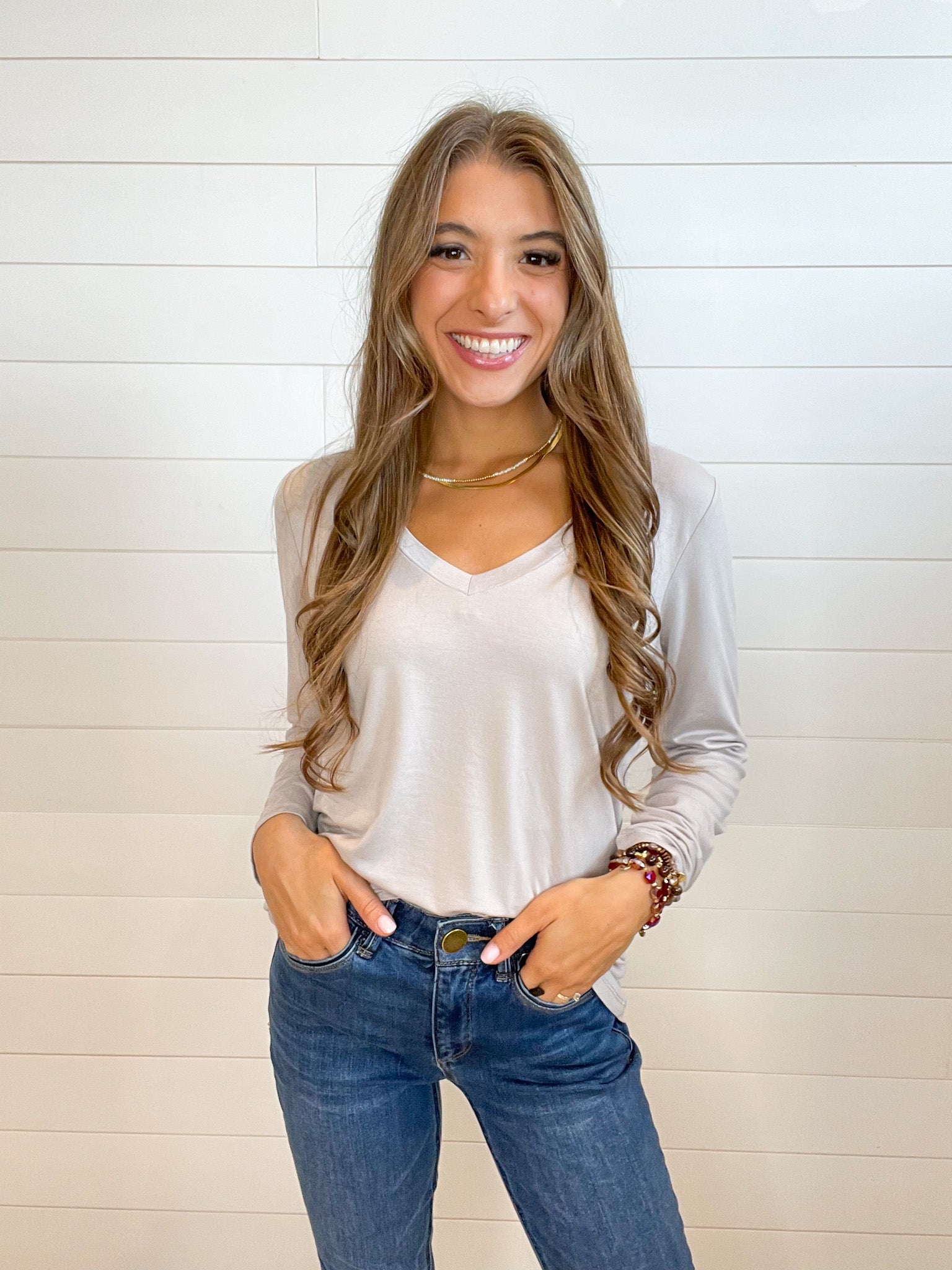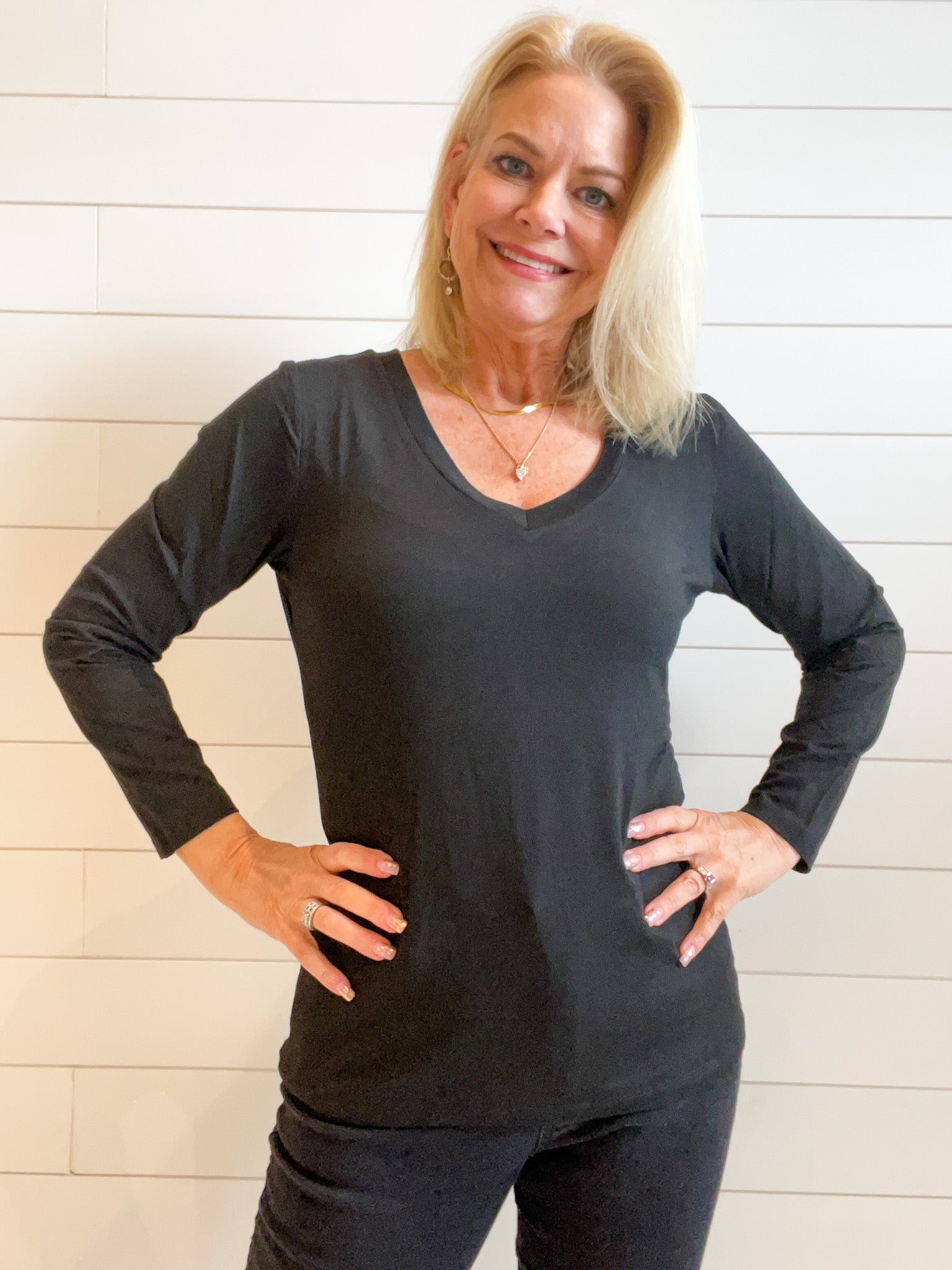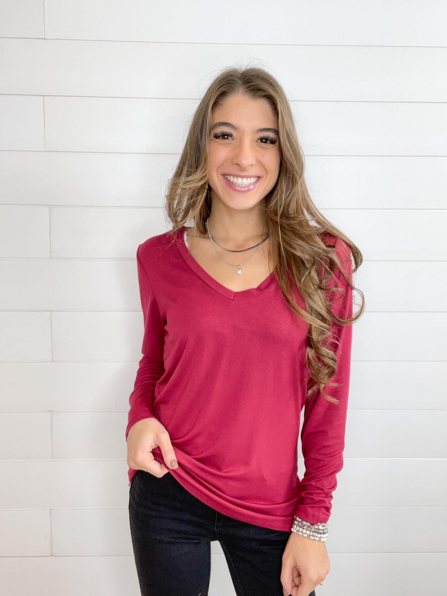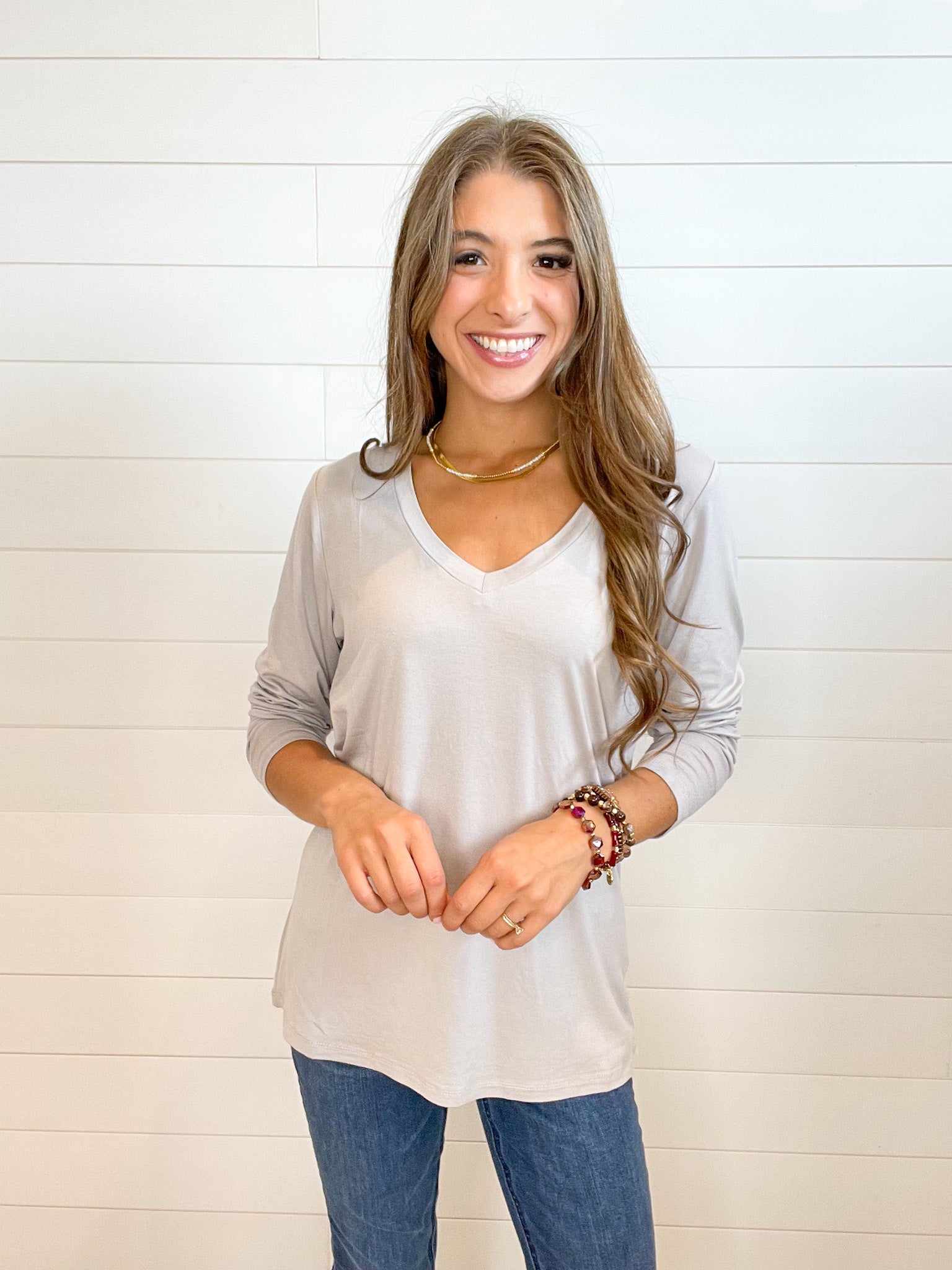 - Design: The Mac and Me Long Sleeve V-Neck Top features a classic V-neckline that adds a feminine touch to its simple yet elegant design. The long sleeves provide extra coverage, making it perfect for layering or wearing on its own. The clean lines and timeless silhouette make this top a versatile piece that pairs effortlessly with everything from jeans to skirts.