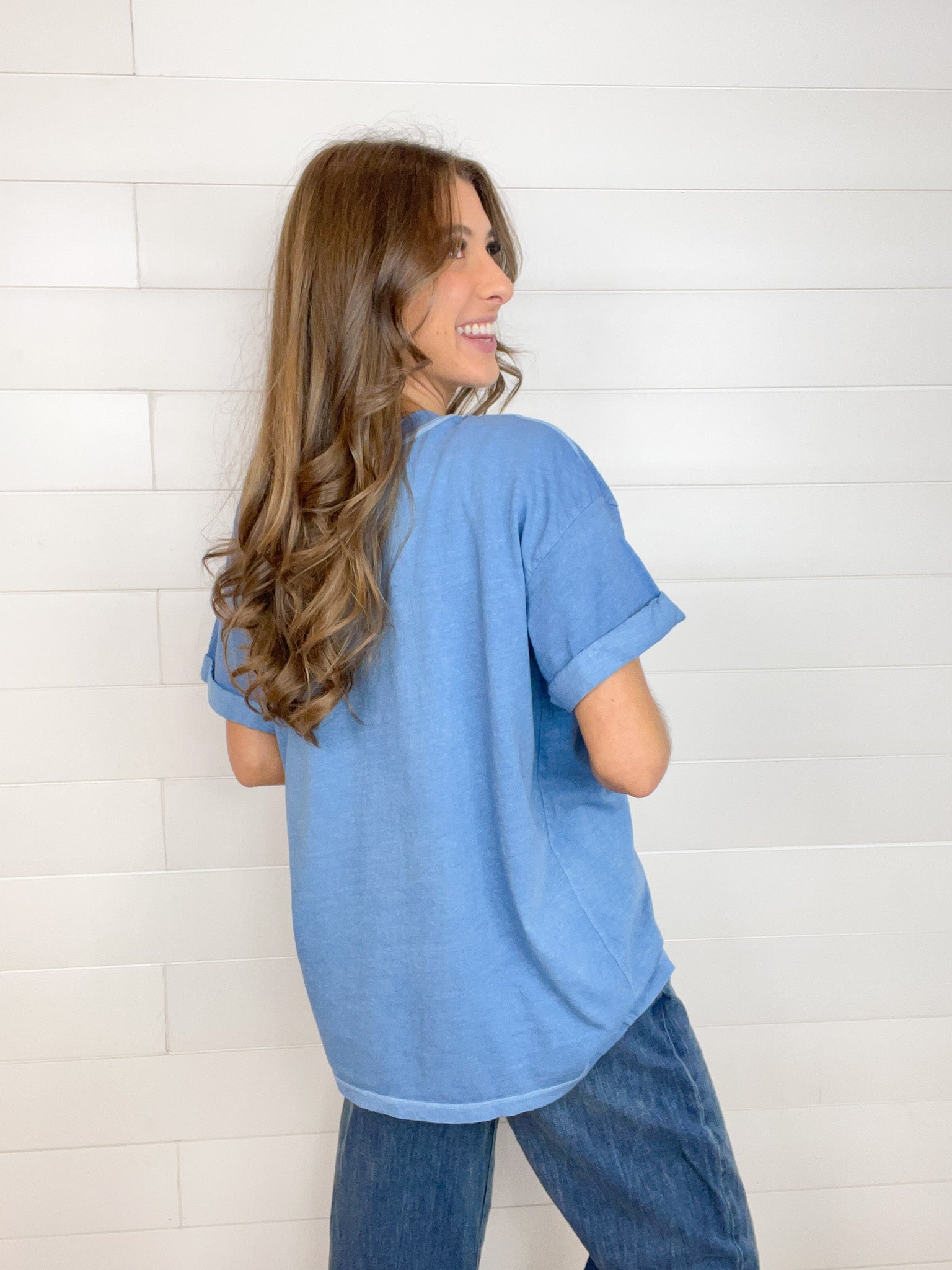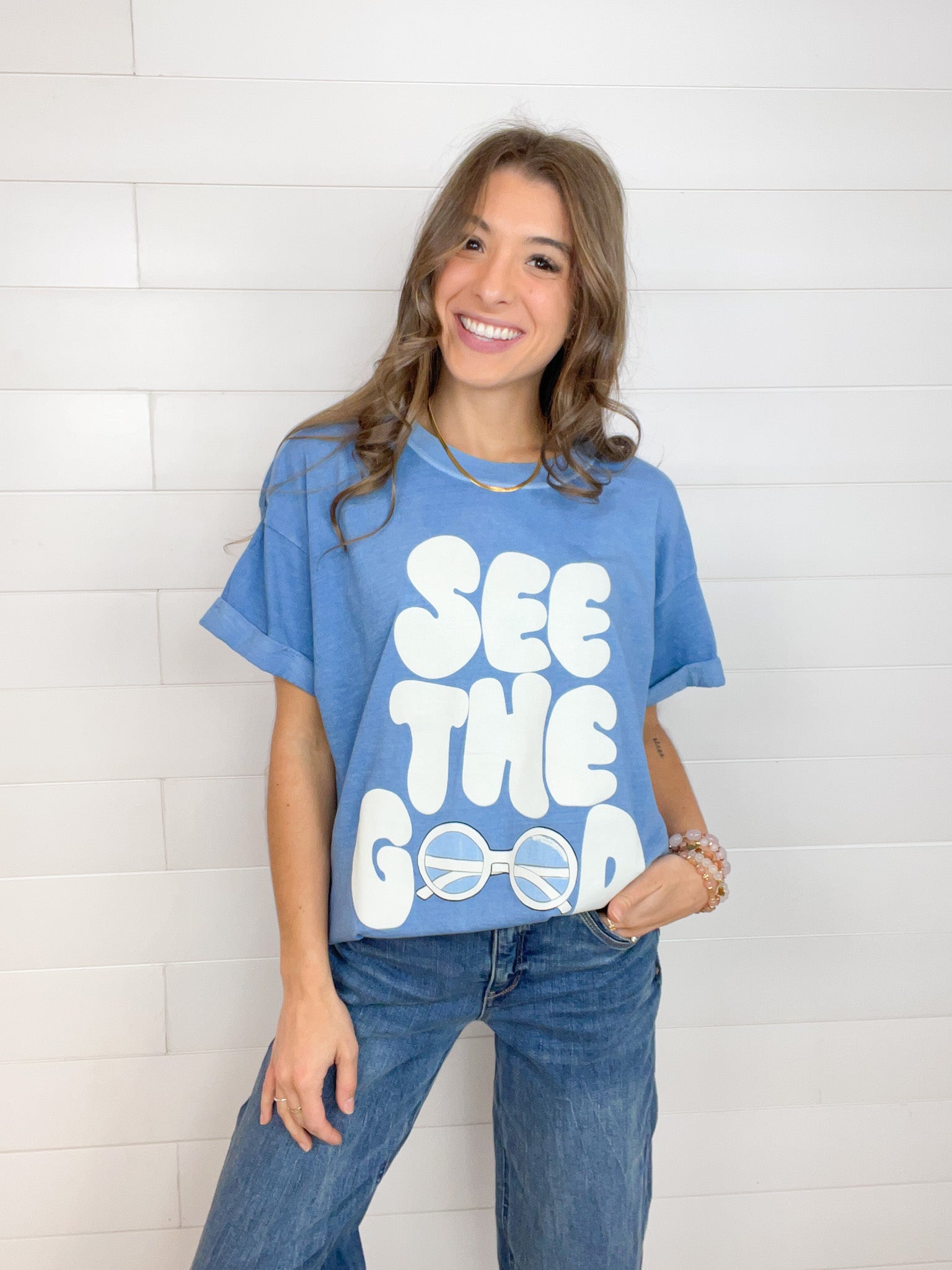The Mac and Me See the Good Graphic Tee is a reminder to focus on the positive in life. With the inspiring "See The Good" message, this tee encourages us all to embrace a positive outlook. Made from 100% cotton, it features a beautiful blue color and a soft, lightweight hand feel. The boyfriend fit is slightly oversized and offers a flattering, relaxed fit that’s perfect for all ages. The sewn rolled-cuff sleeves add a subtle, stylish detail. This tee washes beautifully and maintains its incredible quality.