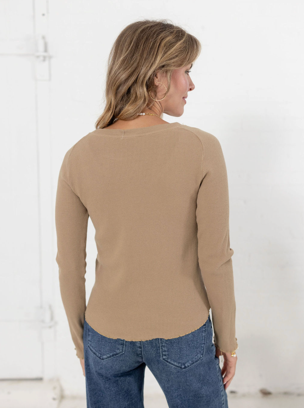The Mac and Me Waffle Rib Long Sleeve Top is your new go-to base layer for every season. With its subtle lettuce-edge hem for that perfectly undone vibe, it’s the definition of cozy-meets-cool. The buttery soft, super stretchy fabric feels dreamy against your skin — whether you’re layering it up or wearing it solo.