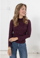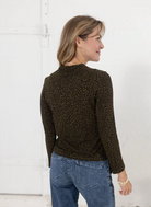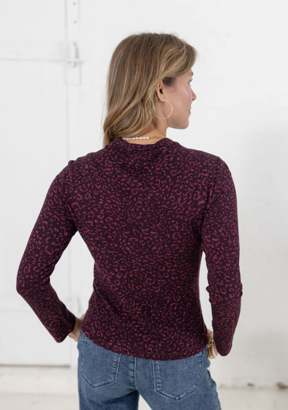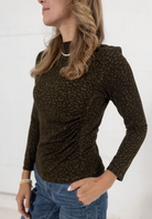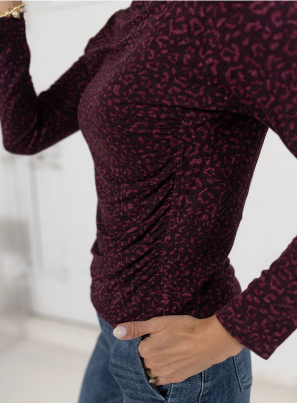 Sleek and easy to style, this knit top is an eye-catching must-have. It features long sleeves, a mock neck, asymmetrical side ruching details, and a subtle animal print.