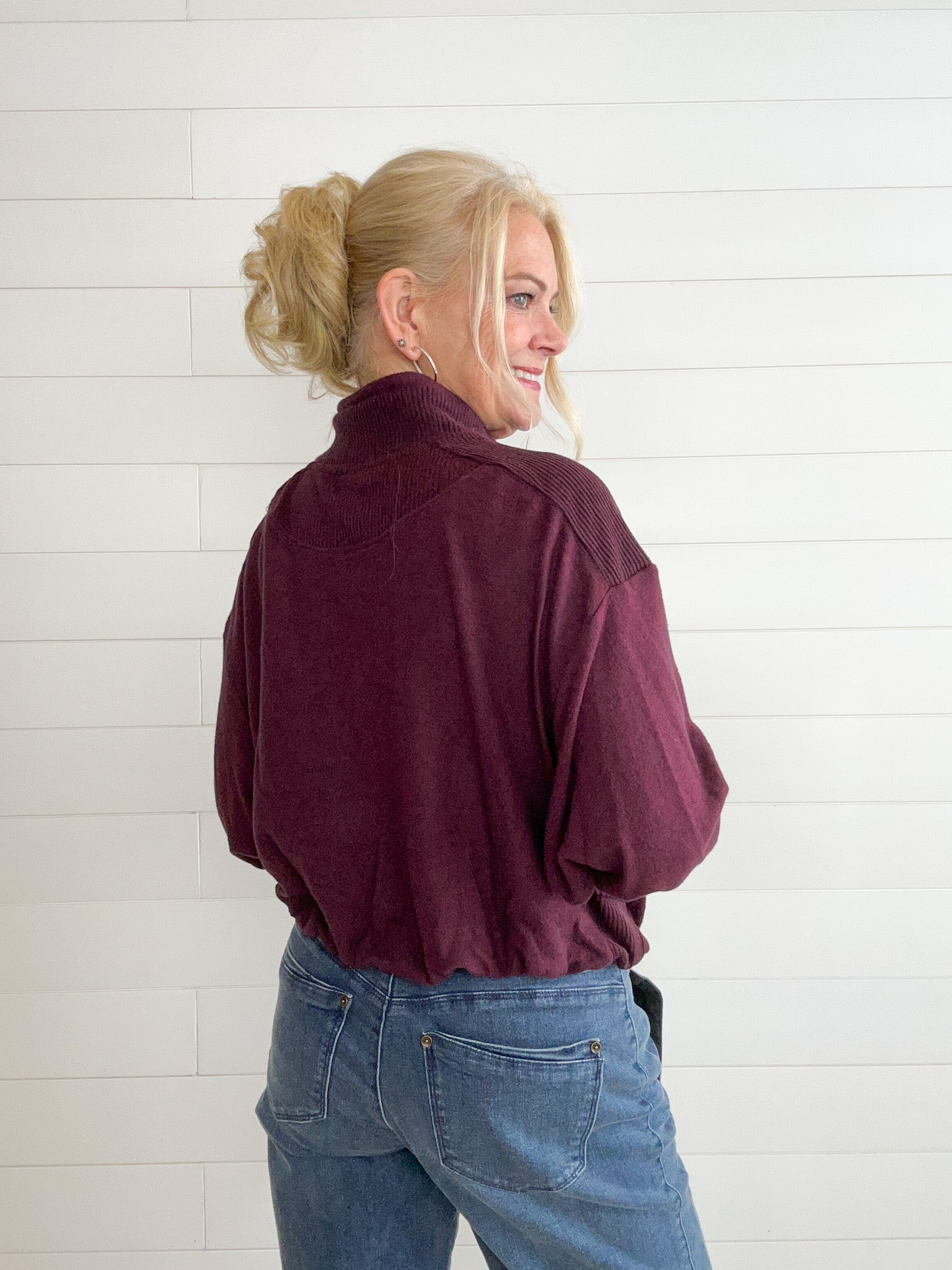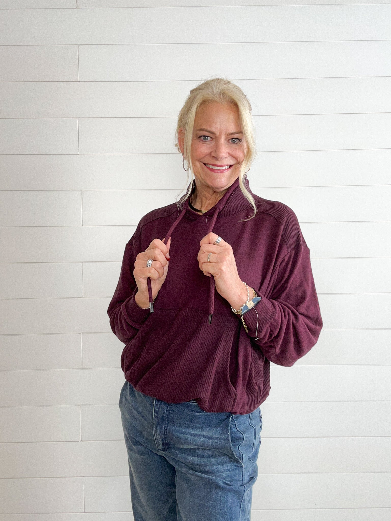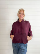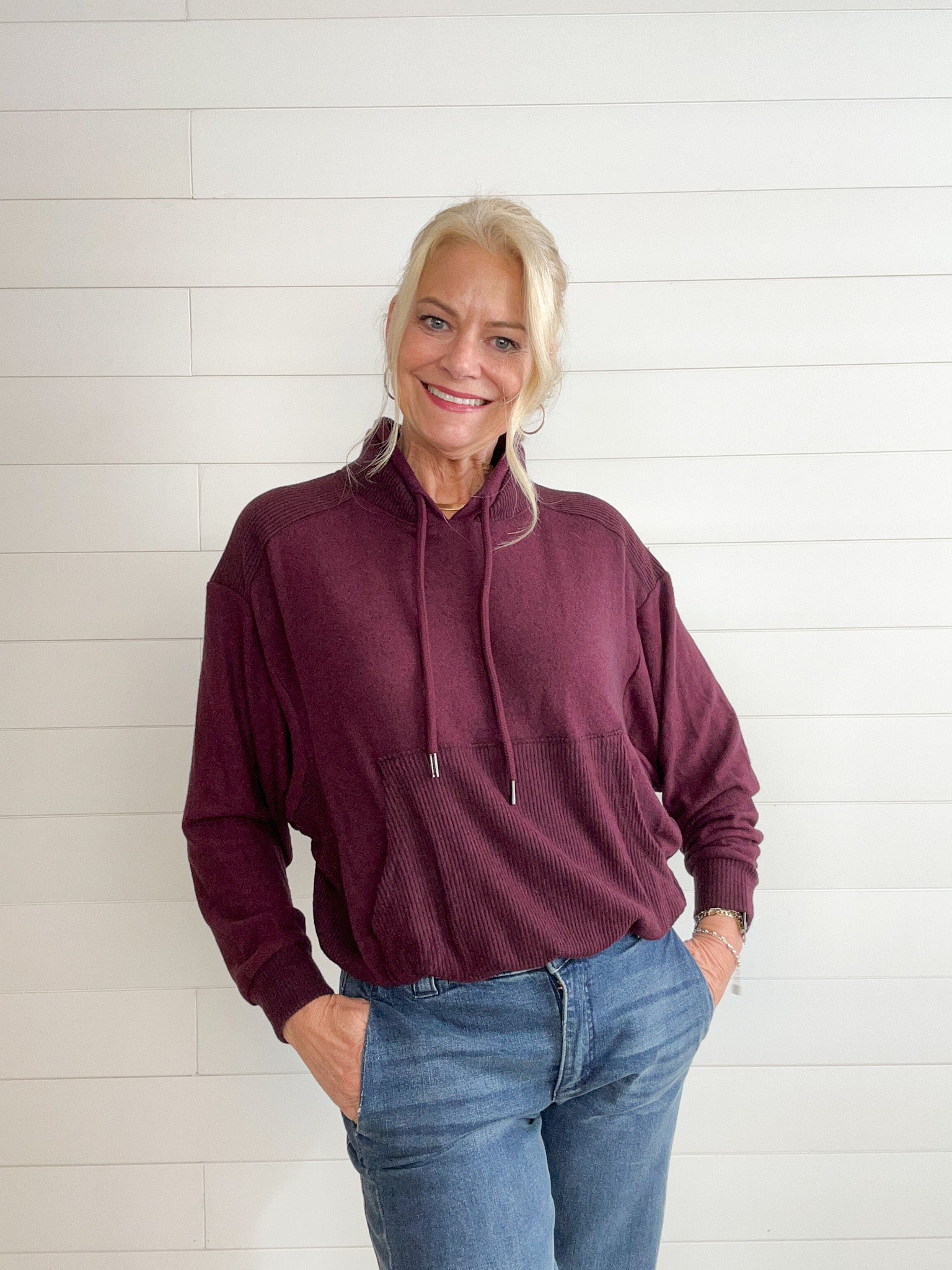 Like a hoodie but with more intentional details, this mixed media knit top is an easy style to reach for when you want to be cozy. It has long banded sleeves, a stand collar with a tie, kangaroo pocket front, and a bubble hem.