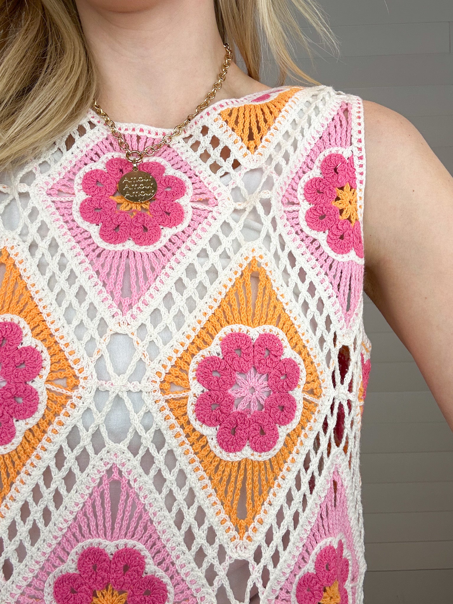 The Charlie B Diamond Crochet Flower Tank is a true standout piece with artisan-inspired detail. Designed with a beige crochet base, this tank features diamond patterns in soft pink and orange—each finished with a delicate crocheted flower at the center. The open, loose crochet adds beautiful texture (just layer a tank or tee underneath), while the regular length and true-to-size fit keep it easy and wearable. It’s feminine, unique, and effortlessly eye-catching.