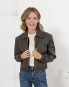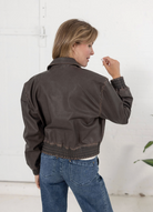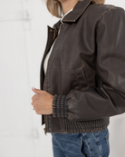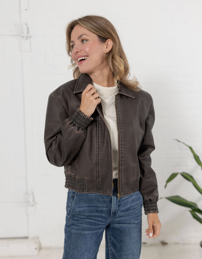 The Cinch Waist Faux Leather Bomber Jacket brings major attitude with its sleek, street-chic silhouette. Made from buttery soft faux leather and fully lined for comfort, this collared bomber features a covered front zipper, roomy front pockets, and elastic at the waist and cuffs for that perfectly cinched shape. It’s the ultimate mix of edgy and effortless—ready to top off any outfit with a little extra cool.