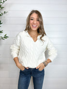 Our Collared V-Neck Cable Knit Sweater brings timeless charm with a modern twist. Featuring simple cable and plain knit vertical stripes, this piece feels both refined and relaxed. The collared neckline adds a touch of preppy polish, while the slightly oversized fit keeps it cozy and easy to wear — perfect for pairing with denim, trousers, or even layered over a dress.