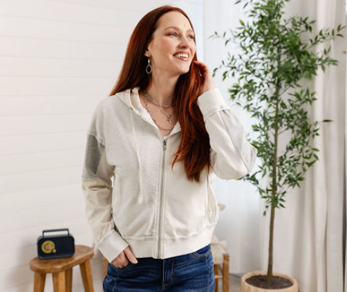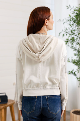 Casual zip-up hoodie featuring a soft neutral colorblock design with subtle contrast panels for an elevated everyday look. Designed with a relaxed silhouette, adjustable drawstring hood, and full front zipper, this lightweight layer is perfect for effortless comfort. The neutral tones make it easy to pair with denim, leggings, or lounge sets for a relaxed yet polished outfit.