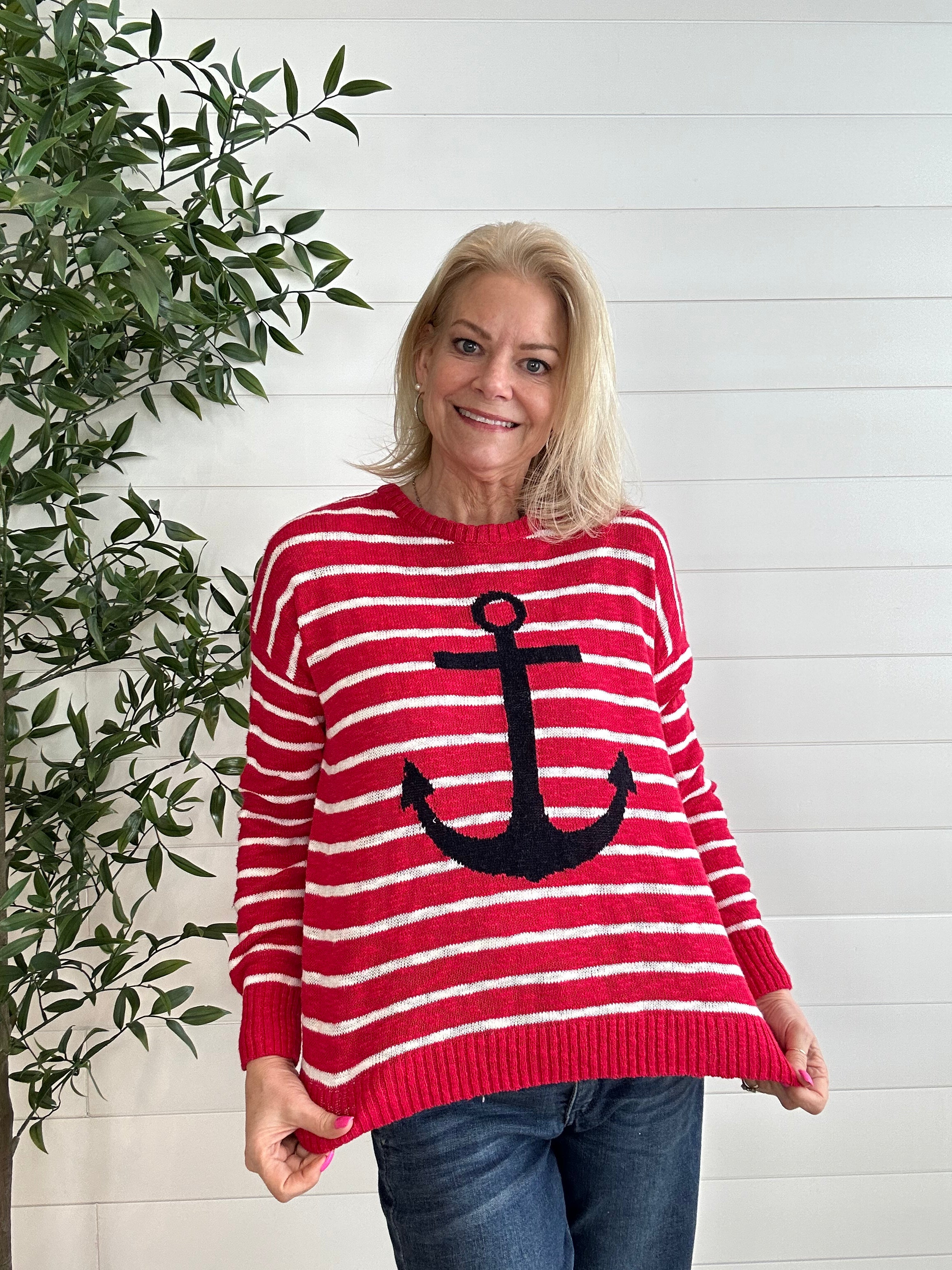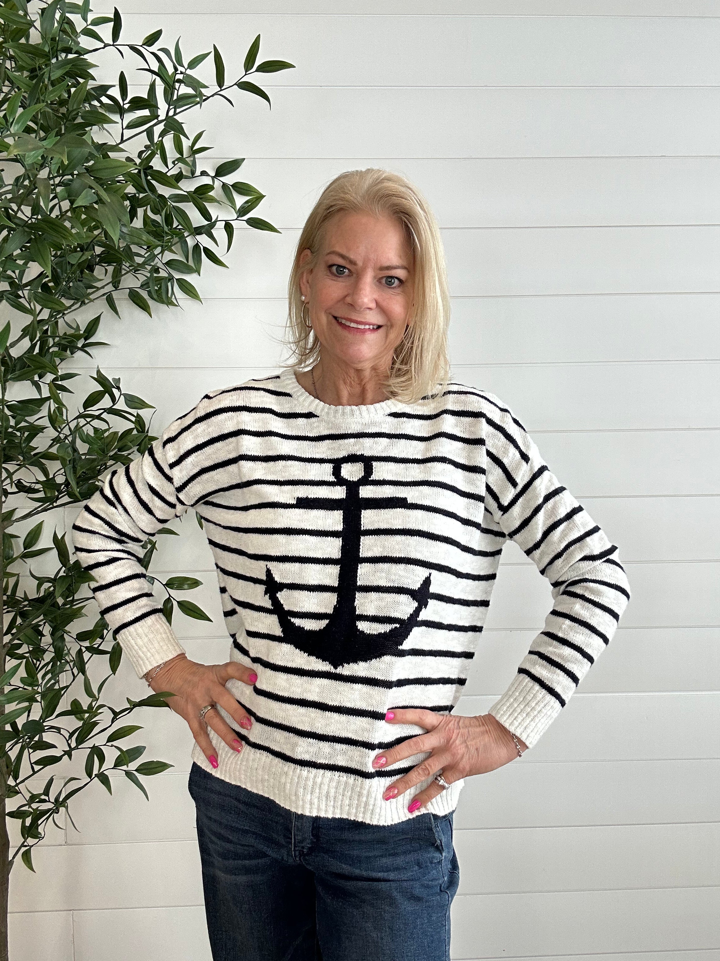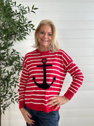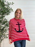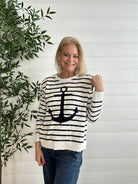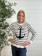 The Crisp Spring Stripe Sweater with Large Front Anchor is the perfect blend of classic pattern and standout style. Designed with clean, spring-ready stripes, this lightweight sweater feels bright and polished while remaining easy to wear. The large front anchor adds a bold, nautical-inspired touch that makes a statement without overwhelming the look. Soft and breathable with a flattering silhouette, it’s an effortless piece for transitional days and casual outings alike.