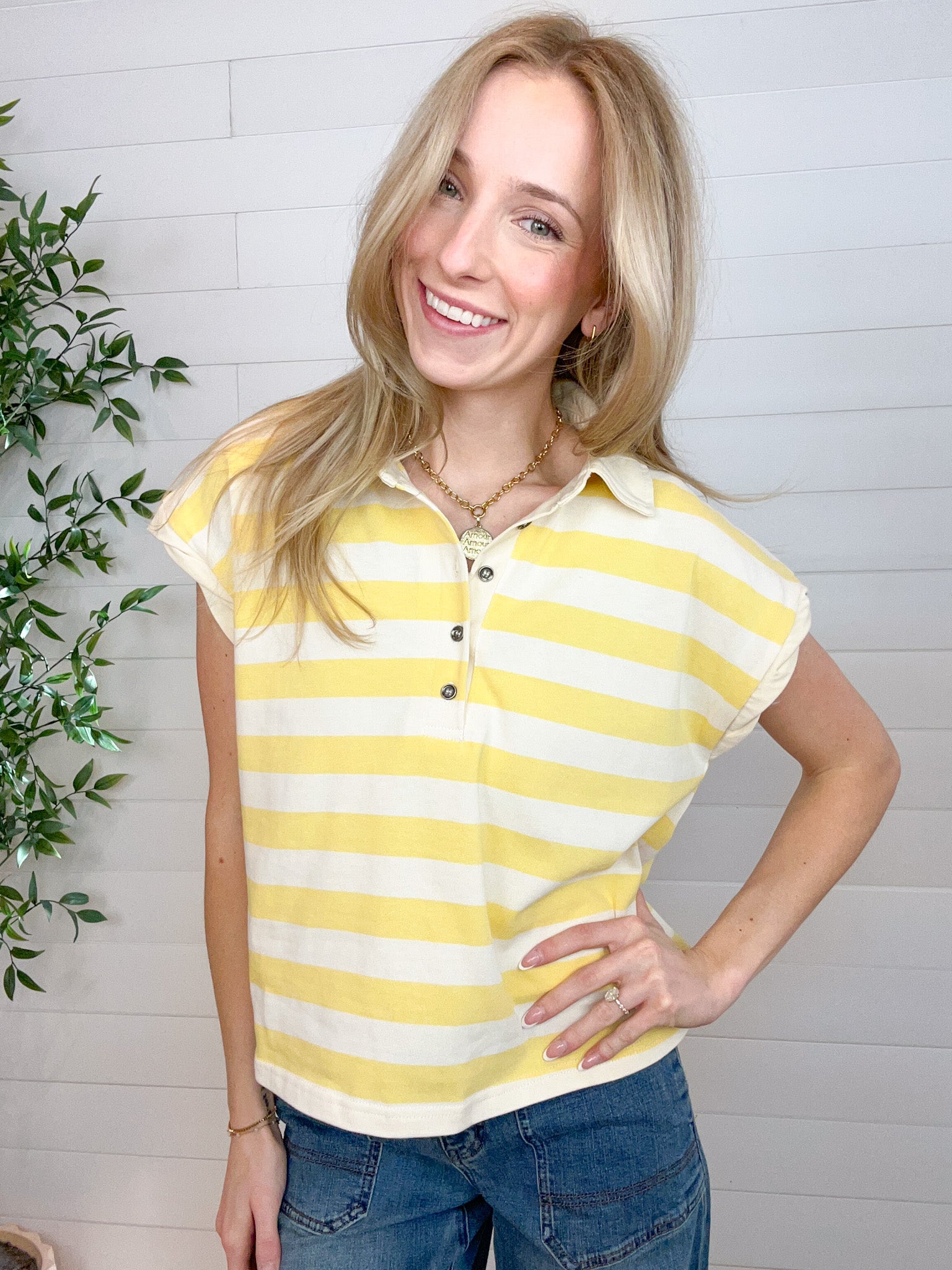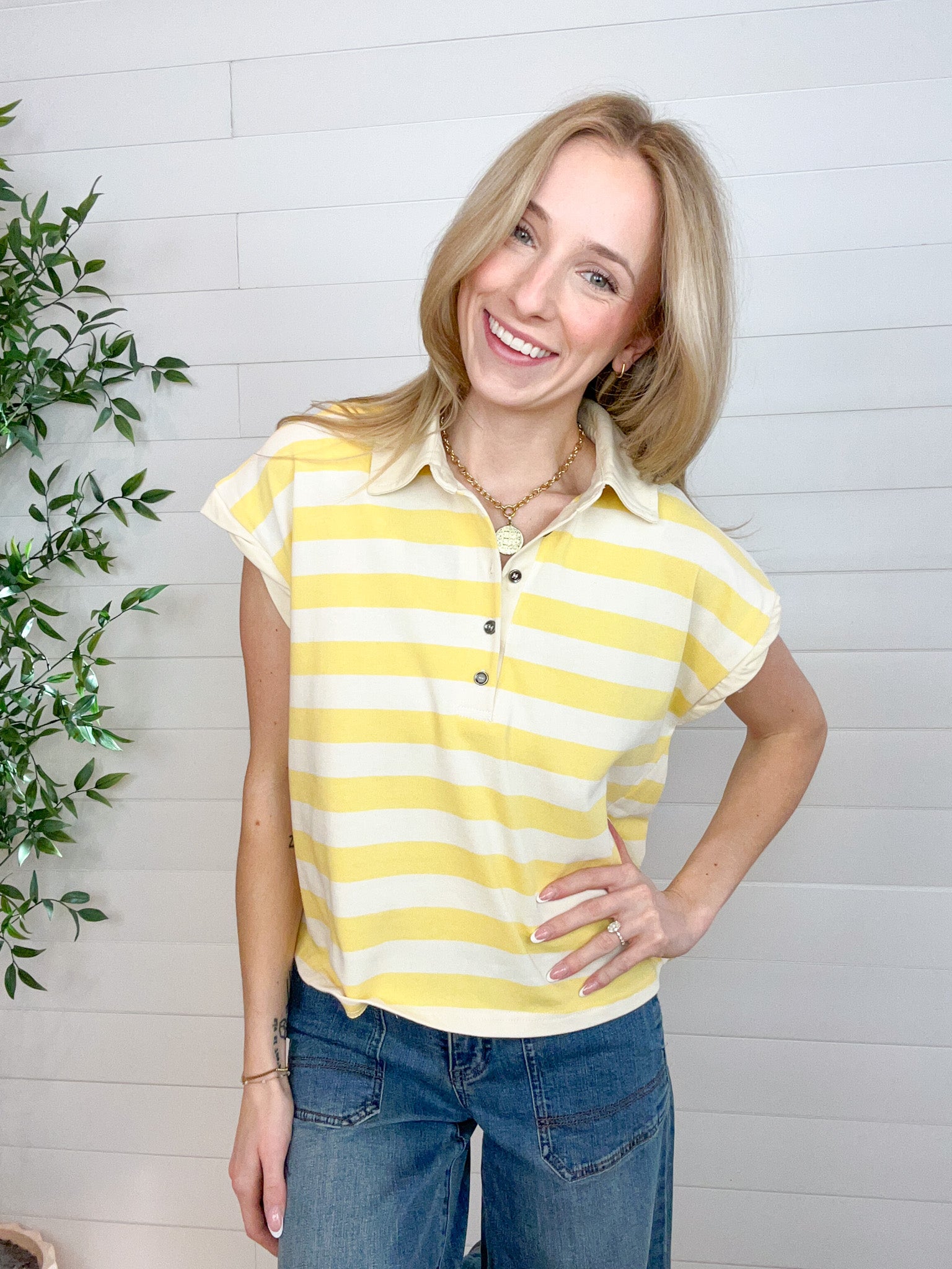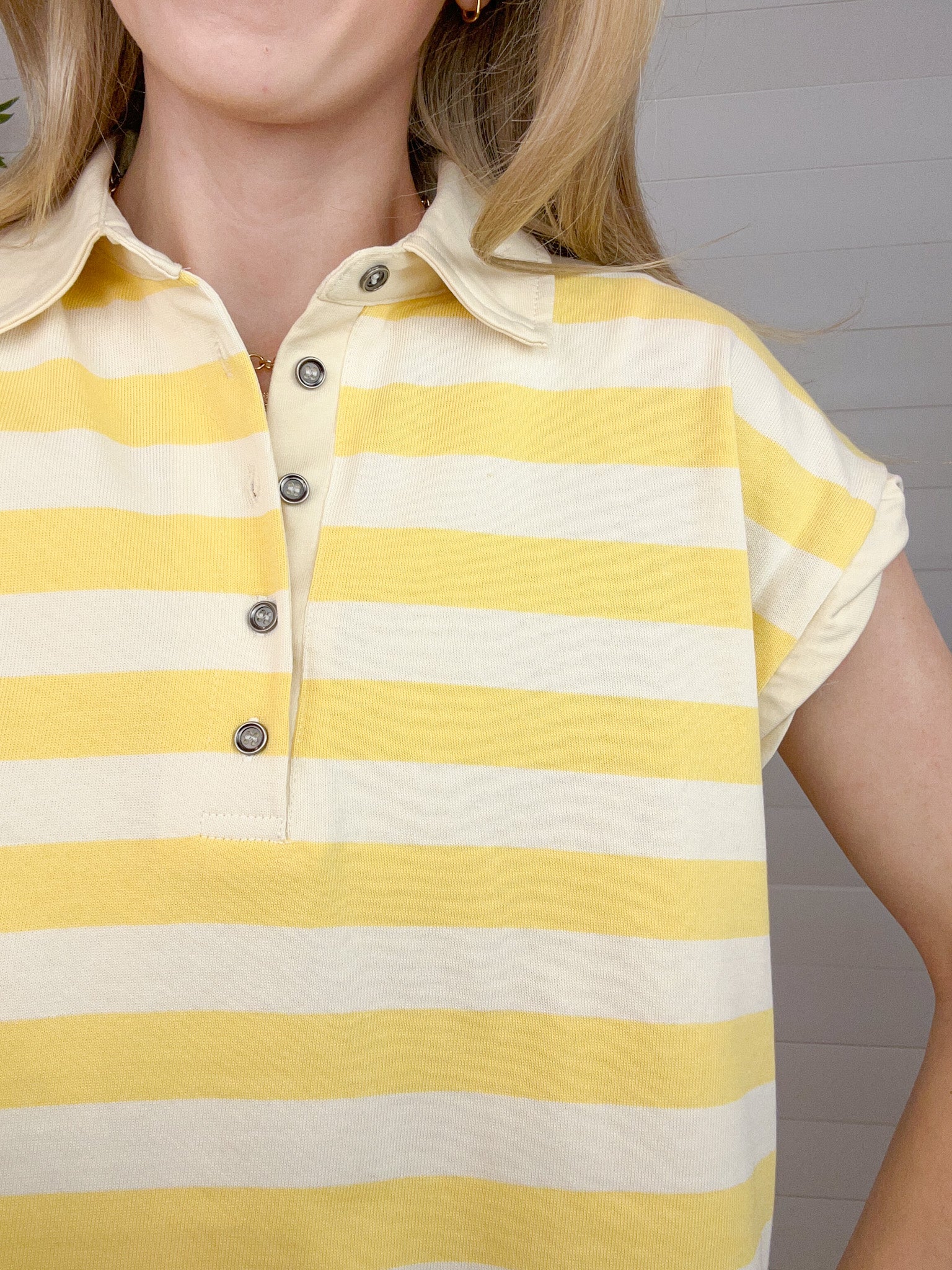 Striped collared neckline with half-button placket