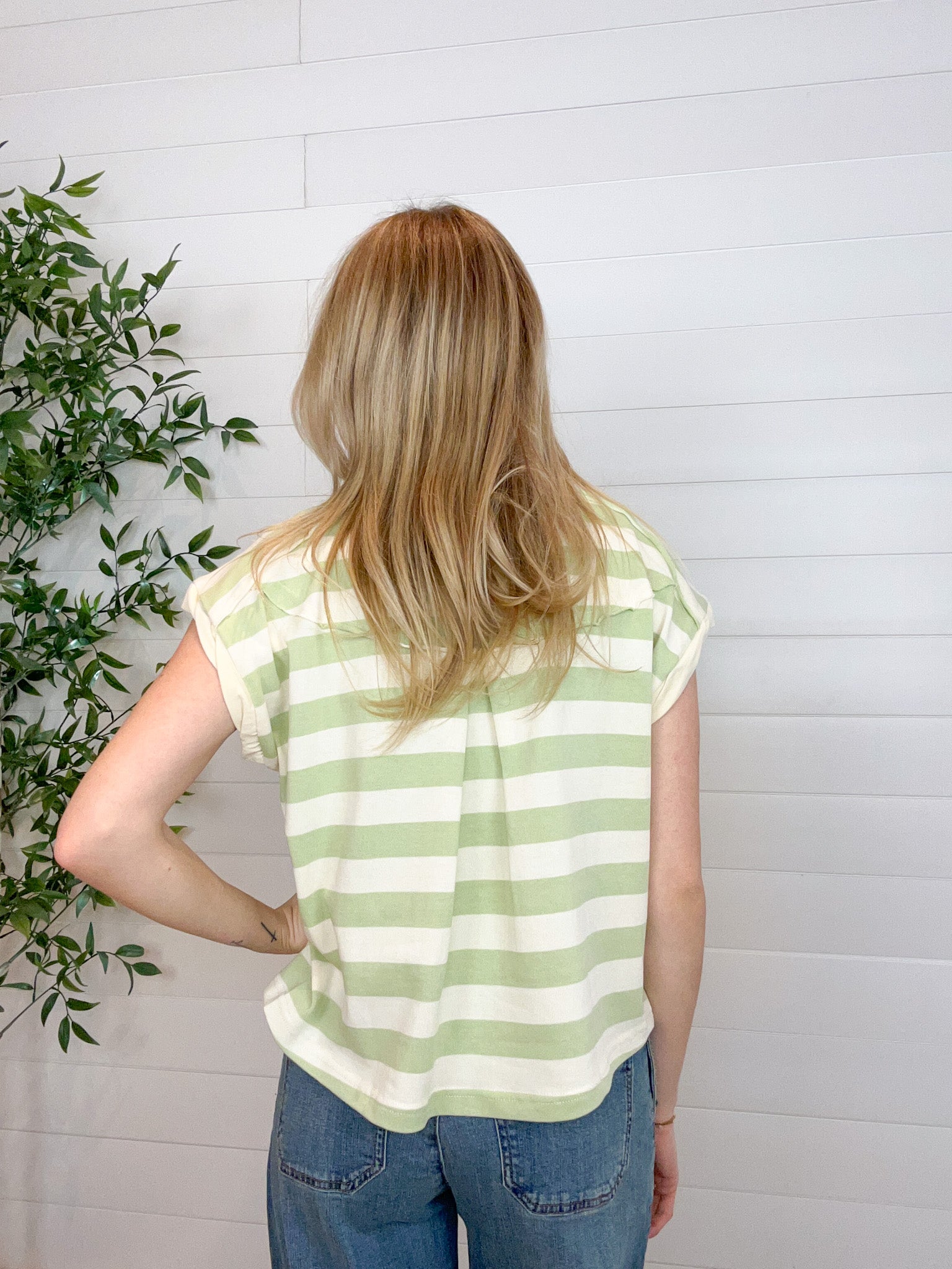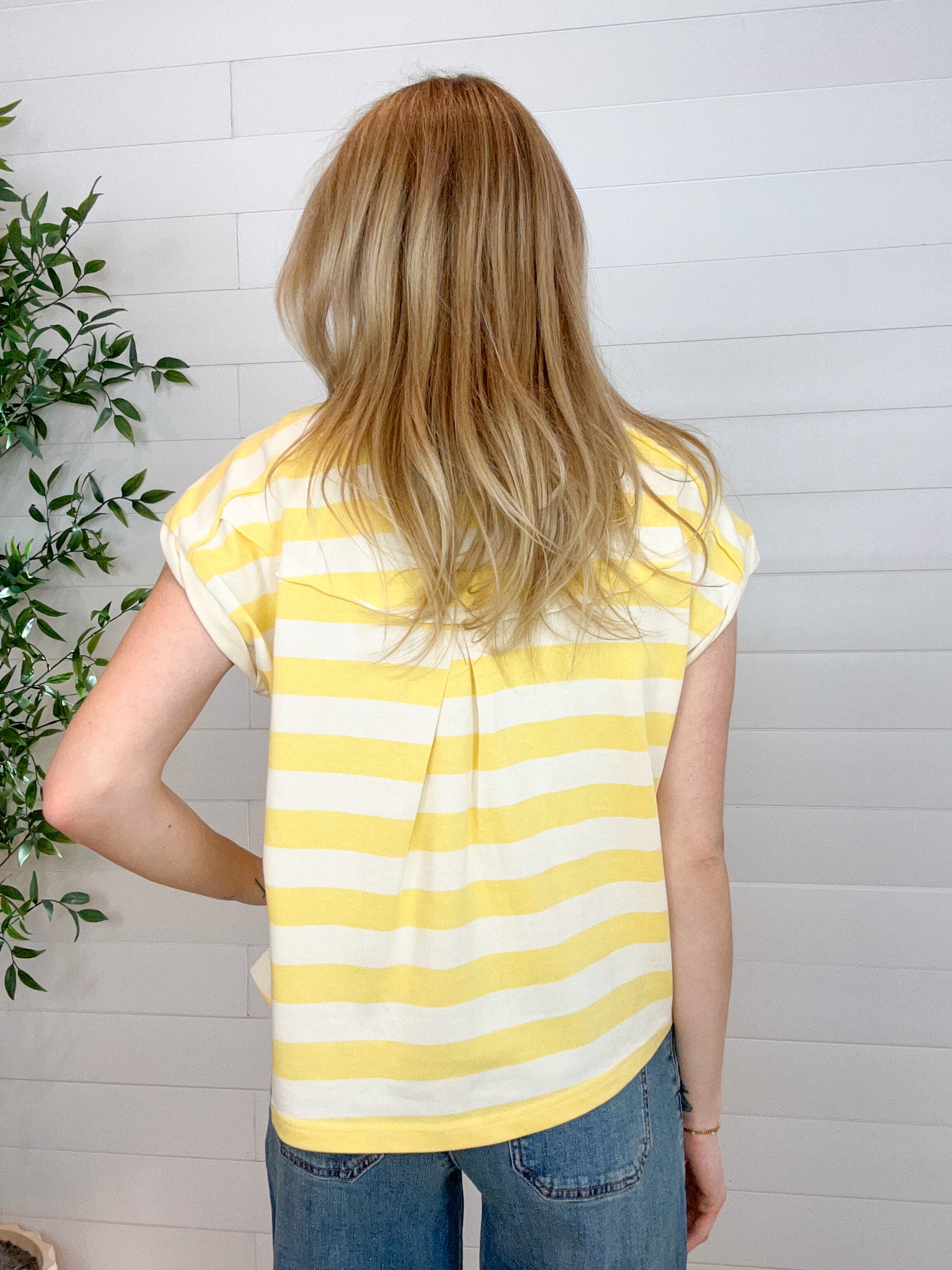 The Cropped Snap Collar Stripe Shirt is that effortless in-between piece that feels both polished and relaxed. Designed with a striped collared neckline and a half-button front, it brings classic structure to an easygoing muscle-top silhouette. Extended shoulders with rolled cuffs add a modern edge, while the back swing yoke and center pleat create beautiful movement and drape. Finished with a slightly cropped length, it’s made to pair perfectly with your favorite high-waisted bottoms.
