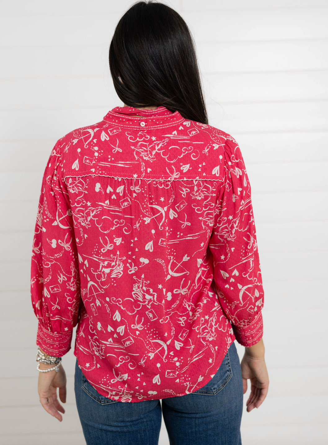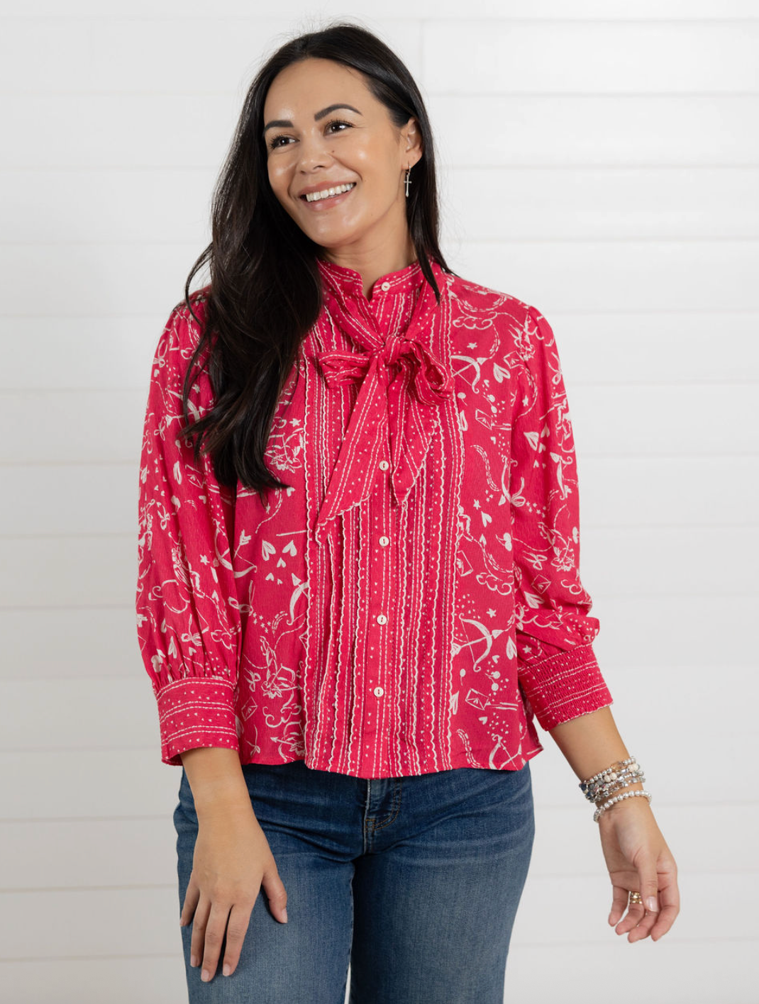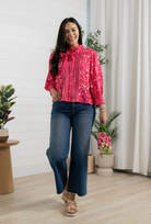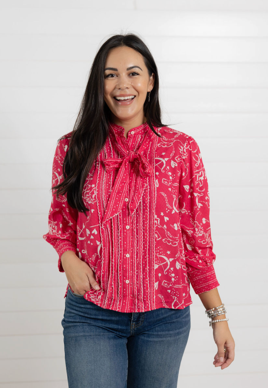 The Cupid’s Bow Tie Ruffle Detail Blouse is pure charm with a festive, fashion-forward feel. Crafted from lightweight woven rayon, this blouse features ruffles along the placket, scallop tipping, and a sweet stand collar finished with a feminine self tie. The abstract print is full of delightful details — think cherubs, hearts, cherries, & more. Three-quarter cinched sleeves and a softly slit round hem keep the silhouette easy and flattering.