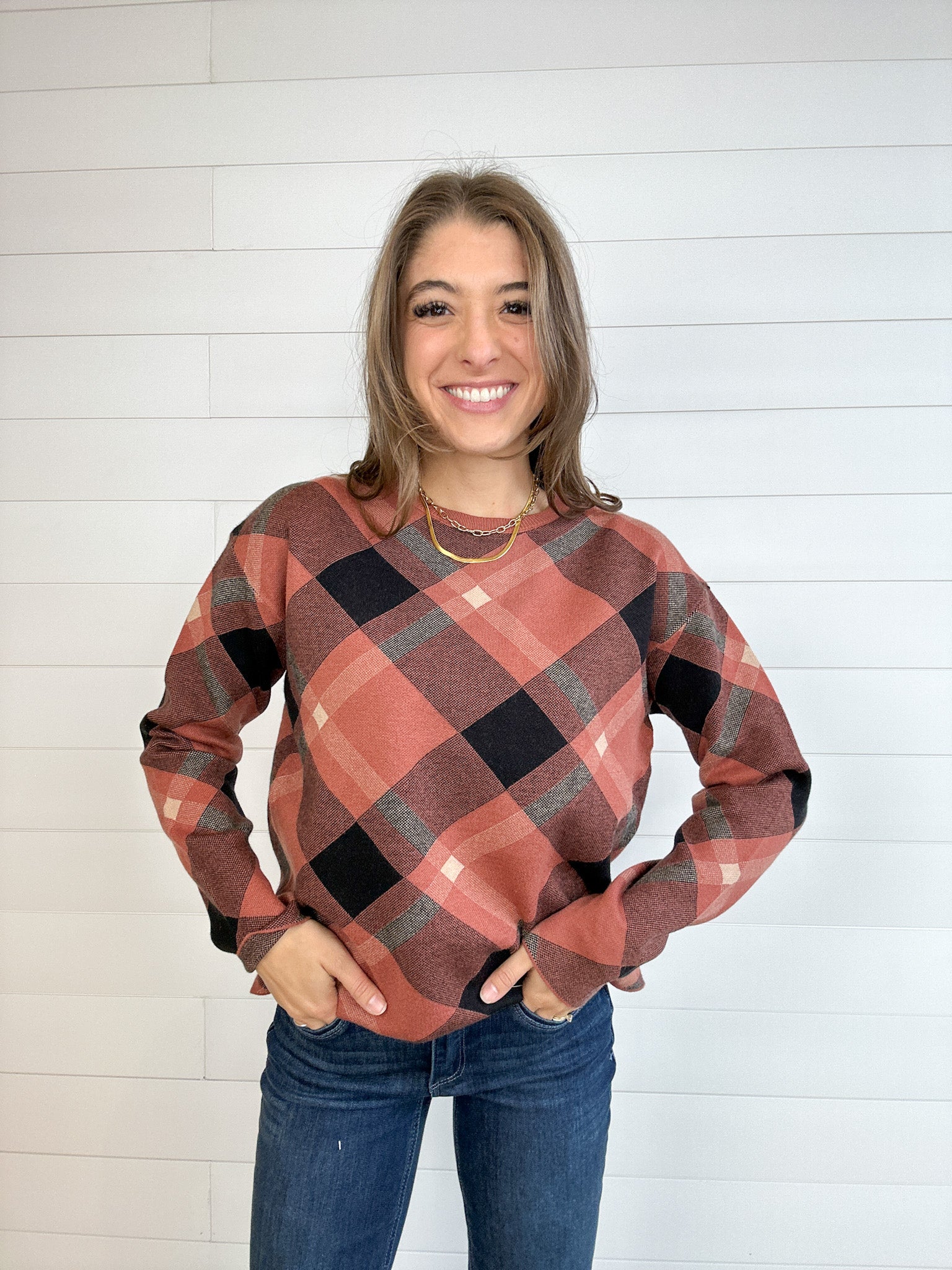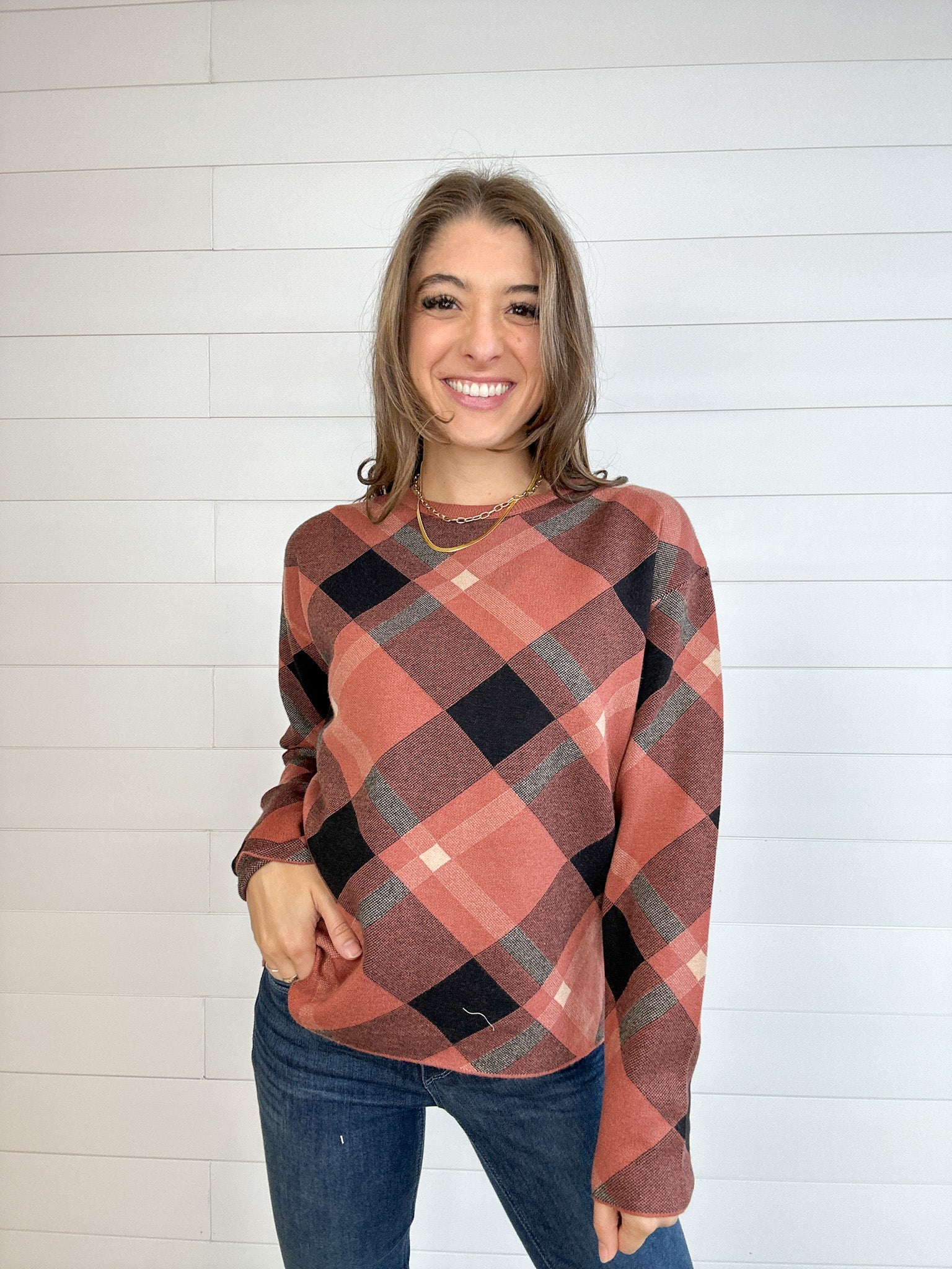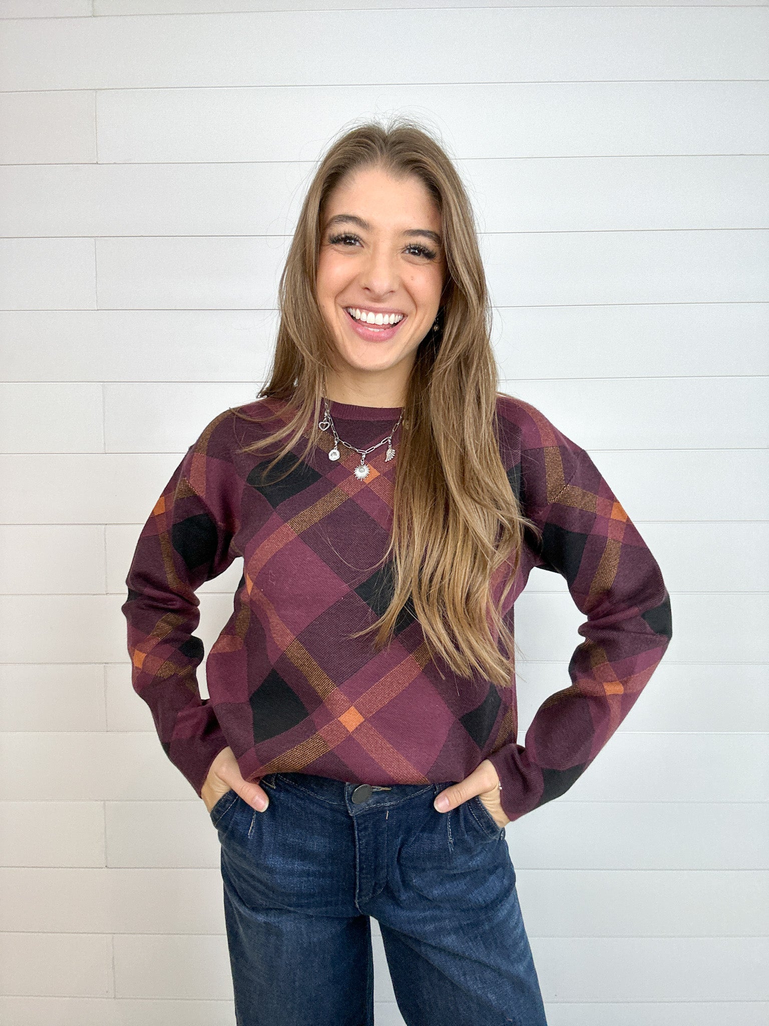 Classic fall vibes get a fresh twist with this Diagonal Plaid Pullover Sweater. Designed in bold, oversized plaid set on the diagonal, it brings movement and personality to a timeless pattern. Crafted from a super soft knit with a crew neckline and long sleeves, it’s the kind of sweater you’ll reach for when crisp days call.