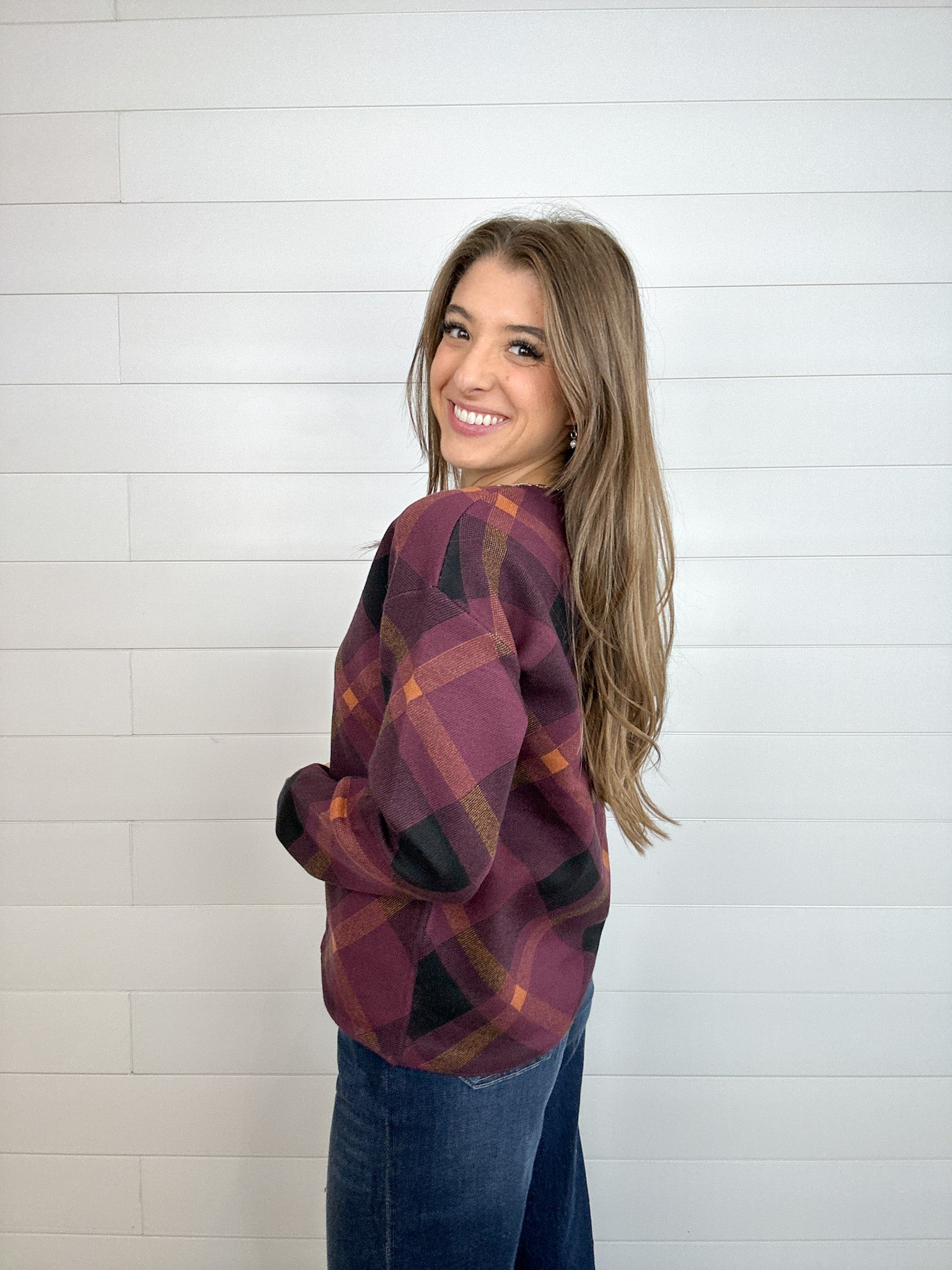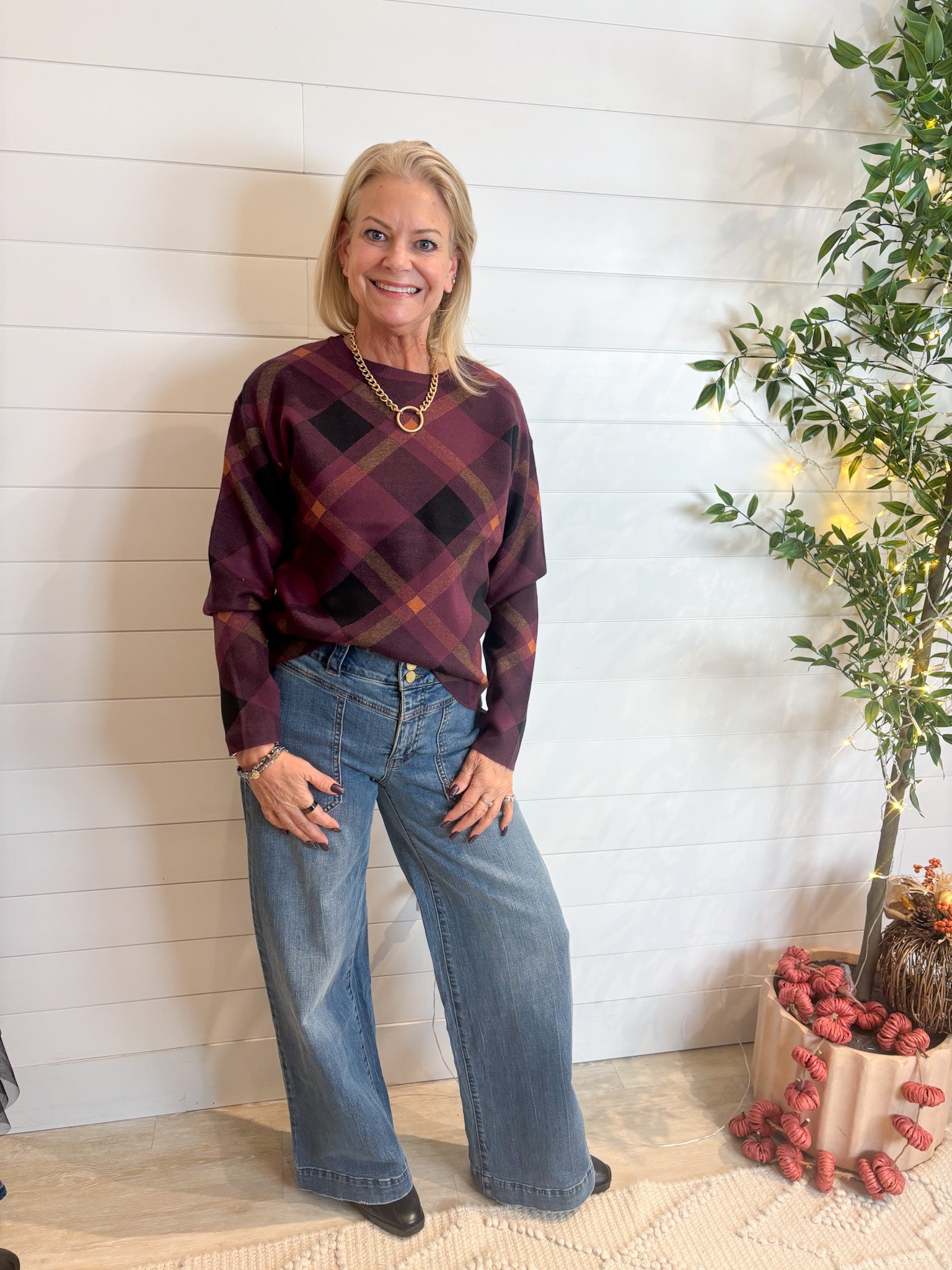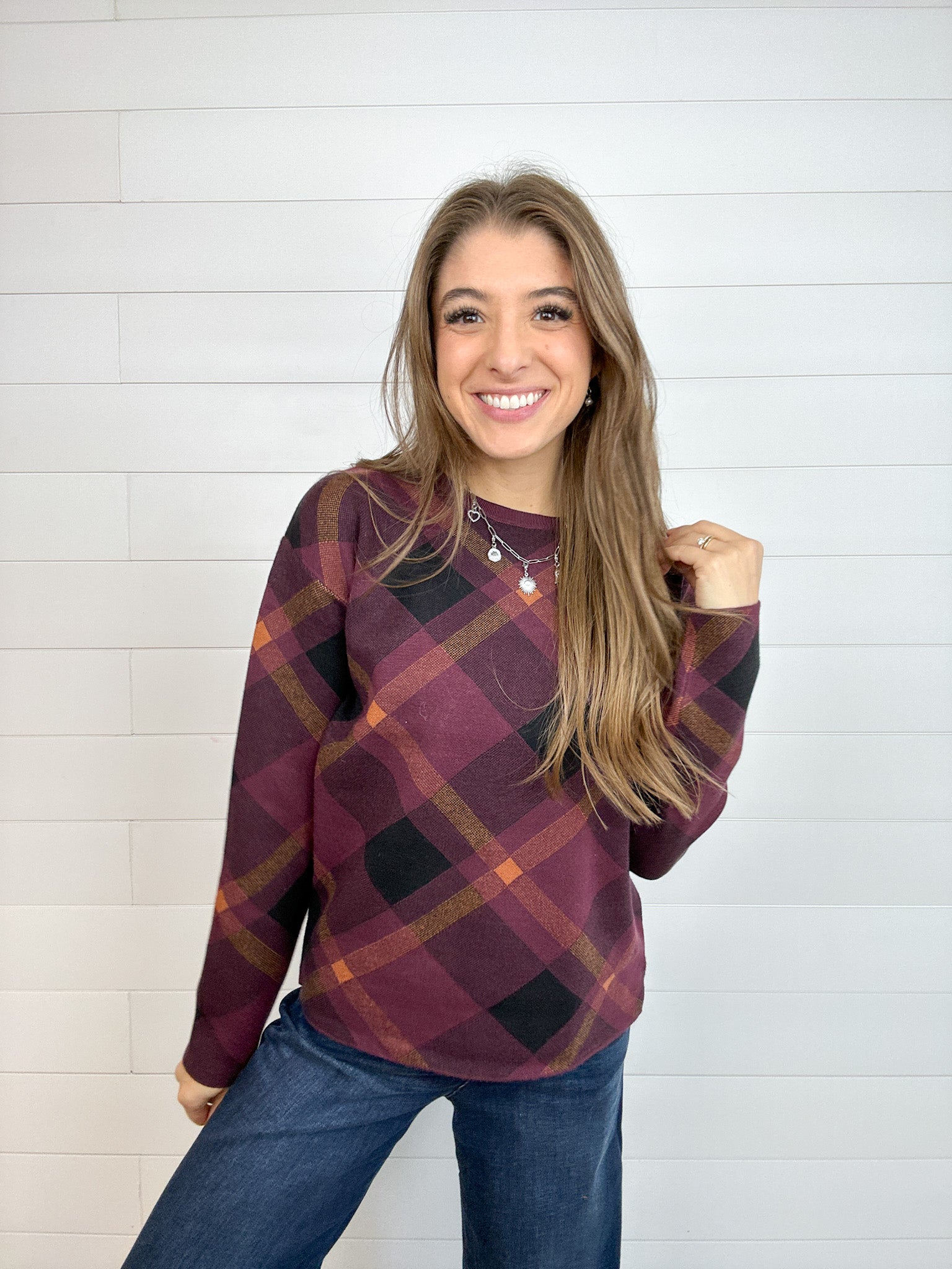 Classic fall vibes get a fresh twist with this Diagonal Plaid Pullover Sweater. Designed in bold, oversized plaid set on the diagonal, it brings movement and personality to a timeless pattern. Crafted from a super soft knit with a crew neckline and long sleeves, it’s the kind of sweater you’ll reach for when crisp days call.
