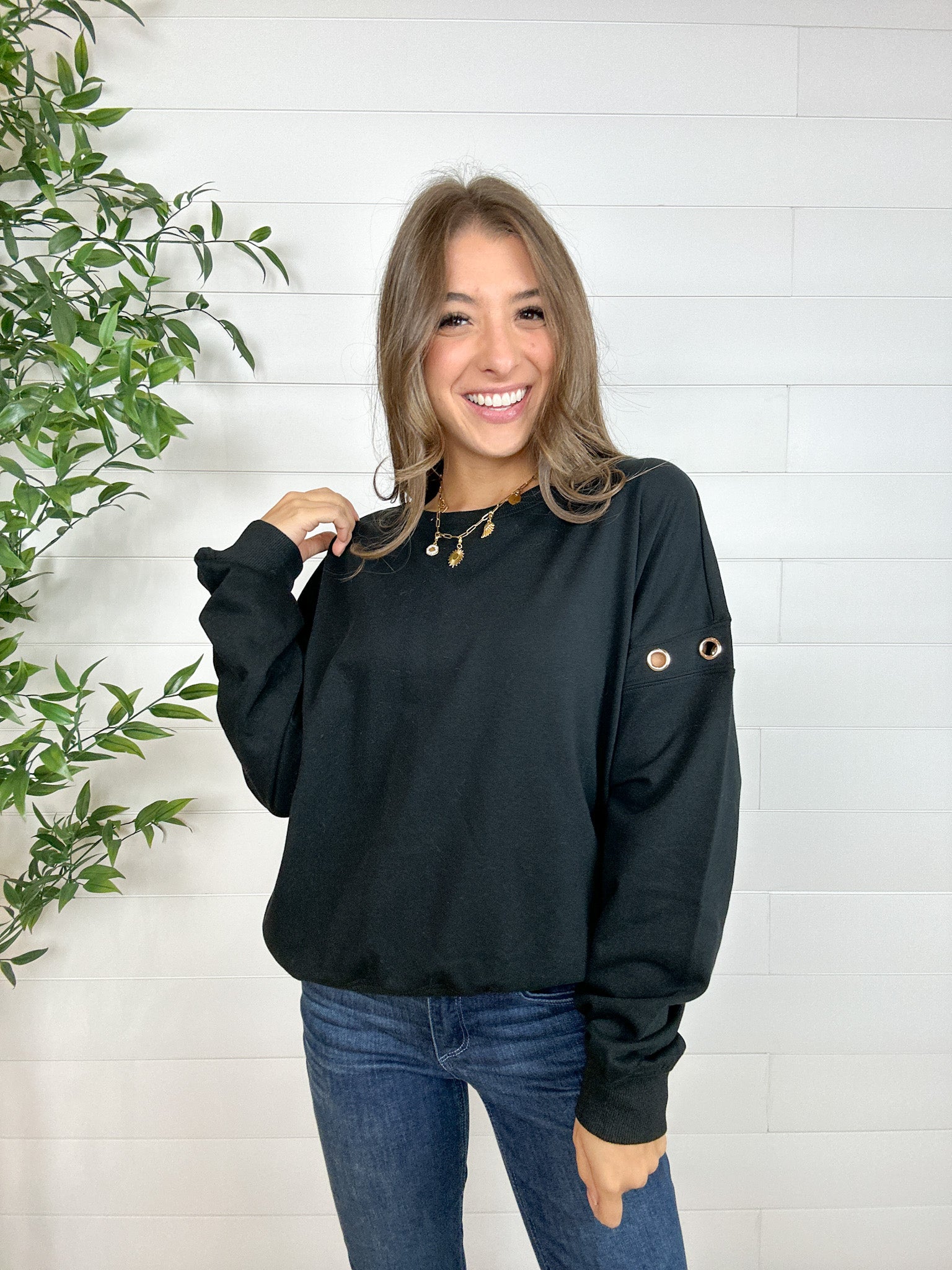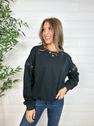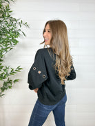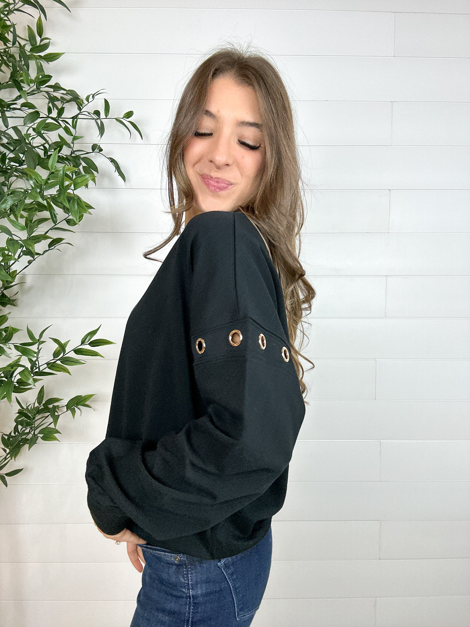 Bring a touch of bold to your cozy days with the Grommet Detail Drop Shoulder Sweatshirt. This relaxed, oversized piece stands out with metallic grommet accents running down each sleeve—perfect for adding just the right amount of attitude. Soft, comfy, and effortlessly cool, it’s the sweatshirt you’ll reach for again and again.