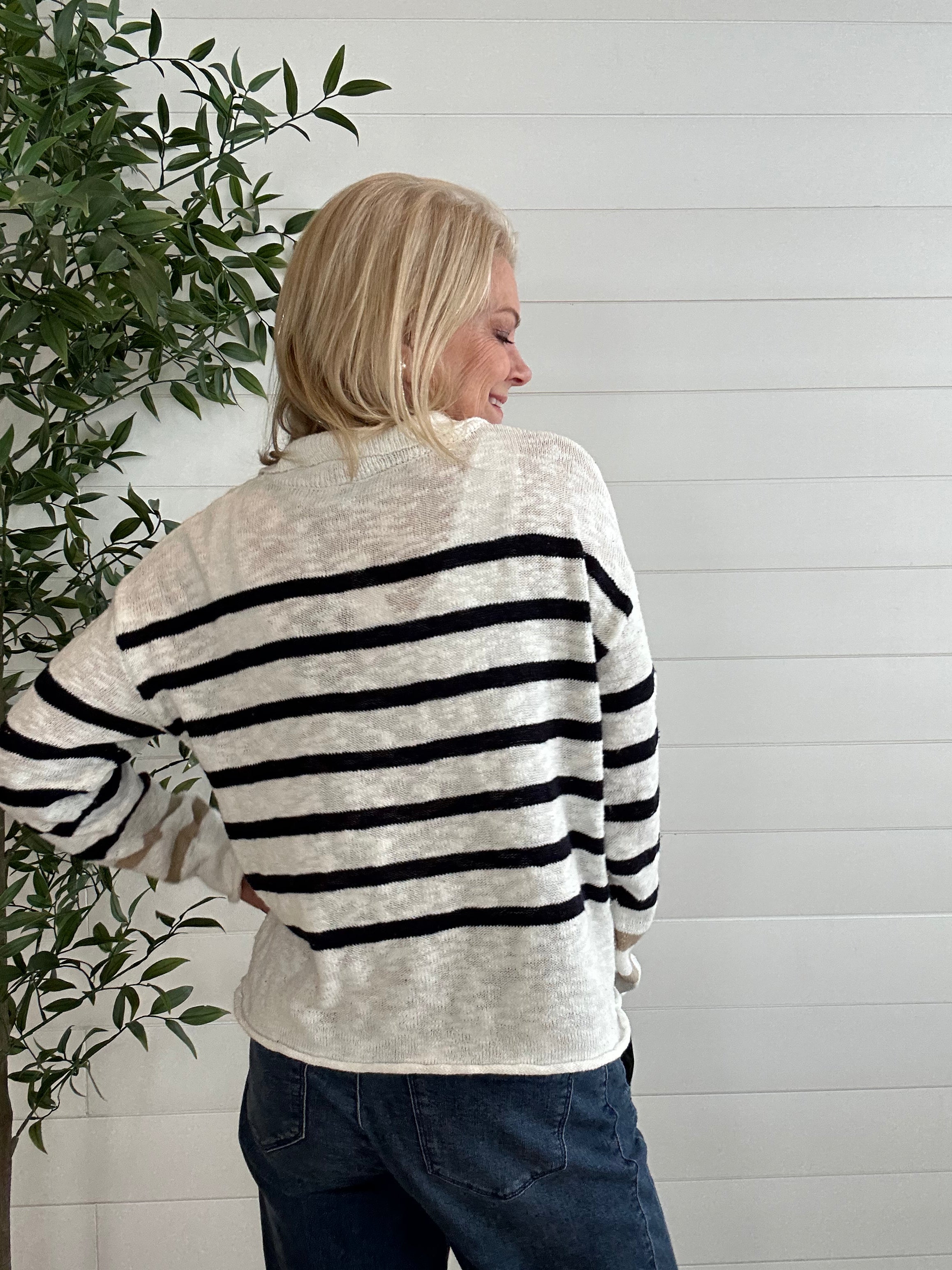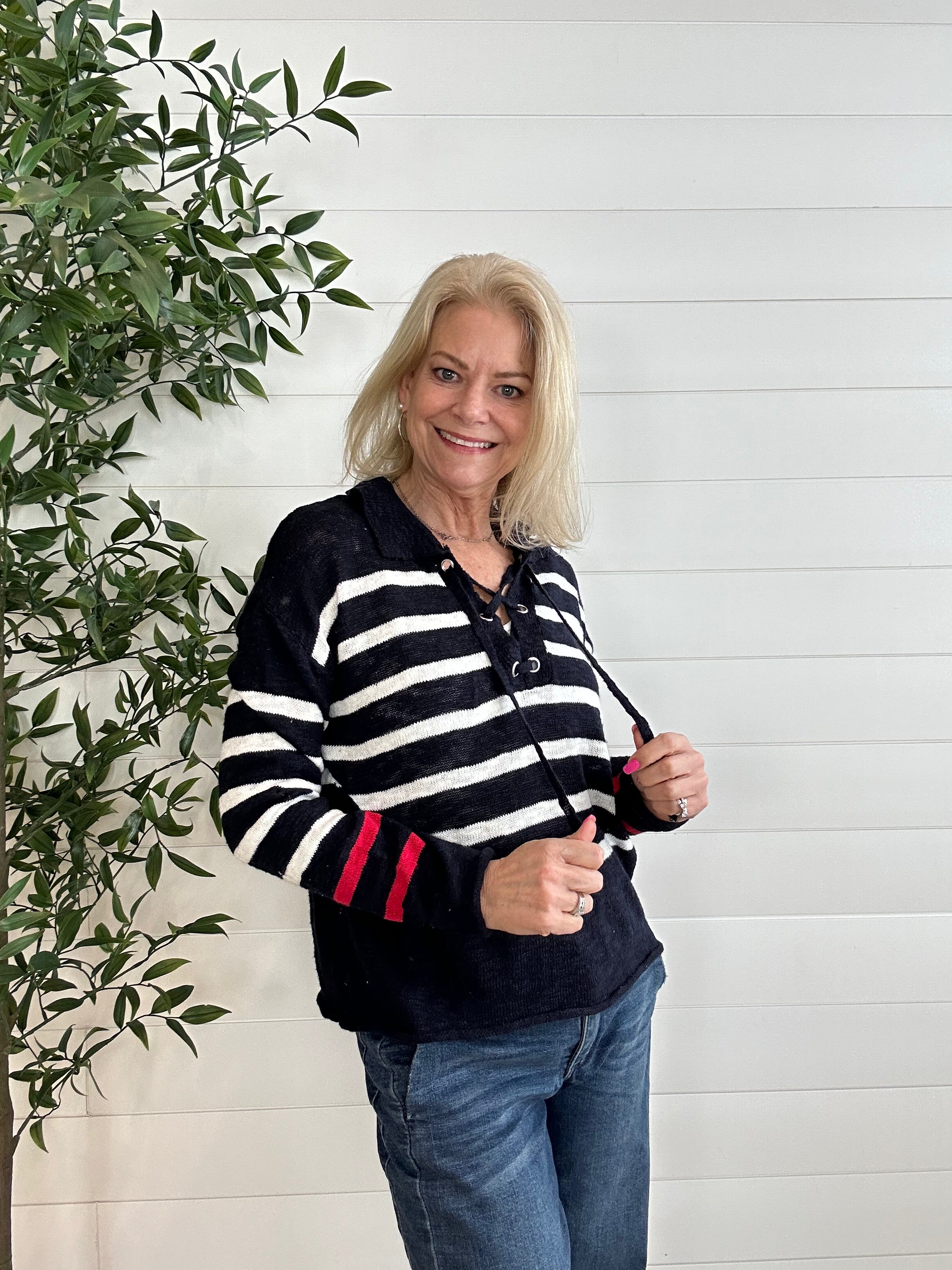 The Grommet Front Tie Sweater brings a fresh, nautical-inspired twist to a classic silhouette. Designed with statement grommet detailing and a front tie accent, this sweater adds just the right amount of edge while keeping the look polished. The soft knit construction offers comfortable wear, while the relaxed fit makes it easy to style for everyday outings or coastal getaways. It’s a standout piece that balances playful detail with effortless sophistication.