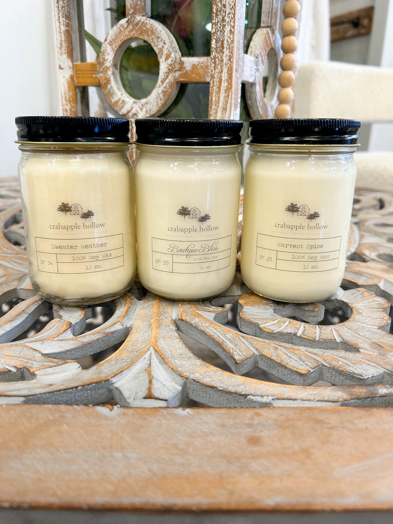 Fragrance: Boutique Bliss, Sweater Weather and Harvest Spice – soft, inviting, and uplifting