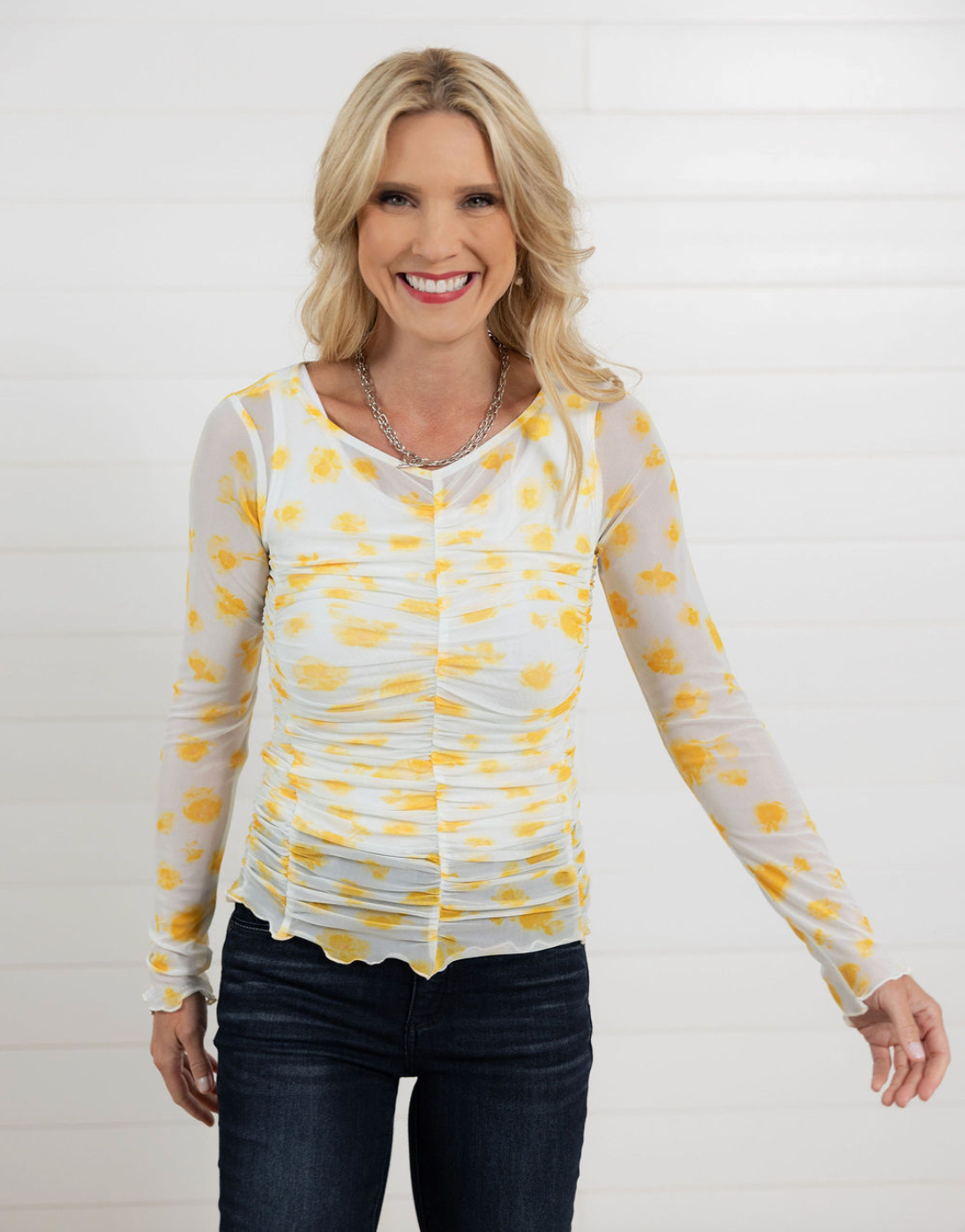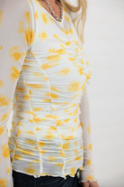 The Lettuce Hem Printed Ruched Mesh Top is the ultimate pretty layering piece with just the right amount of drama. Designed in a lightweight floral mesh, this top features ruching along the front, sides, and back for a beautifully contoured, body-skimming fit. The V-neckline keeps it soft and feminine, while the lettuce-edge hem adds a delicate, fashion-forward finish. Stretchy, comfortable, and endlessly versatile, it’s perfect for elevating everyday outfits or layering under jackets and knits.