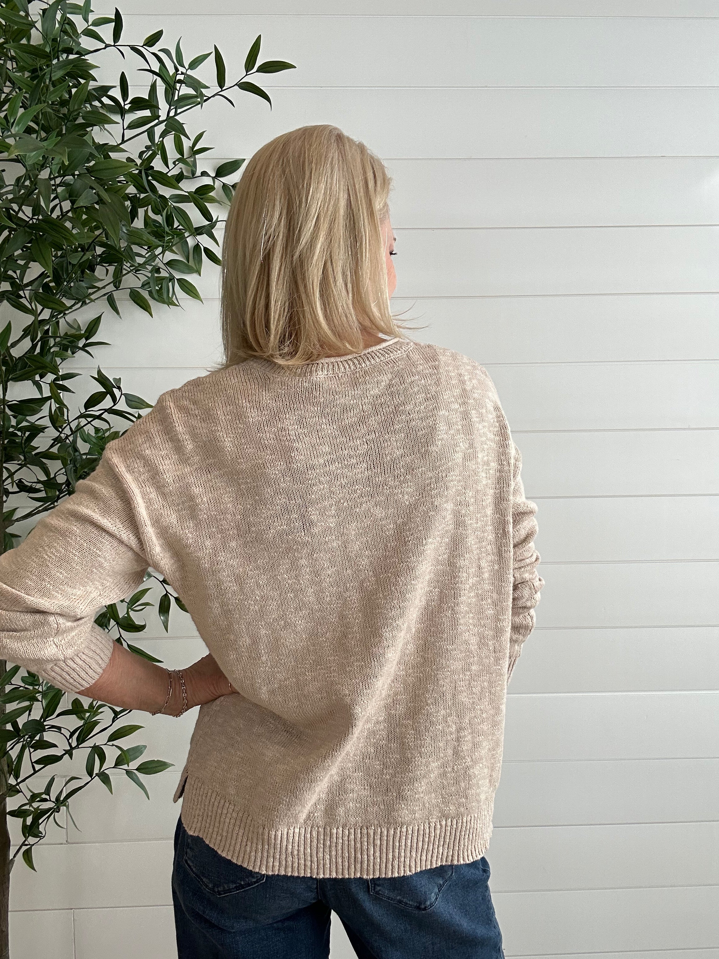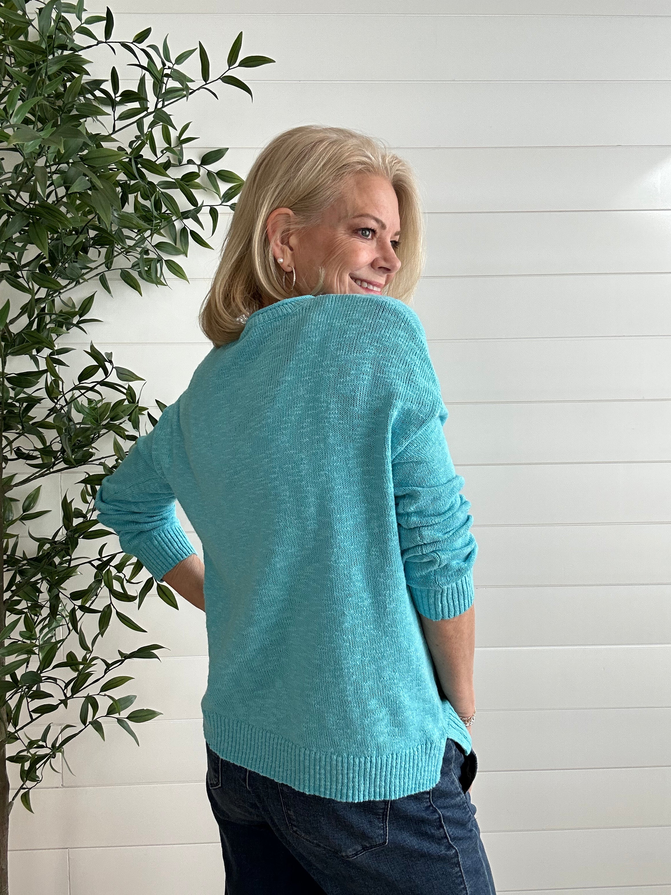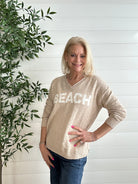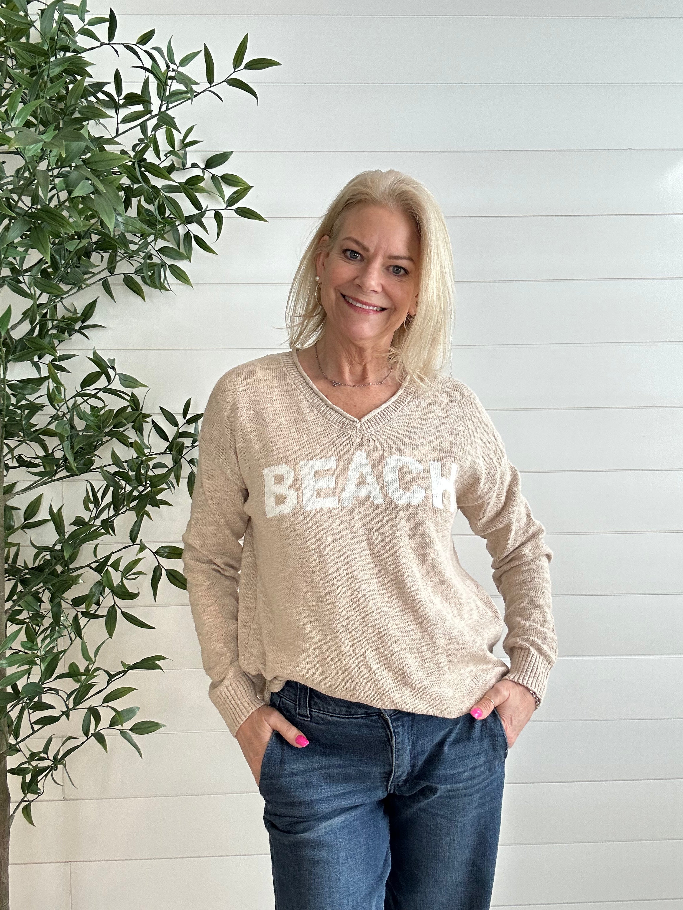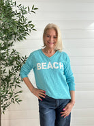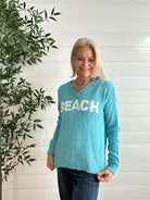 The Long Sleeve Solid V-Neck Sweater with Beach Graphic brings relaxed charm to everyday style. Designed with a flattering V-neckline and comfortable long sleeves, this sweater offers an easy, wearable silhouette. The beach-inspired graphic on the front adds a laid-back, feel-good touch that feels both playful and polished. Soft and lightweight, it’s perfect for transitional weather, travel days, or simply adding a little sunshine to your wardrobe.
