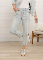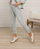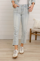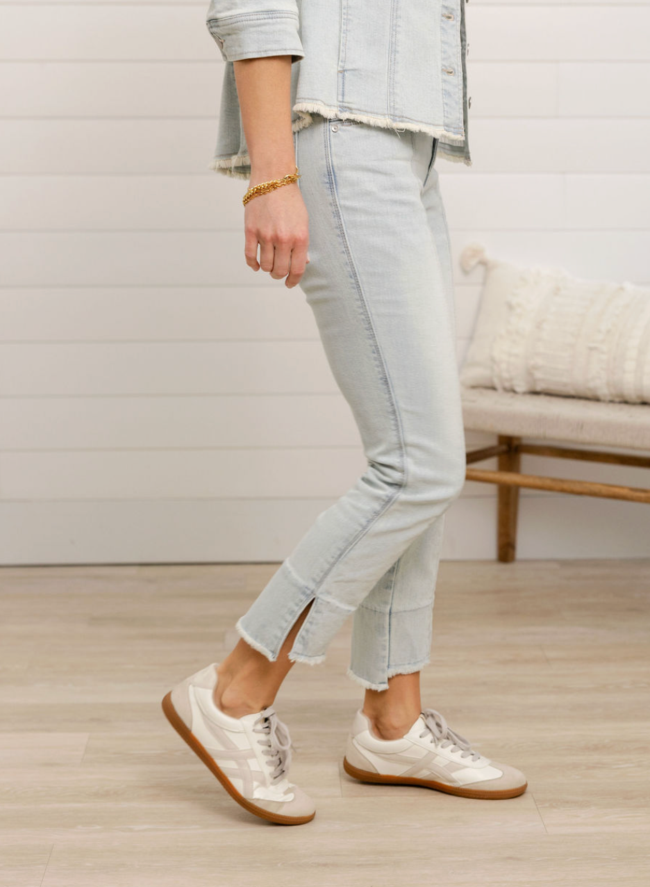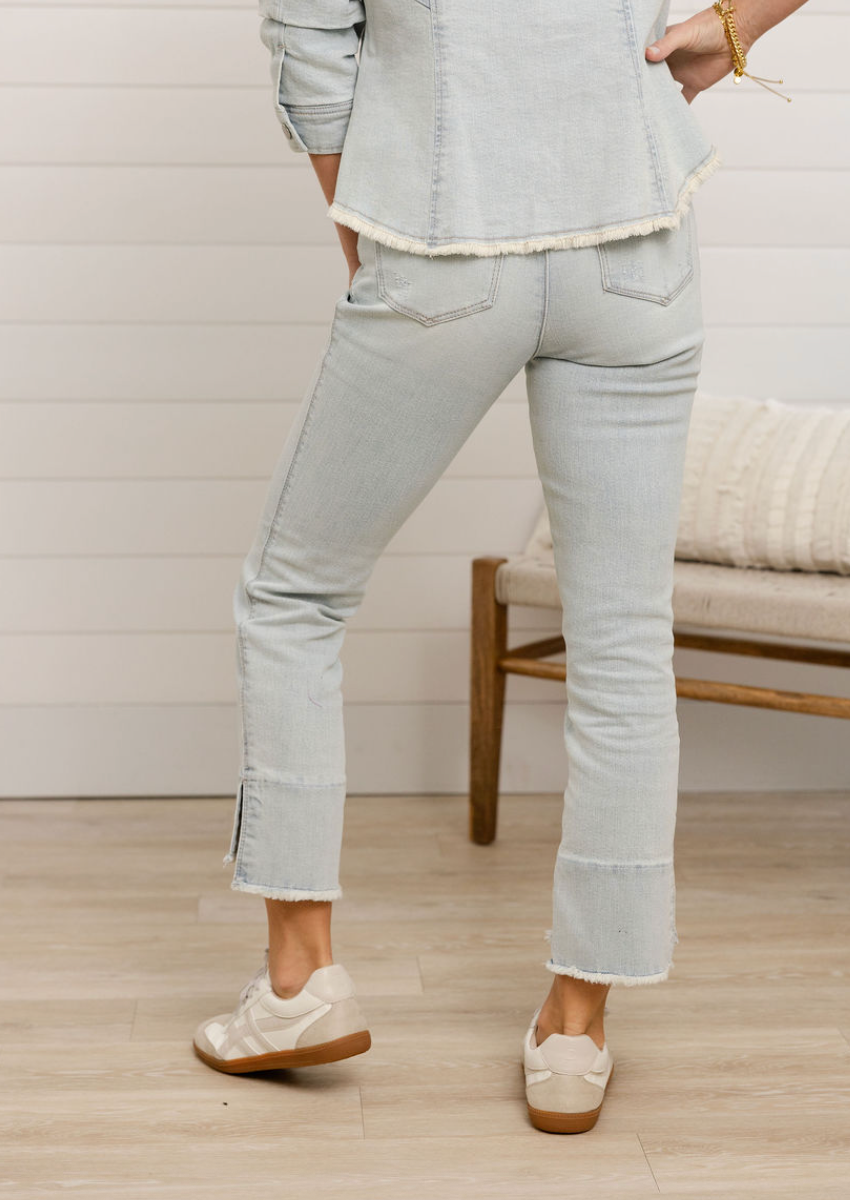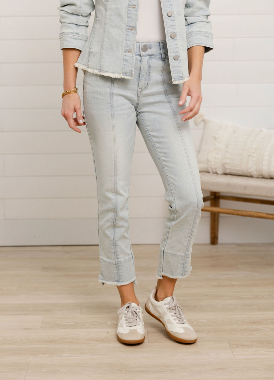 The Mac and Me Bleached Blue Kick Flare w/ Fray Hem brings our beloved kick flare silhouette into a fresh, eye-catching wash. Designed in a cool bleached blue denim, this pair features a center front seam that creates a long, flattering line down the leg. The finished raw hem adds just the right amount of edge, while the cropped kick flare keeps the look modern and versatile. Comfortable, confidence-boosting, and endlessly wearable β plus thereβs a matching jacket for a head-to-toe moment.