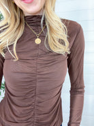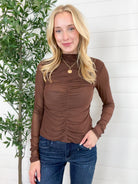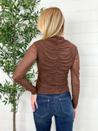 Our Mac and Me Ruched Front Mesh Top is that perfect mix of edgy and elegant. With its ruched detailing down both the front and back, this fitted mesh top adds texture, shape, and just the right amount of drama. The mock neckline gives it a polished touch, while the sheer long sleeves keep things flirty and fun.