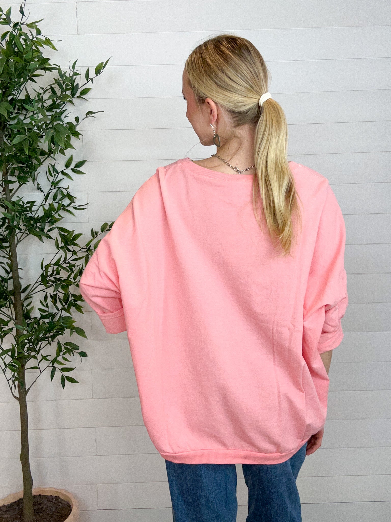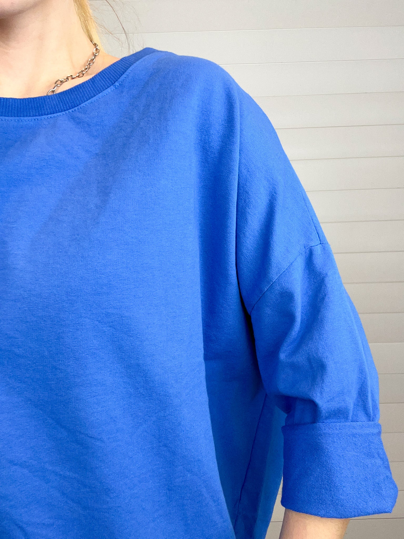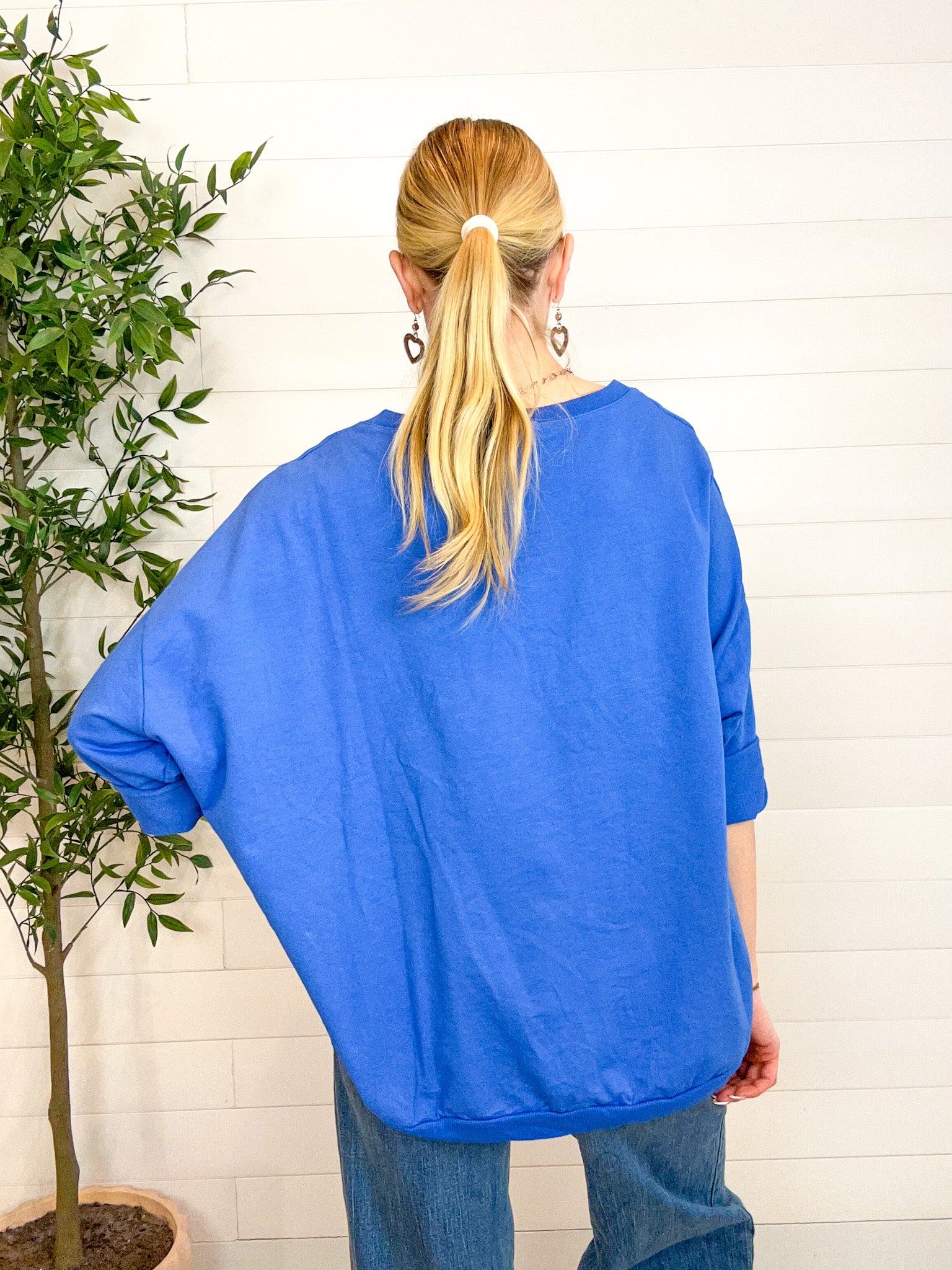 The Made in Italy Oversized French Terry Pullover is that perfectly relaxed layer you’ll reach for on repeat. Crafted from soft, stretchy French terry, this pullover features a wide neckline and drop shoulders for an easy, laid-back drape. The tacked, half-length rolled sleeves add a casual-cool touch, while the oversized silhouette delivers comfort without sacrificing style. Designed as a one-size-fits-most piece, it flatters a wide range of shapes with effortless charm.
