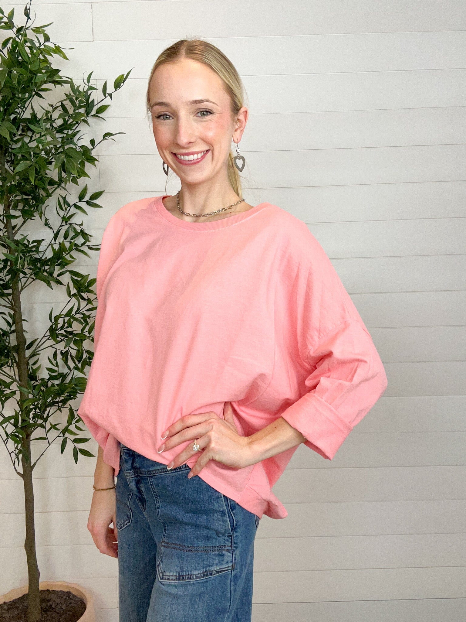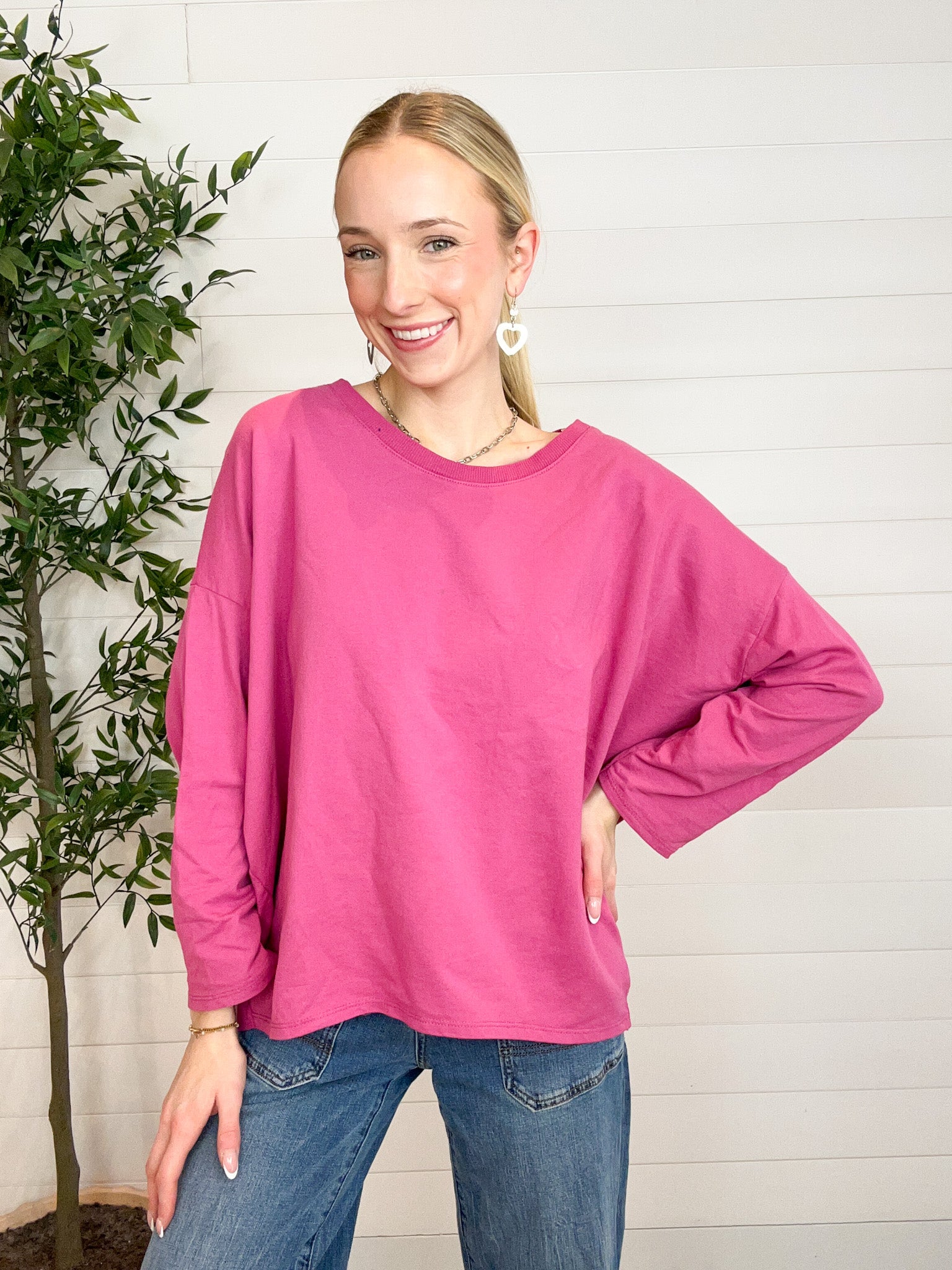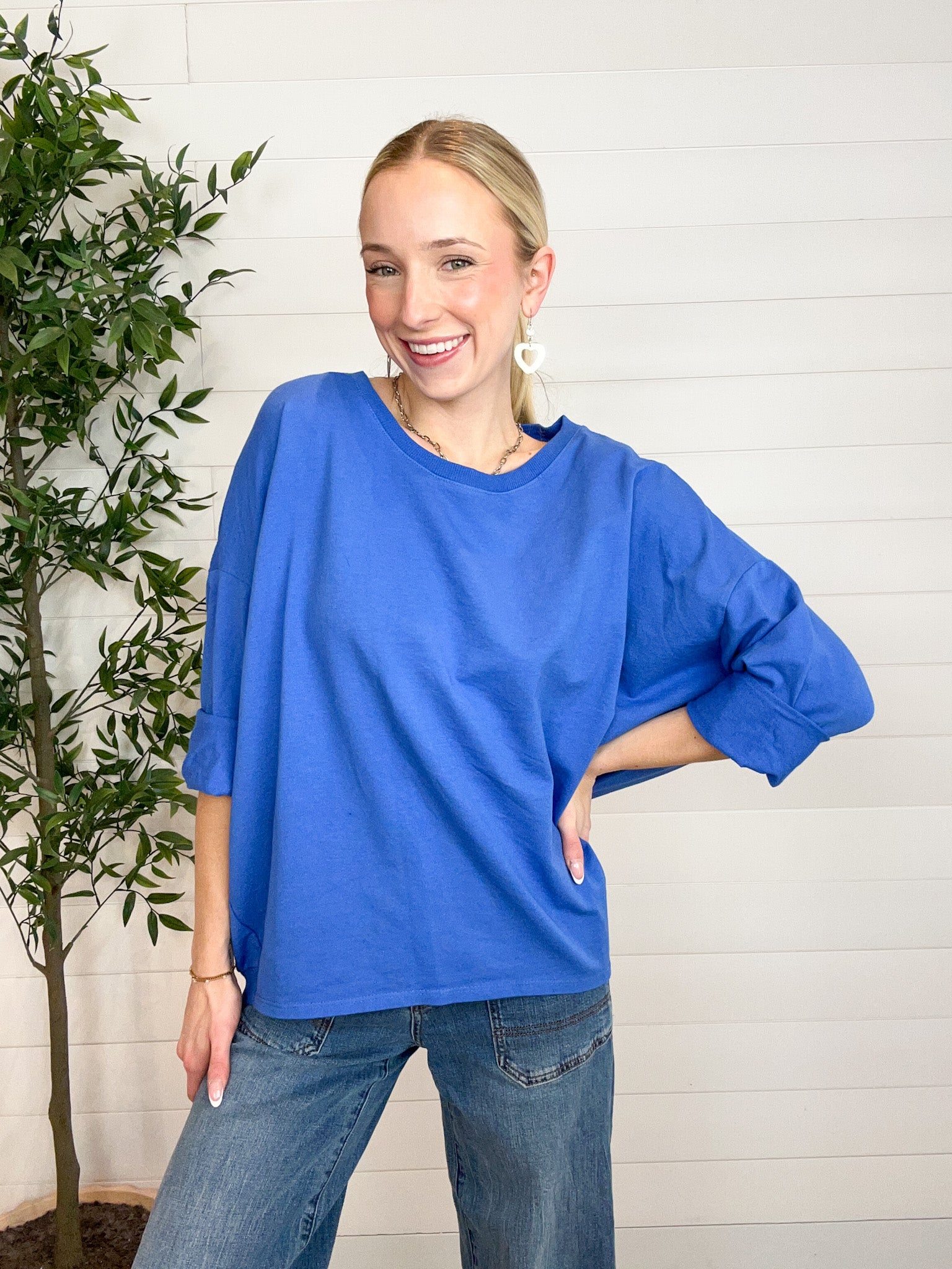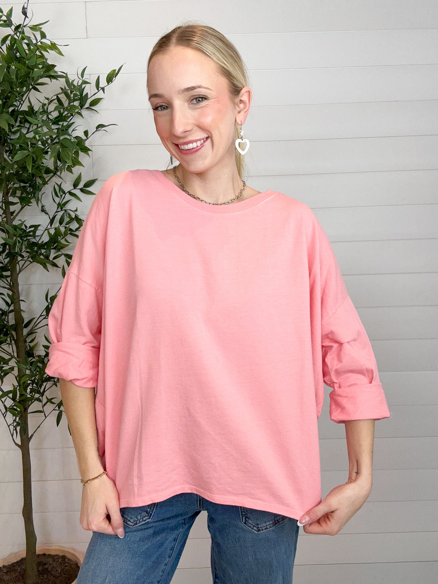 The Made in Italy Oversized French Terry Pullover is that perfectly relaxed layer you’ll reach for on repeat. Crafted from soft, stretchy French terry, this pullover features a wide neckline and drop shoulders for an easy, laid-back drape. The tacked, half-length rolled sleeves add a casual-cool touch, while the oversized silhouette delivers comfort without sacrificing style. Designed as a one-size-fits-most piece, it flatters a wide range of shapes with effortless charm.