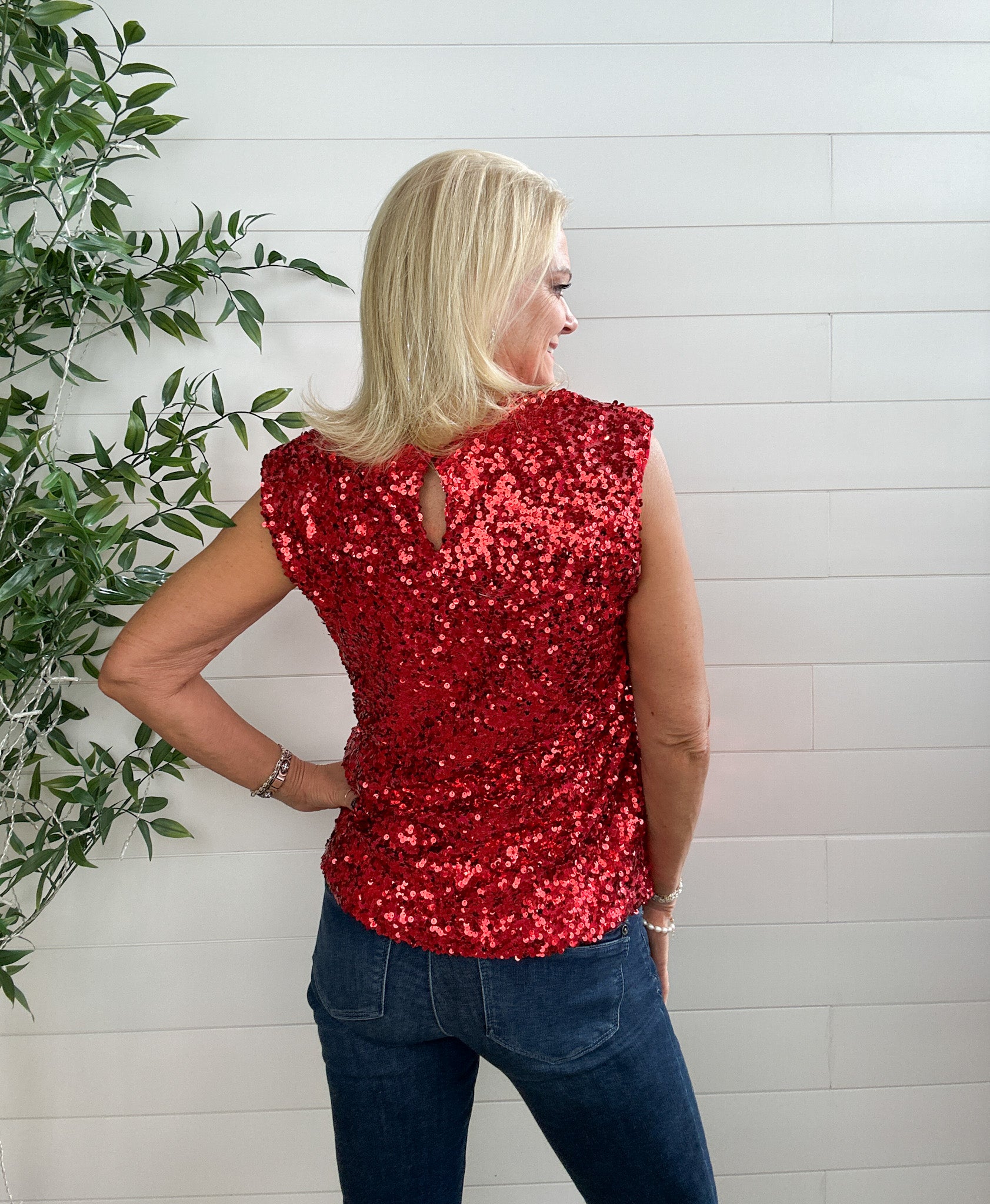 Slip into something fabulously fun with this Made in Italy Sequin Sleeveless Top — the perfect little shimmer piece for meet-and-greet moments, holiday parties, or anytime you want to shine just a little brighter.