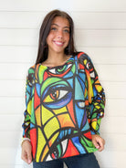 Turn heads in the Made in Italy Stained Glass Eye Sweater. Featuring a vibrant, Picasso-inspired cubism eye print in bright, multicolor hues, this sweater brings wearable art to your wardrobe. The boat neckline and bracelet-length sleeves offer a flattering fit that’s perfect for layering or wearing solo.