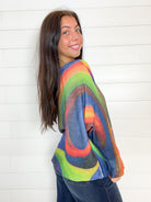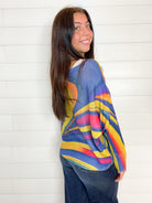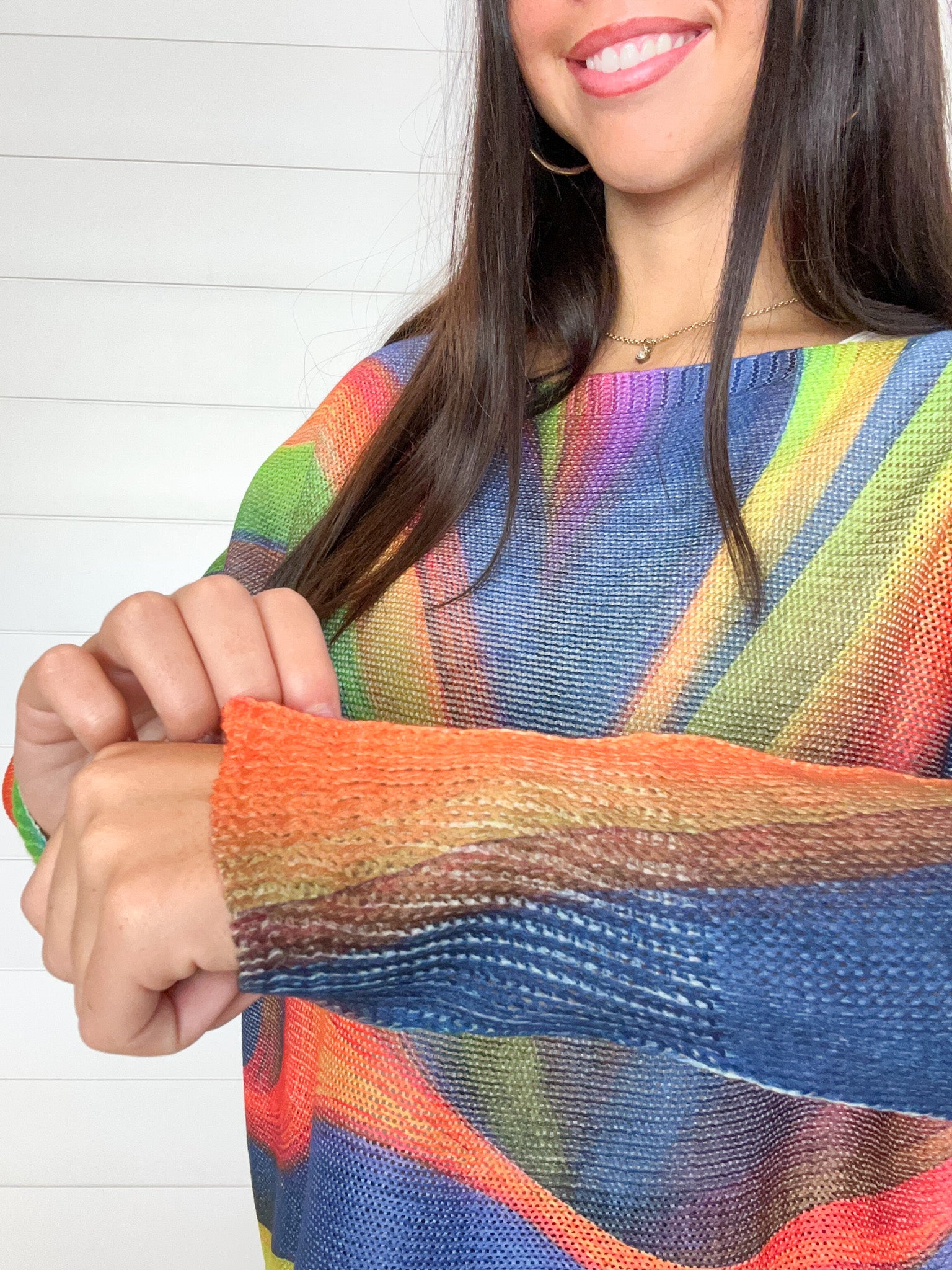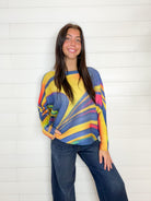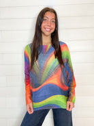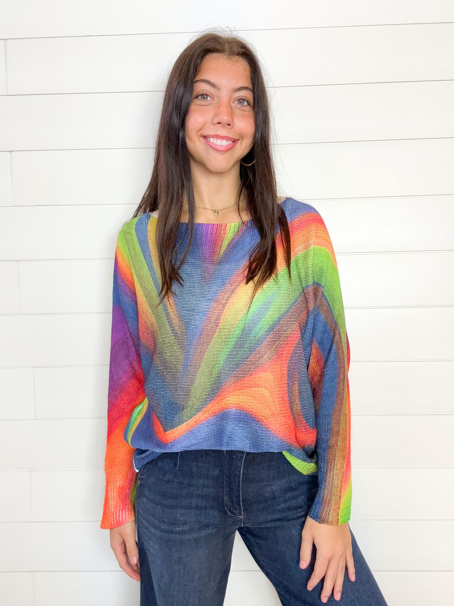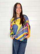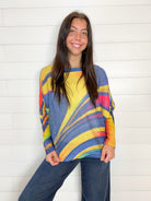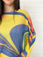 This Made in Italy Rainbow Swirl Sweater is an instant conversation starter—part ocean dreamscape, part retro sunset, all fabulous. Set against a rich blue background, the swirling patterns explode in sunset tones: one colorway dances with kiwi green and juicy orange, while the other pops with zesty lemon yellow and bold magenta. The boatneck and half sleeves keep the silhouette chic and easy, letting the print take center stage.