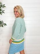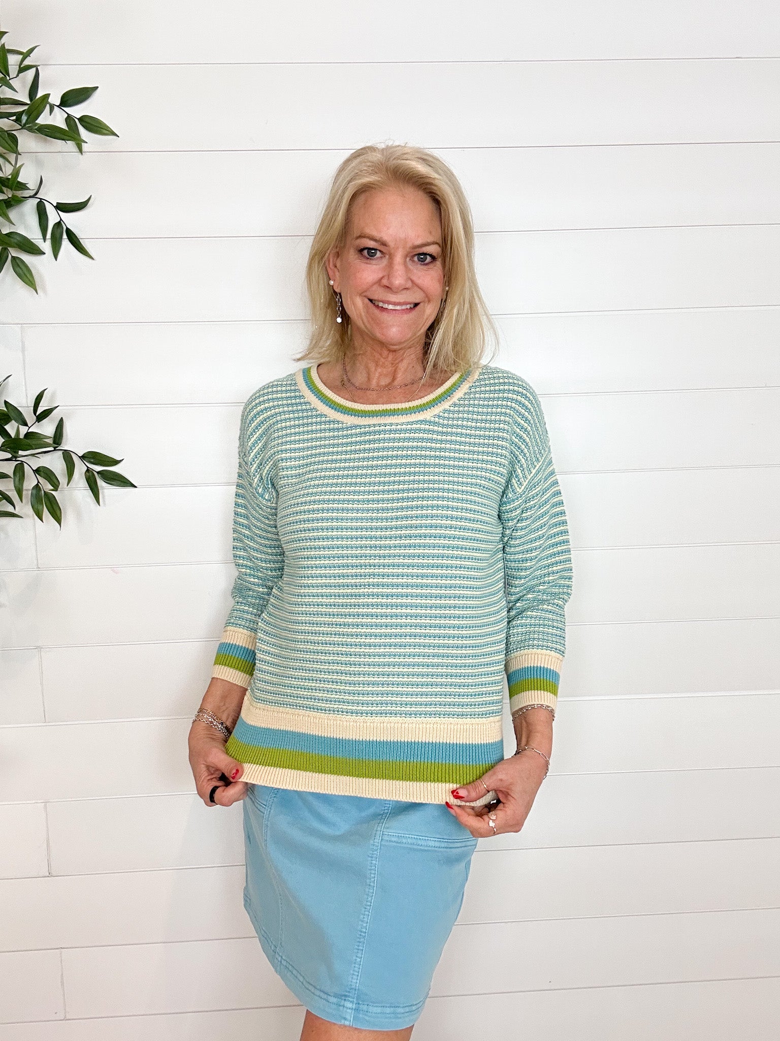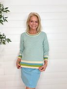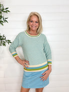 The MB Stripe Weave Scoop Neck Sweater is a beautifully balanced take on classic stripes. Crafted from breathable 100% cotton, this sweater features a subtly textured striped weave throughout the body, pulling together the same hues highlighted at the neckline, cuffs, and hem for a cohesive, elevated look. The scoop neckline feels soft and flattering, while the ¾-length sleeves keep it easy and versatile. Polished yet relaxed, it’s a wear-anywhere knit you’ll reach for again and again.