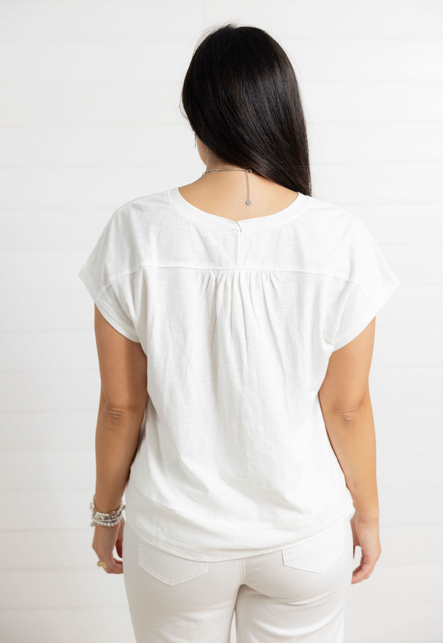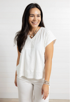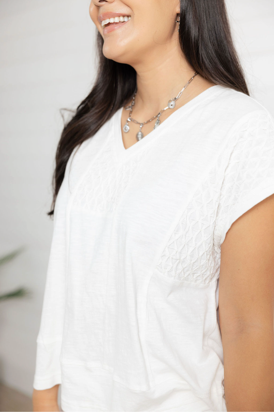 The MB Textured Cap Sleeve Top is an elevated everyday essential with just the right amount of detail. Designed with a flattering V-neckline and easy cap sleeves, this top features tonal diamond-textured sections that add depth and visual interest without feeling busy. The slightly oversized fit keeps it relaxed and comfortable, while the soft cotton-viscose blend gives it a lightweight, breathable feel. Polished, versatile, and easy to wear — this is the kind of top that quietly does it all.