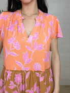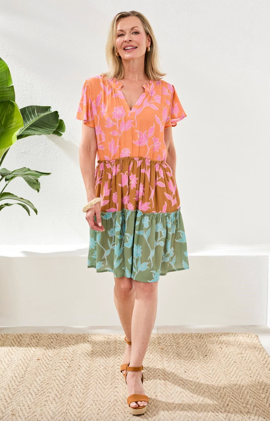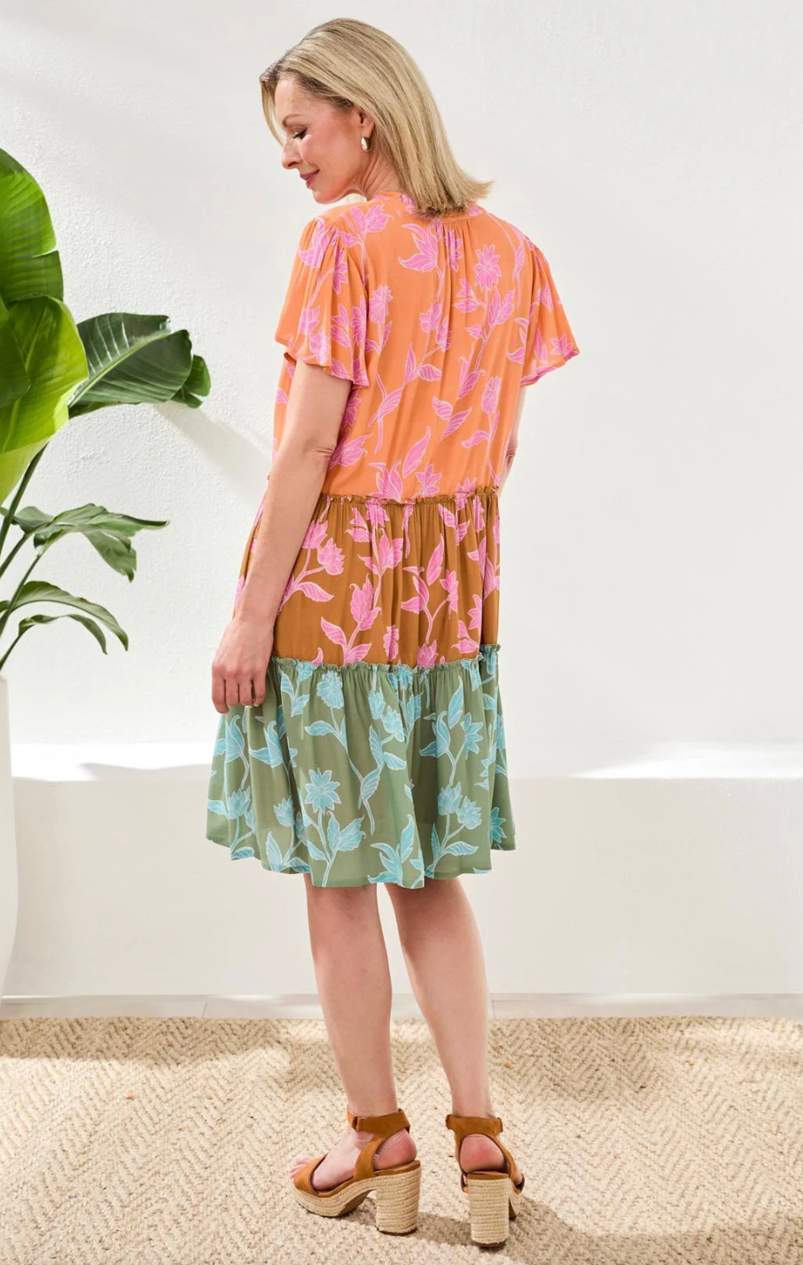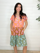 The MB Tri-Color Tiered Floral Dress is made for breezy days and effortless style. Crafted from lightweight crepe, this midi dress flows beautifully with every step, thanks to its airy drape and multi-tiered skirt. The bold tri-color floral pattern brings instant sunshine to your look, while flutter sleeves and a ruffled split neckline keep the silhouette soft and flattering. Relaxed, easy, and full of movement — it’s the kind of dress that feels just as good as it looks.