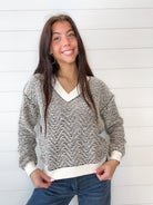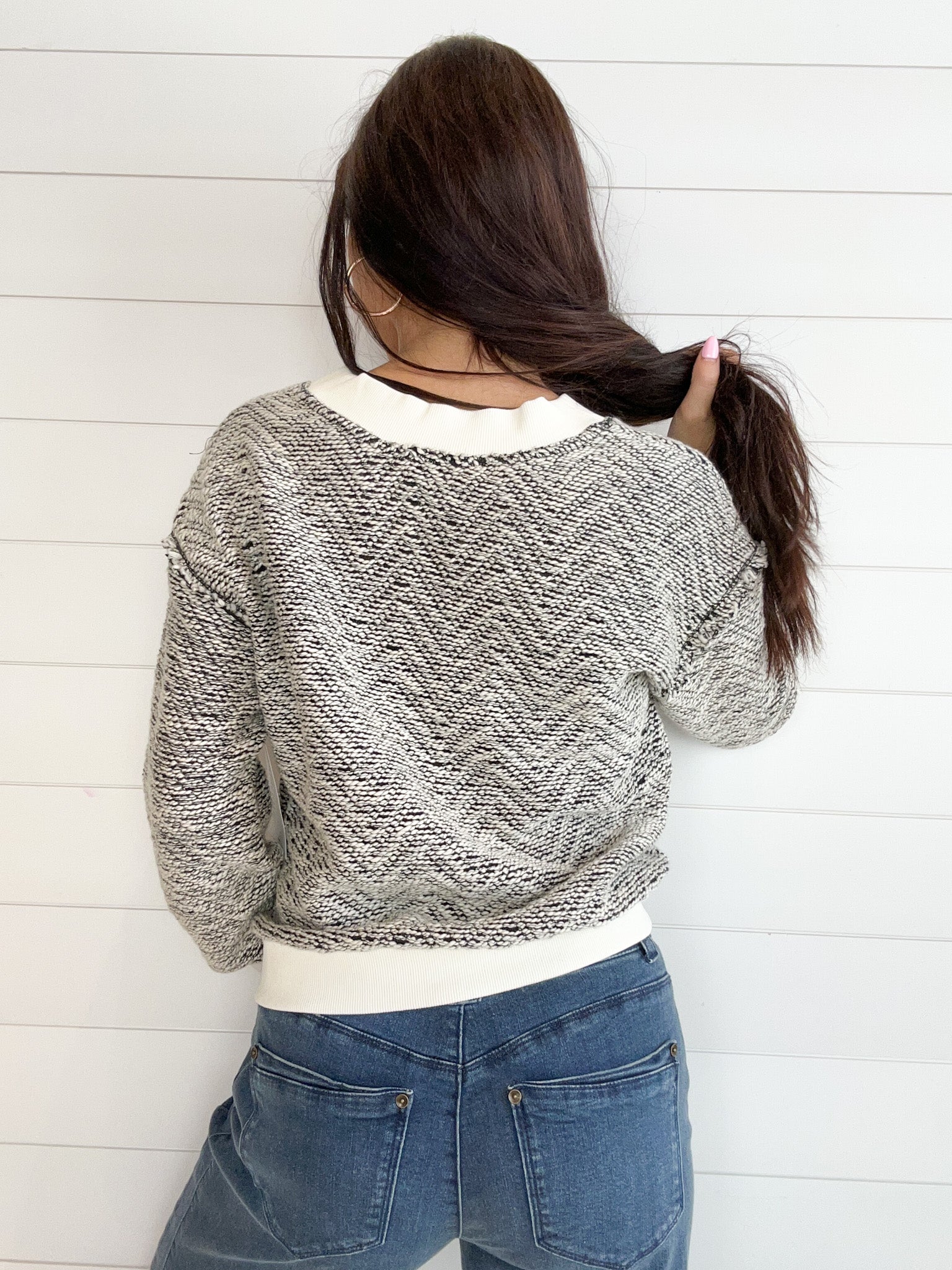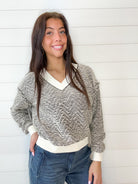 Wrap yourself in cozy comfort with a lightweight top crafted from eye-catching two-tone textured yarn for a modern twist on knitwear. Long sleeves and drop shoulders create a relaxed silhouette, while ribbed detailing at the hem, cuffs, and V-neckline adds a refined, polished finish.