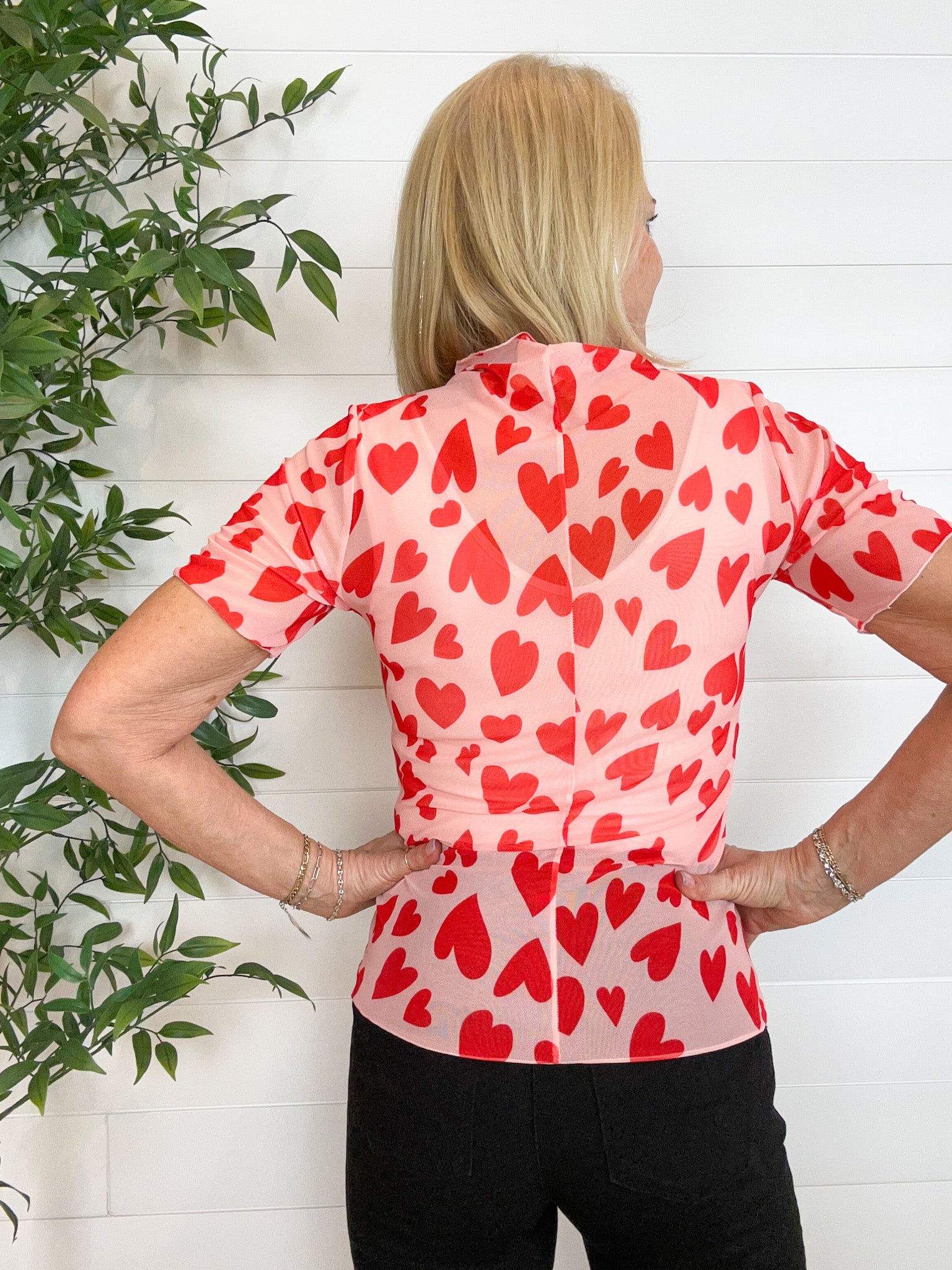 The Mesh Short Sleeve Printed Hearts Top is the perfect layering piece when you want a little something extra. Designed in a stretchy mesh fabric, this fitted top features an allover heart print, a chic high neckline, and flattering half sleeves. Lightweight and breathable, it hugs just right without feeling tight, making it ideal for styling under jackets, sweaters, or vests β or wearing solo for a subtly bold look.