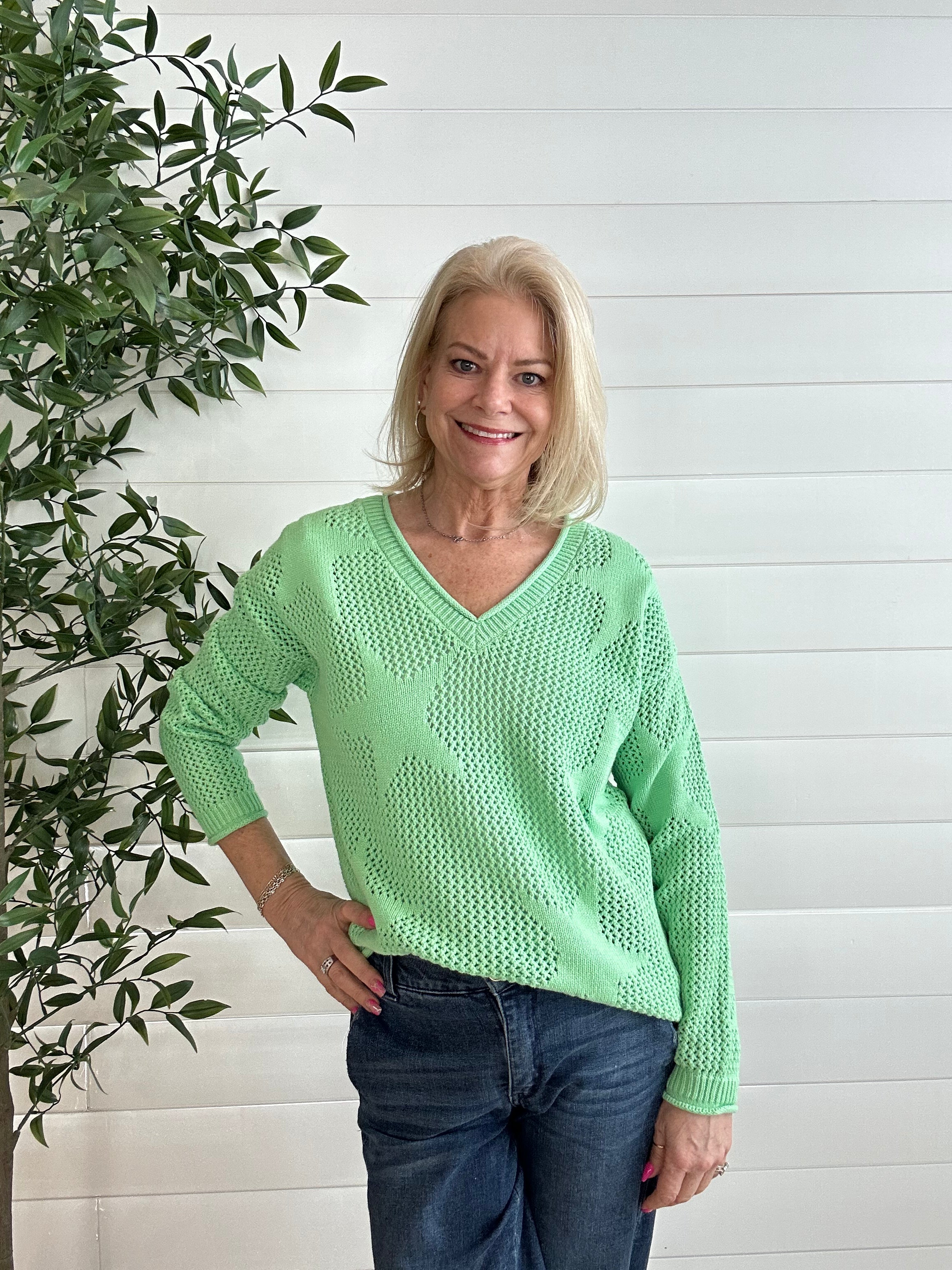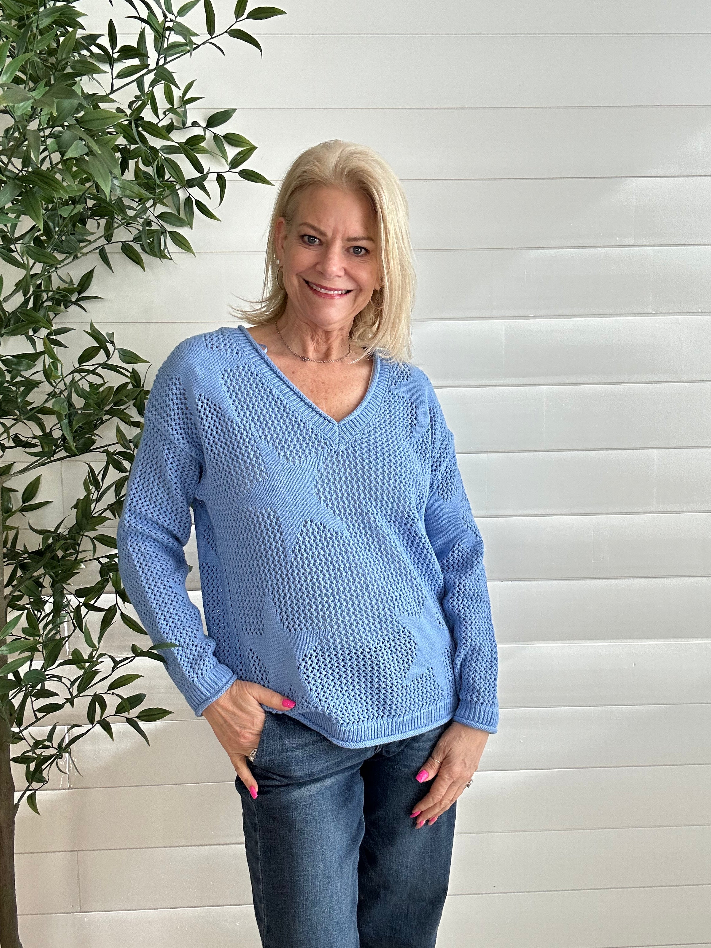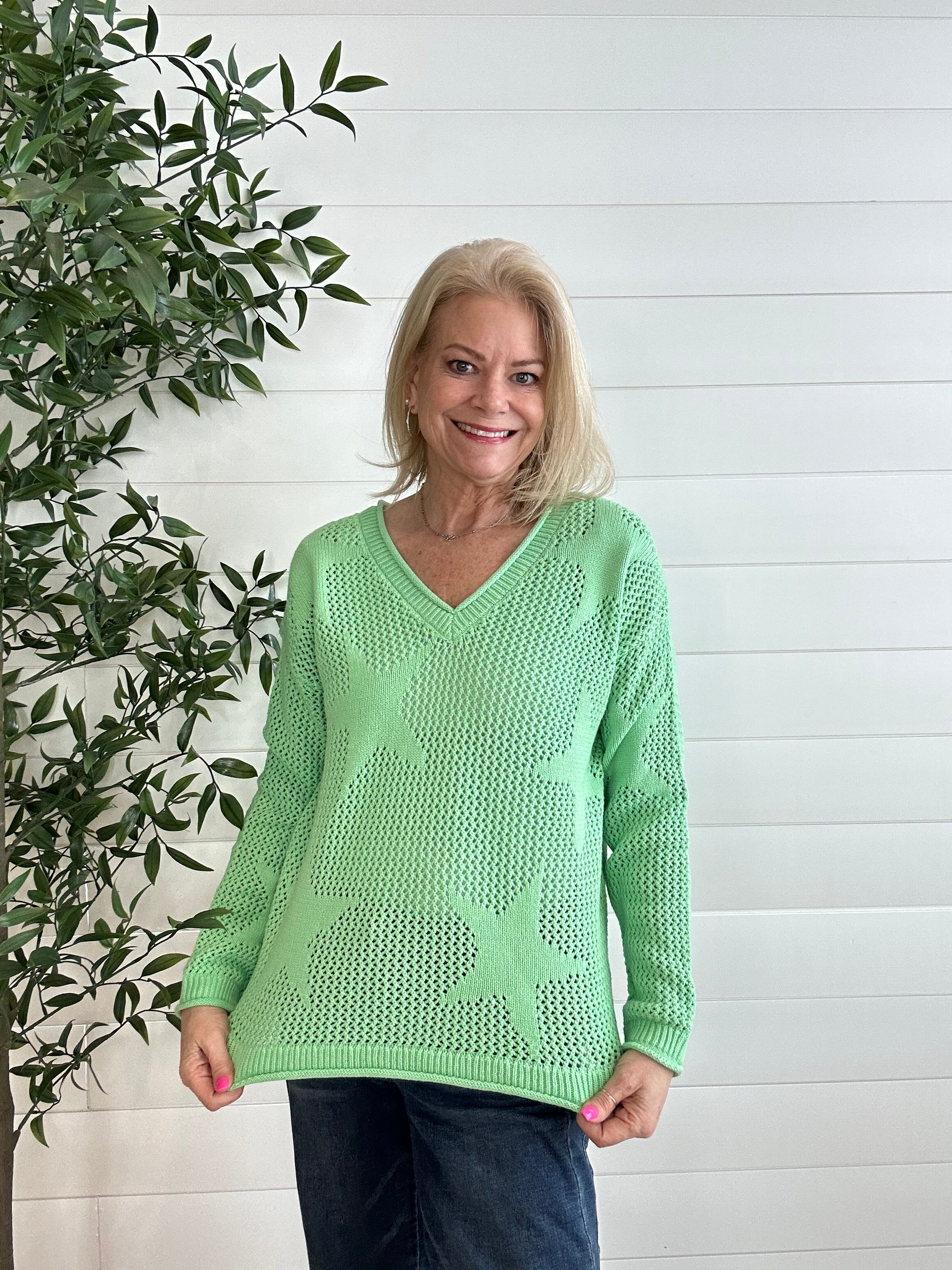 This star mesh sweater is the playful layering piece your closet didn’t know it needed. Lightweight and airy with an allover star design, it gives just the right amount of edge while still feeling soft and wearable. The relaxed fit makes it easy to throw on, and the subtle sheer mesh keeps it effortlessly on-trend. It’s that cool-girl statement piece that still feels totally everyday.