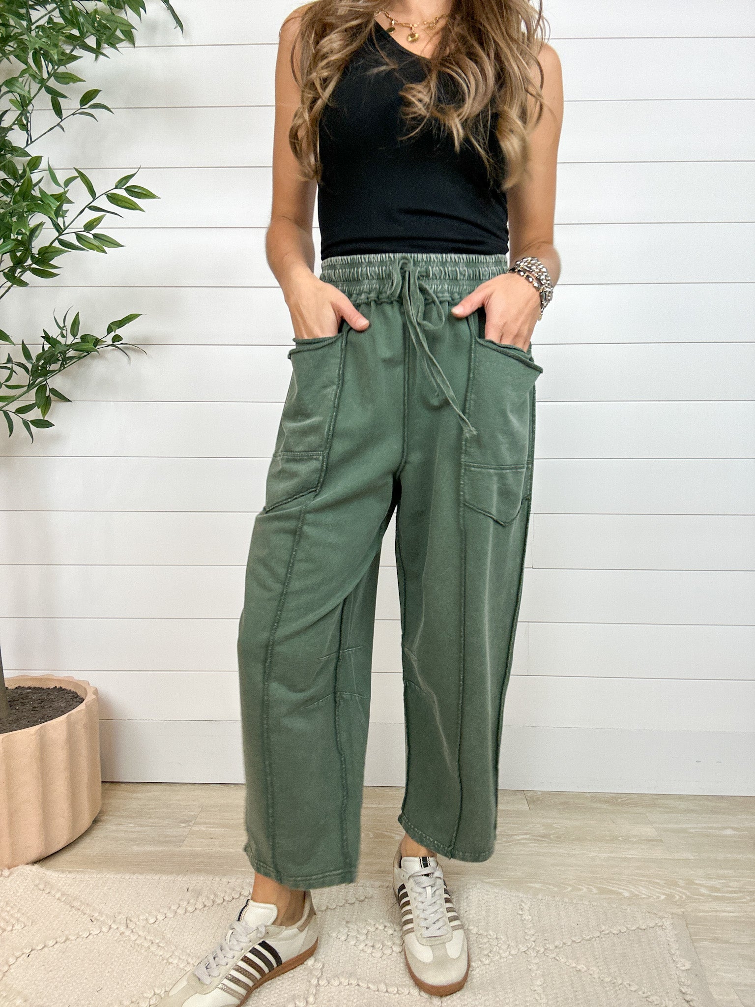 The Mineral Wash Double Pocket Barrel Pants bring that perfectly relaxed, weekend energy. Made from 100% cotton terry knit, they feature a cool mineral-washed finish for that soft, vintage look and feel. With a roomy barrel leg, exposed seams, and plenty of pockets, these pants are effortlessly comfy — and totally on-trend.