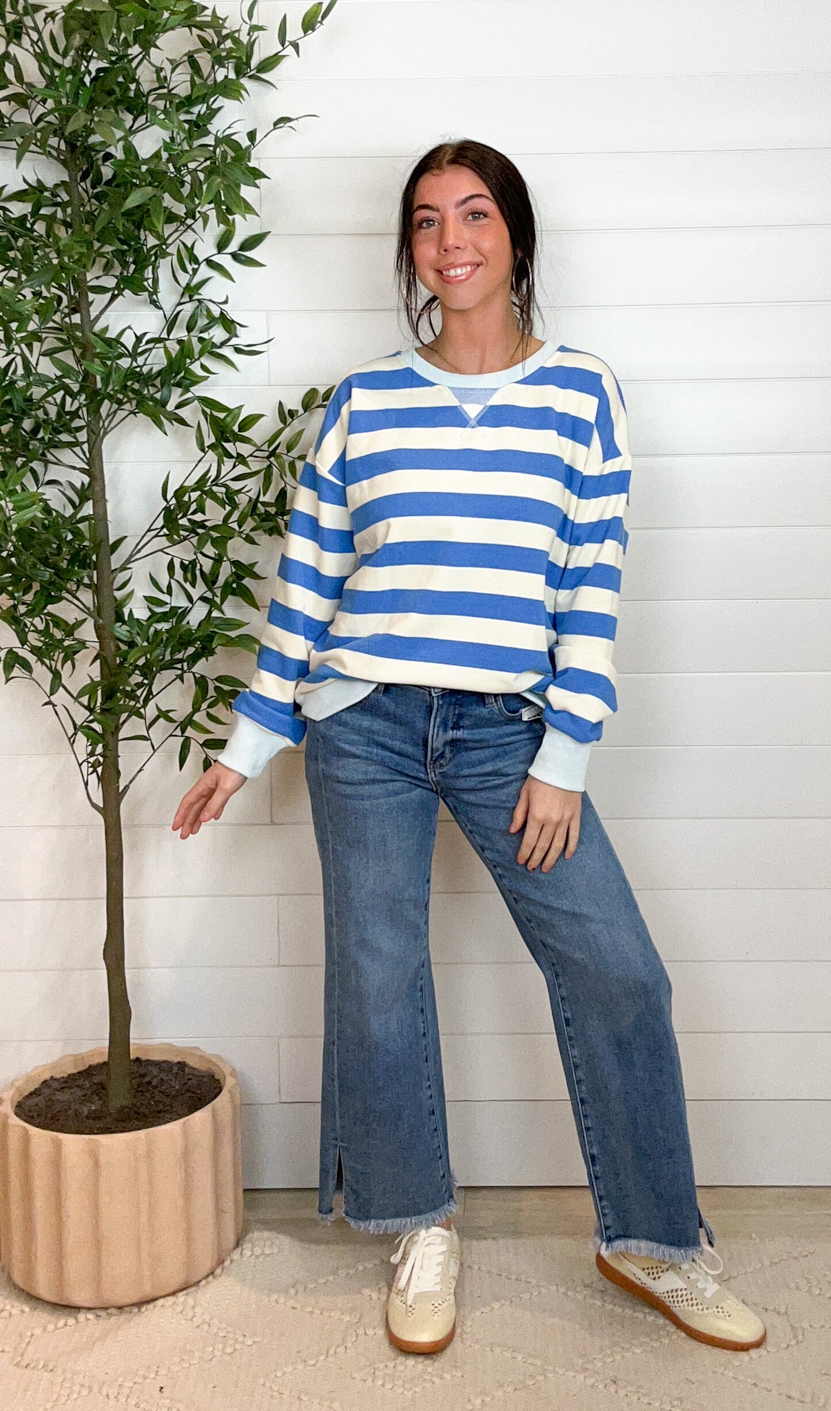 The Oversize French Terry Striped Sweatshirt is a classic you’ll reach for again and again. Made from soft French terry, this sweatshirt features an easy oversized fit that feels relaxed without looking sloppy. The timeless stripe pattern keeps it clean and versatile, while the wide cuffs and hem add a subtle contrast detail that elevates the look just enough. Cozy, comfortable, and endlessly wearable — it’s the kind of staple that works year after year.