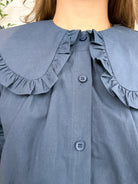 Our Peter Pan Frill Collar Button Up Shirt blends classic tailoring with a touch of romance. Crafted from crisp 100% cotton, this blouse features a wide Peter Pan collar trimmed with double-layered ruffles for an irresistibly feminine finish. The lightly puffed sleeves and gathered cuffs add just the right amount of volume, making it a timeless yet charming piece for any season.