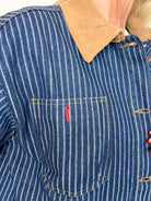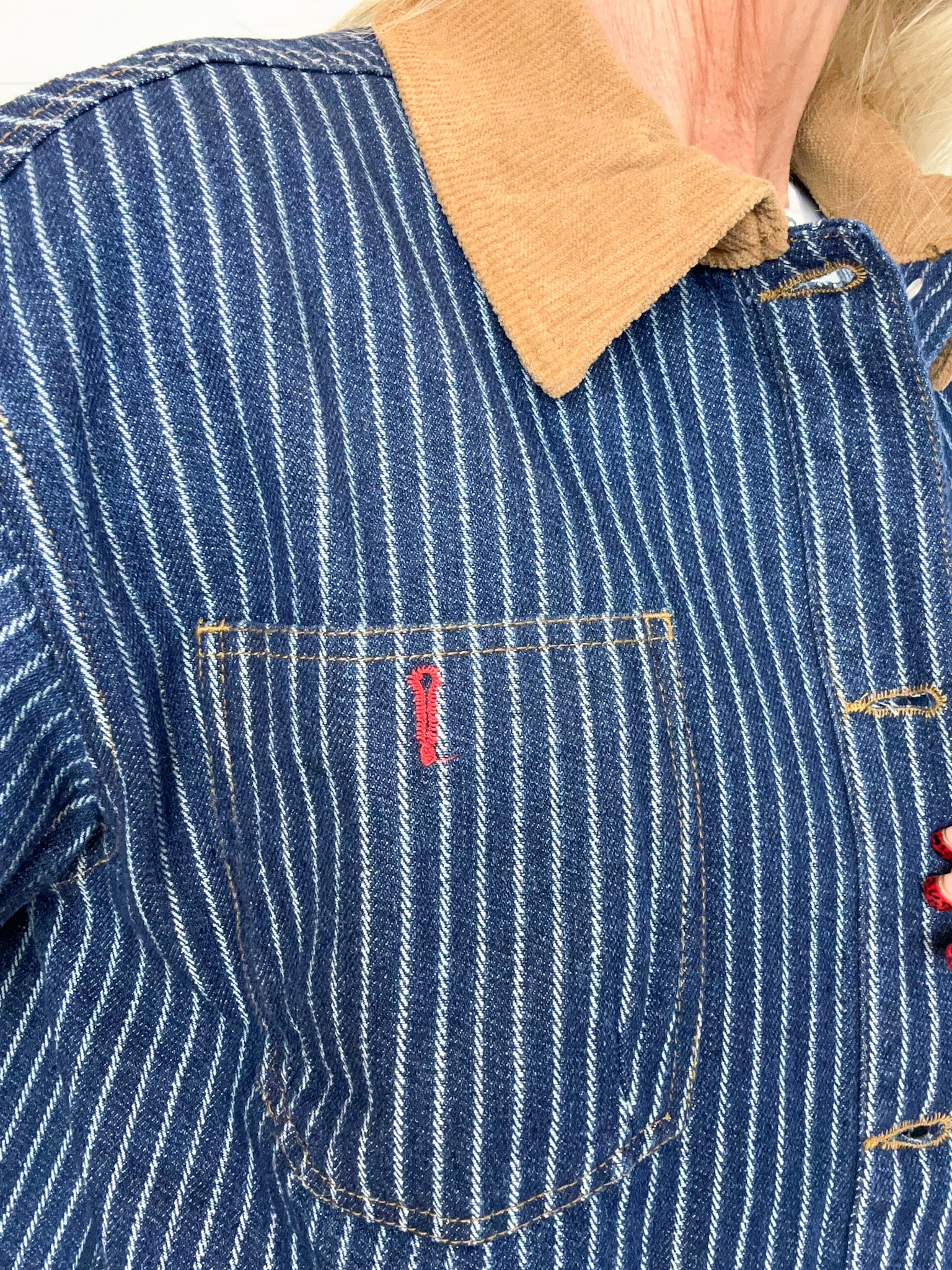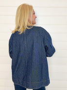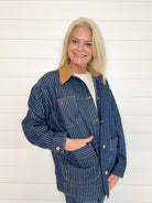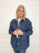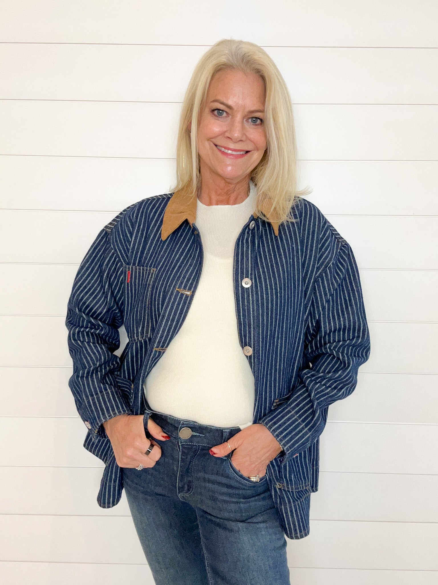 Classic meets cool in the Railroad Stripe Cord Trim Jacket — a vintage-inspired denim shacket with timeless railroad stripes and a soft corduroy collar. The relaxed fit and longer body make it perfect for layering, whether you’re keeping it casual or adding structure to your weekend look.