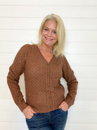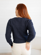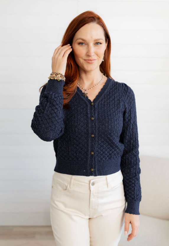 The Rose Button Pointelle Cardigan is all things soft, sweet, and timeless. Designed in a delicate pointelle knit, it features romantic rose-shaped buttons down the front and a flattering V-neckline that pairs beautifully with your favorite camis and dresses. Ribbed trim and gently puffed shoulders complete the feminine, vintage-inspired silhouette.
