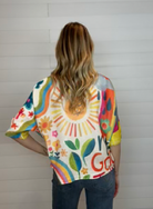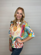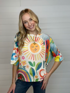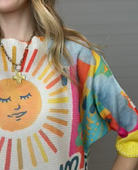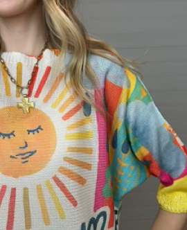 Bright, playful, and full of personality, this graphic knit top features a colorful sunshine and rainbow print that brings a fun, cheerful vibe to your wardrobe. The lightweight knit fabric and relaxed silhouette make it an easy, comfortable piece for everyday wear