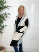 The Square Colorblock Notch Collar Coatigan blends the polish of a coat with the comfort of your favorite sweater. With its longline silhouette and soft, structured lapels, it’s the perfect throw-on-and-go piece for cooler days. The body features a patchwork of colorblocked squares, adding visual interest and a modern edge, while the solid grey collar ties it all together beautifully.