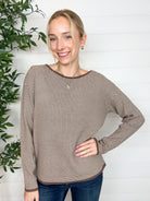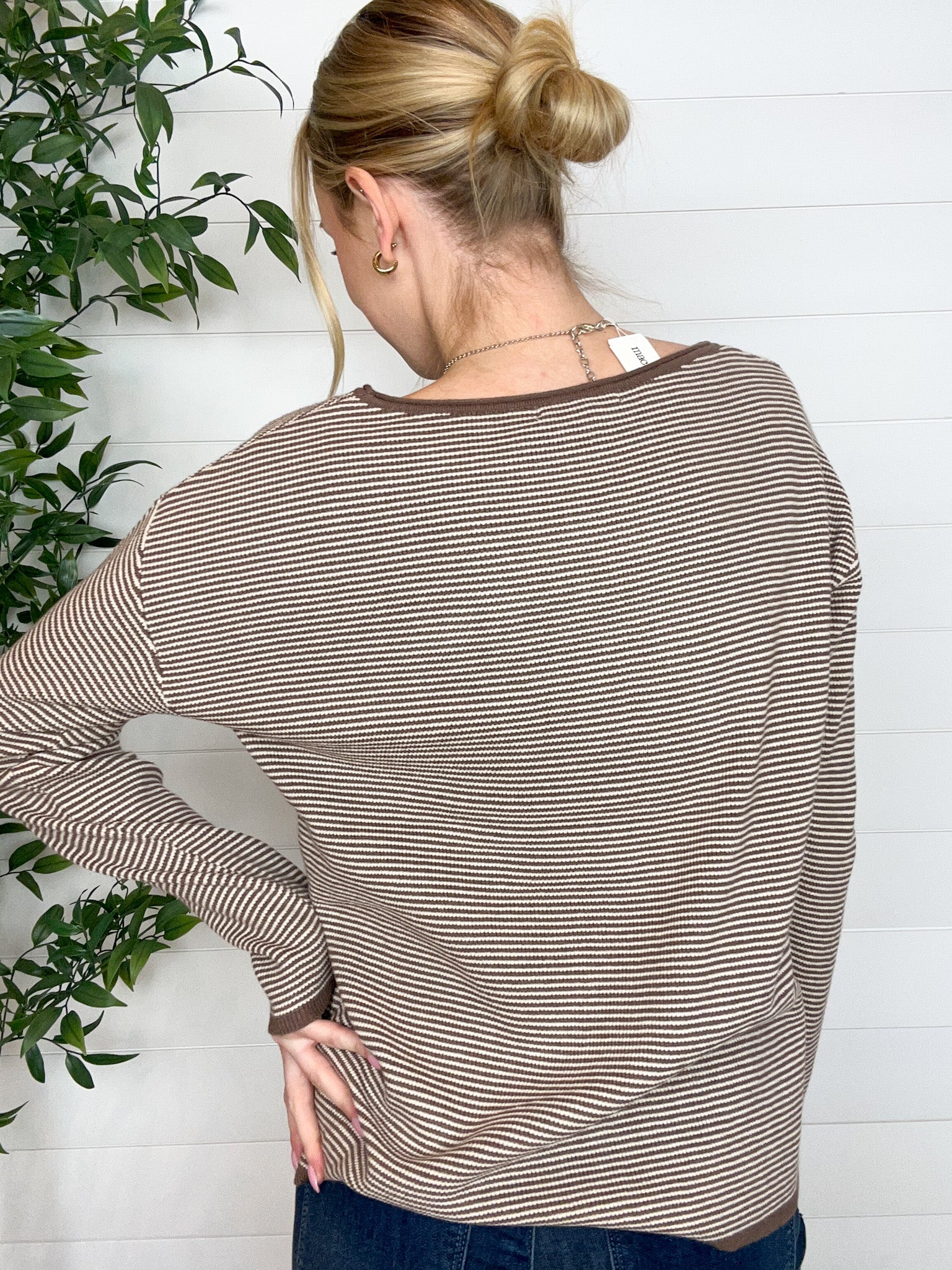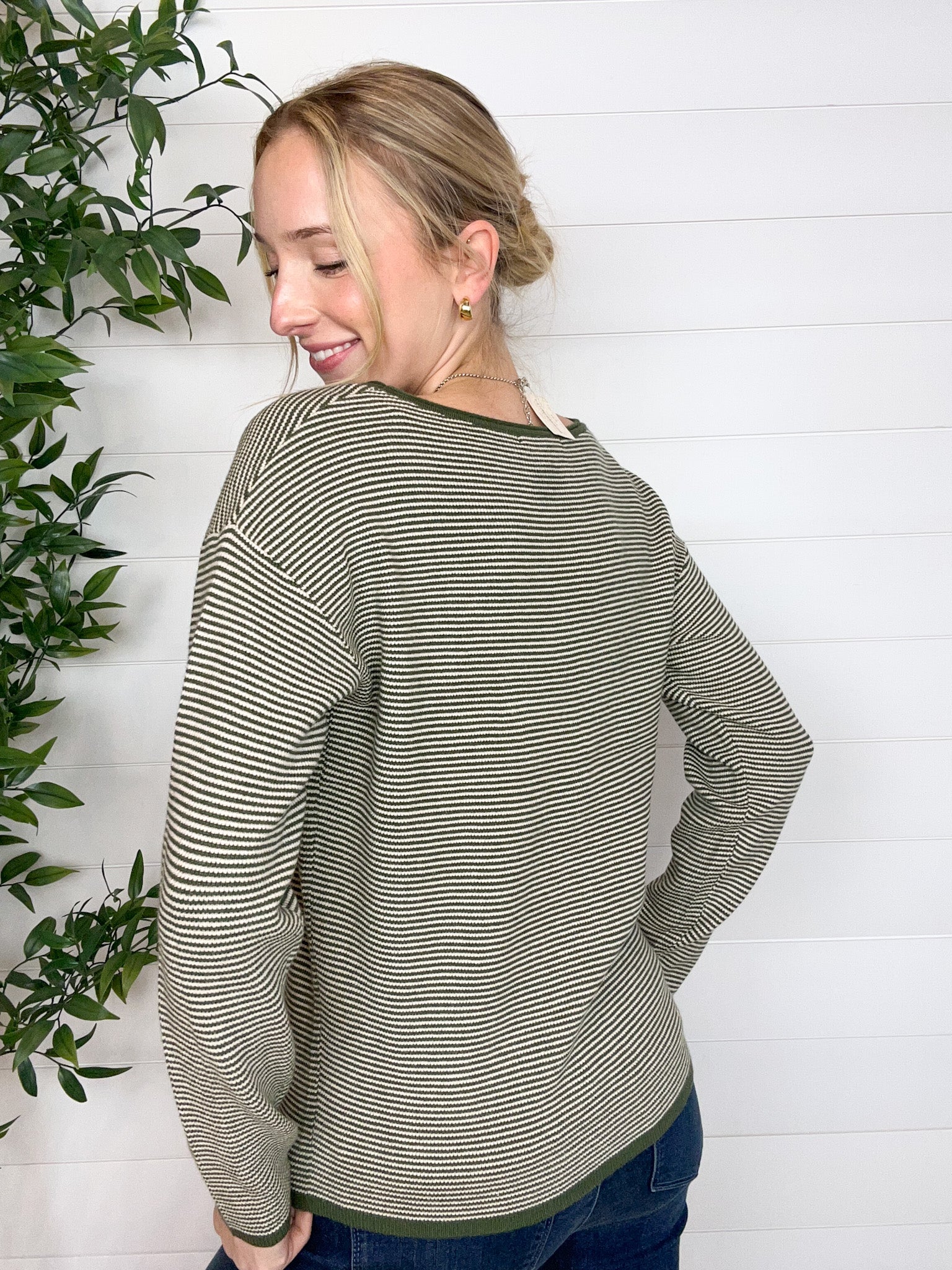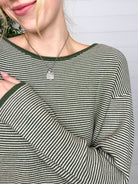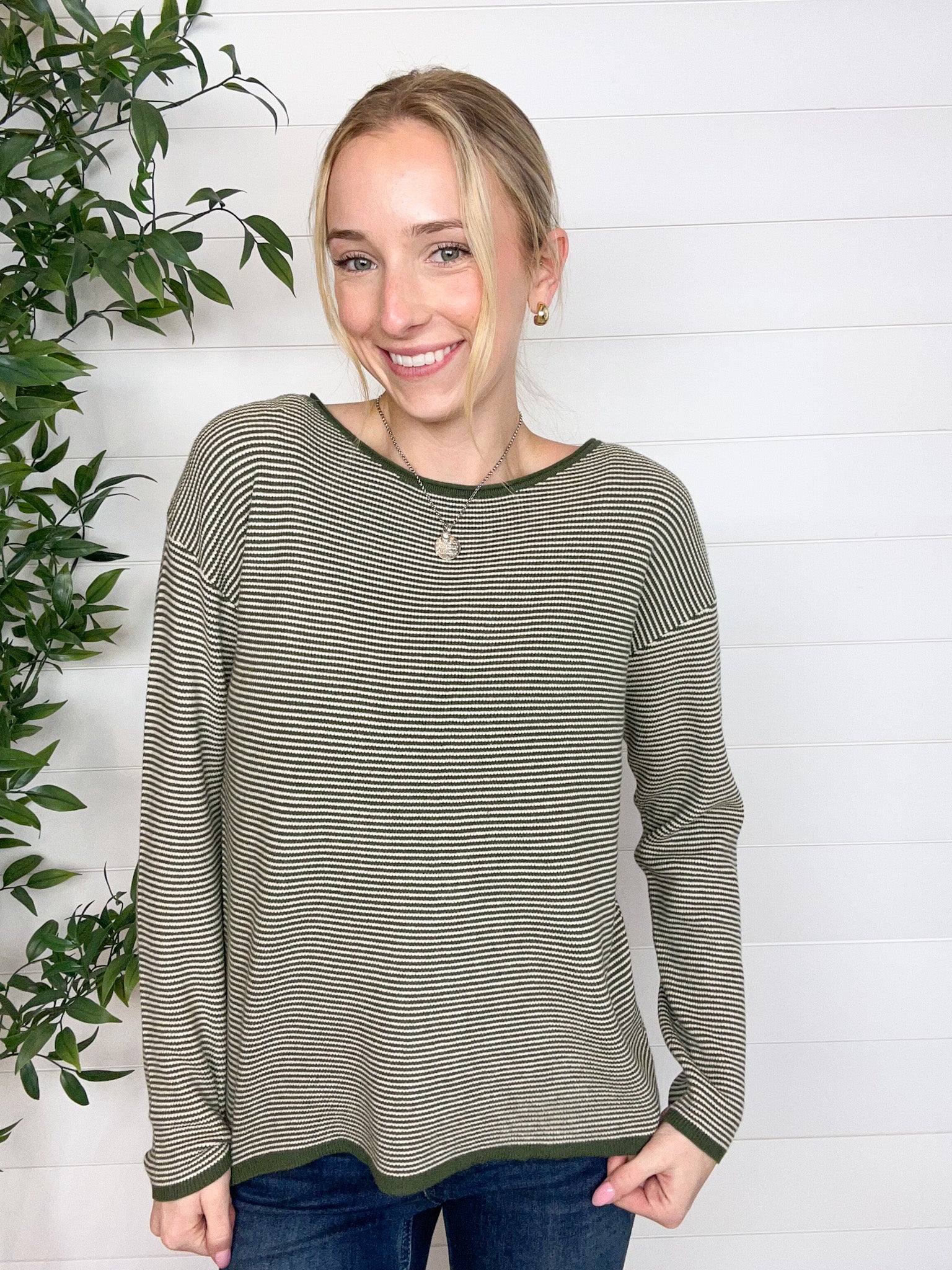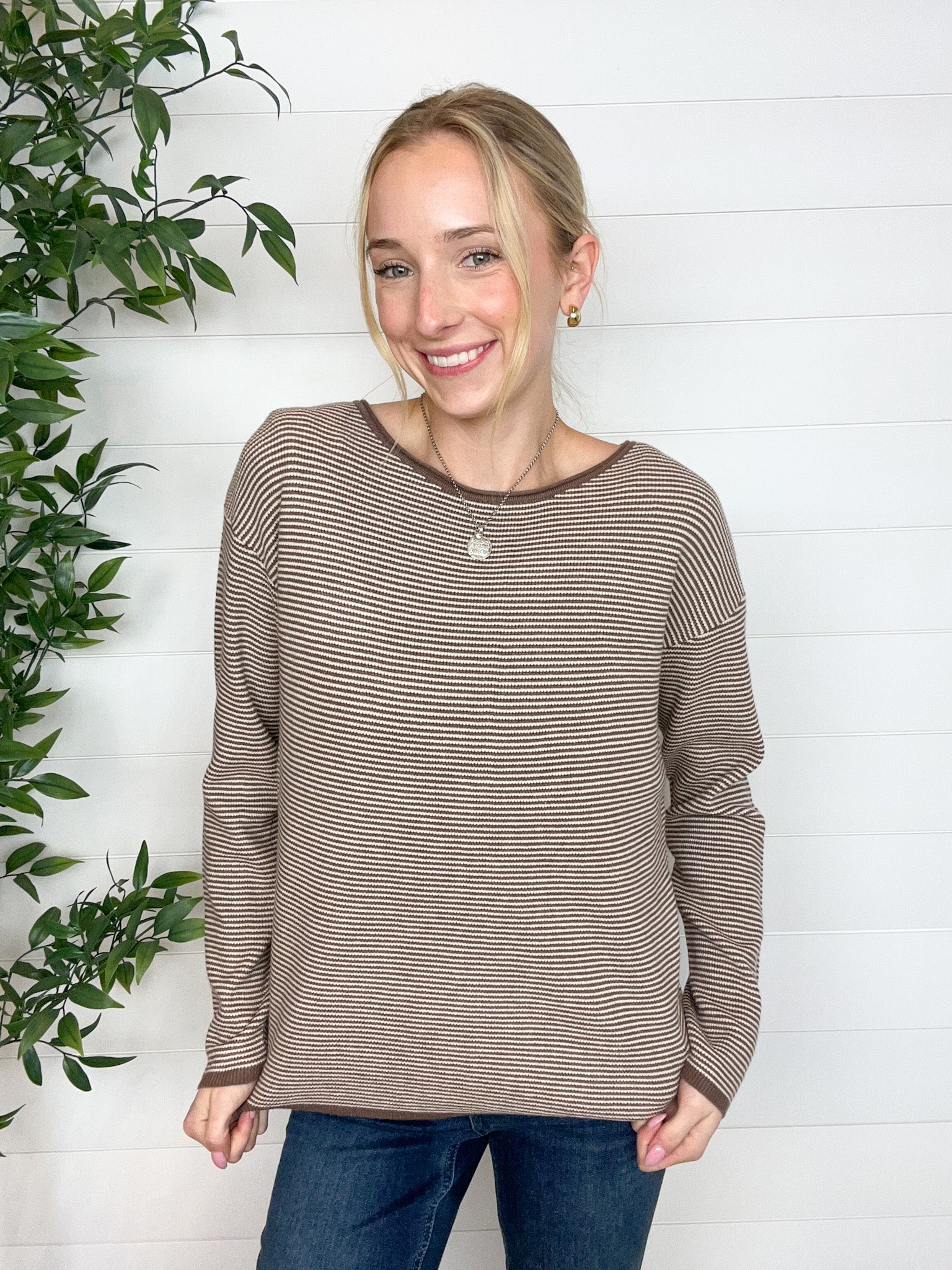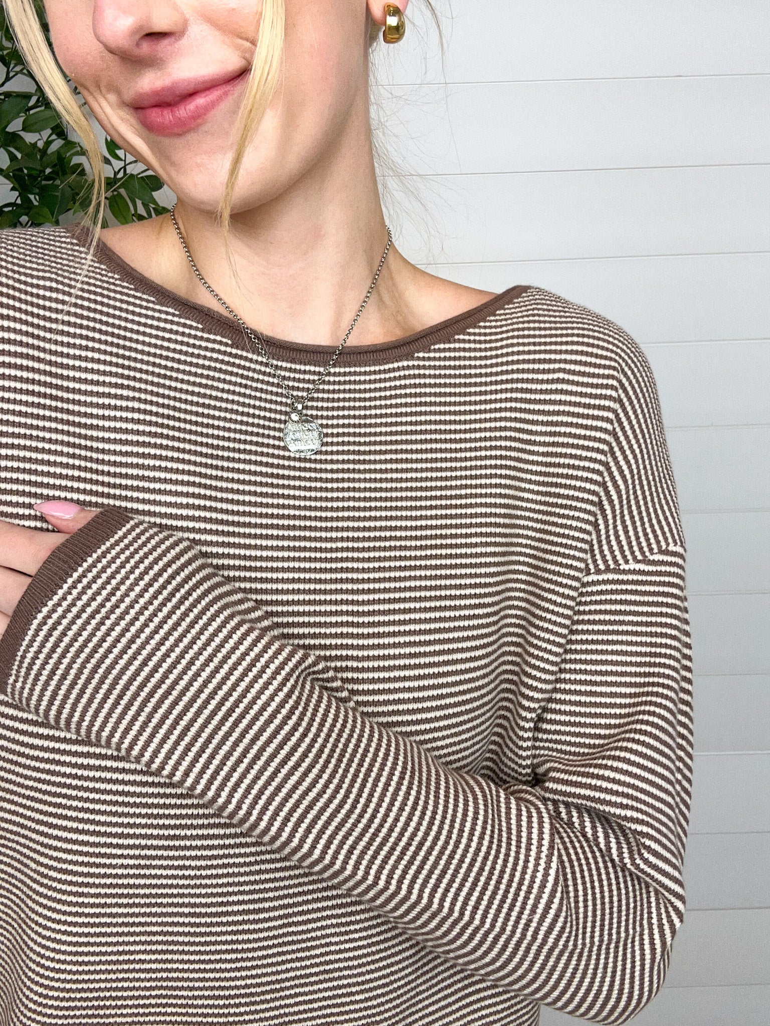 This sweater is an easygoing essential with subtle standout details. Made from a lightweight viscose-nylon blend, it features fine horizontal pinstripes with slightly wider contrast stripes at the hem and neckline for visual interest. A rolled hem crew neckline adds a relaxed finish to this ultra-soft, everyday favorite.